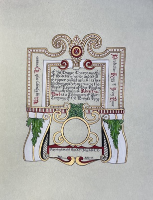 To see all of her scrolls in the order they were created, her blank scrolls for "battle scribing", and her additional A & S projects - visit Aliyah's Online Portfolio of the Arts & Sciences.