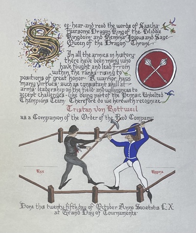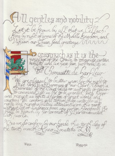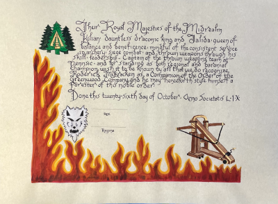 The SCA has a tradition of the giving of illuminated manuscripts for their awards. (The Middle Kingdom - Midrealm provides a scroll with each award bestowed by the Crown.) Examples of these produced by the hand of Baroness Alianor bat Asriel (known as Lady Aliyah) and The Honorable Lady SaehildR barngodR are below: