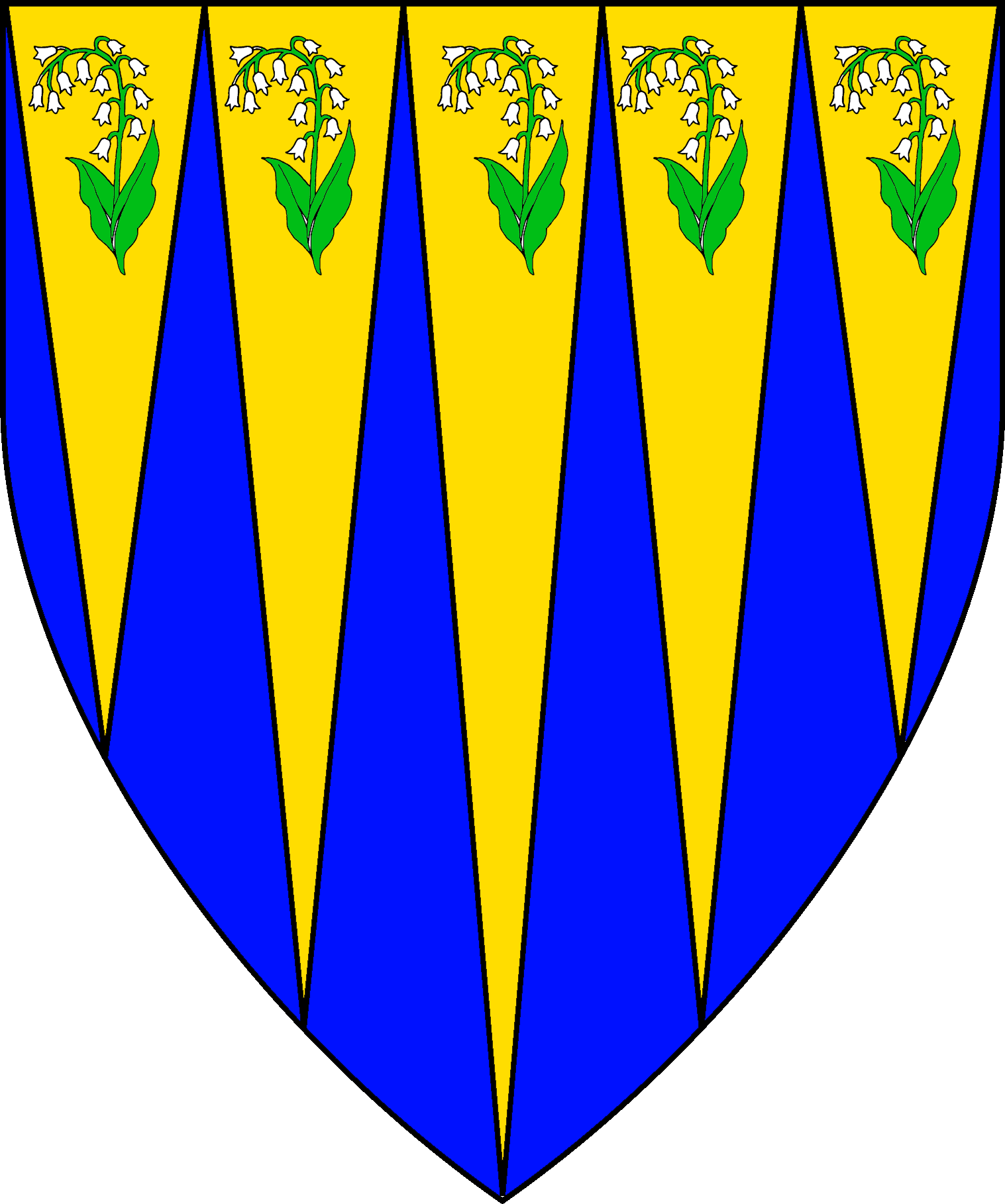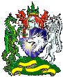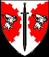 Blazon : Argent, a sword inverted Sable between flaunches embattled Gules, each charged with a wolf's head erased argent