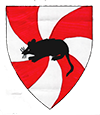 Blazon : Gyronny arrondi gules and argent, a rat statant sable