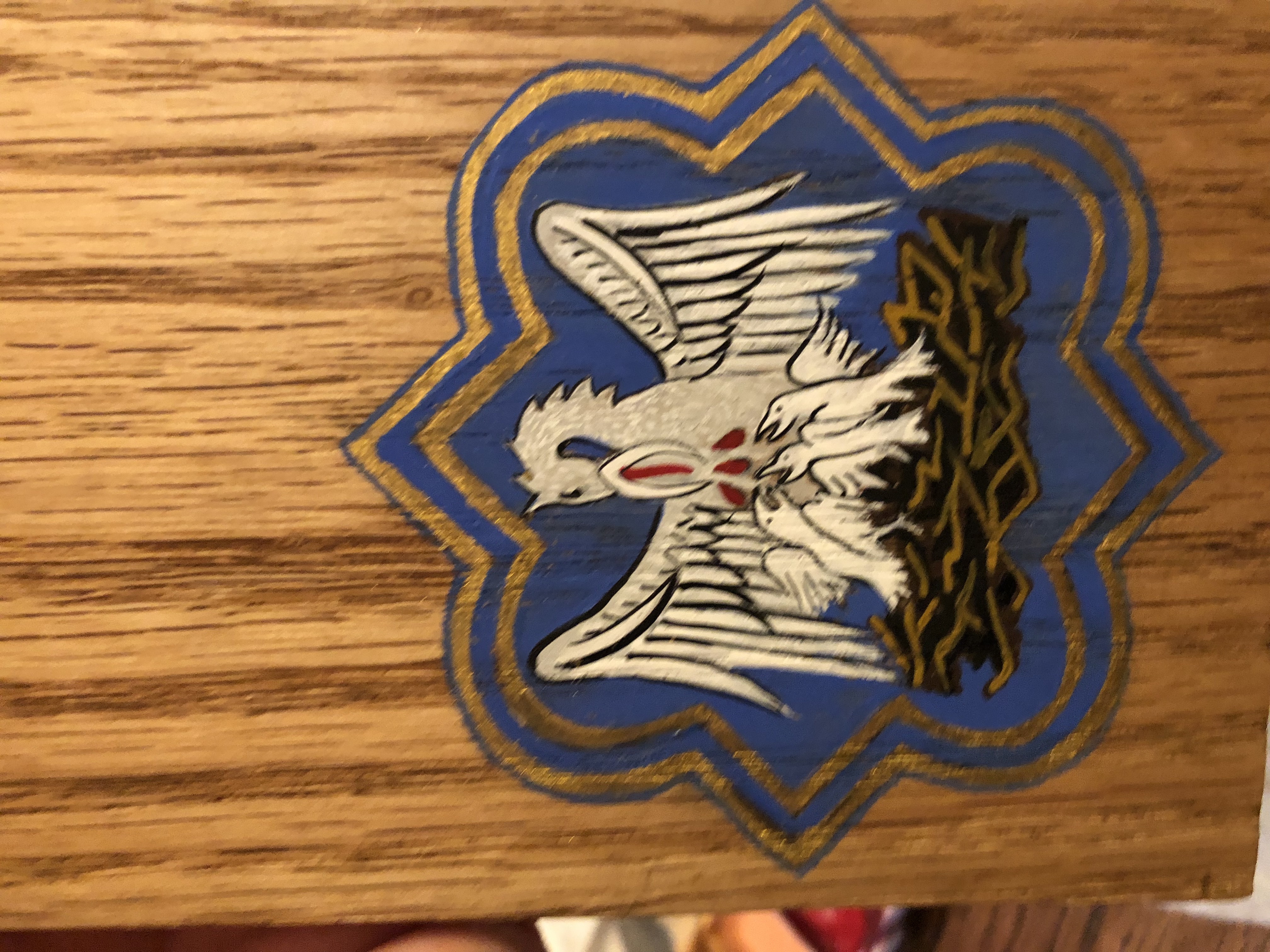 The scroll text is on the top of the box with the heraldry