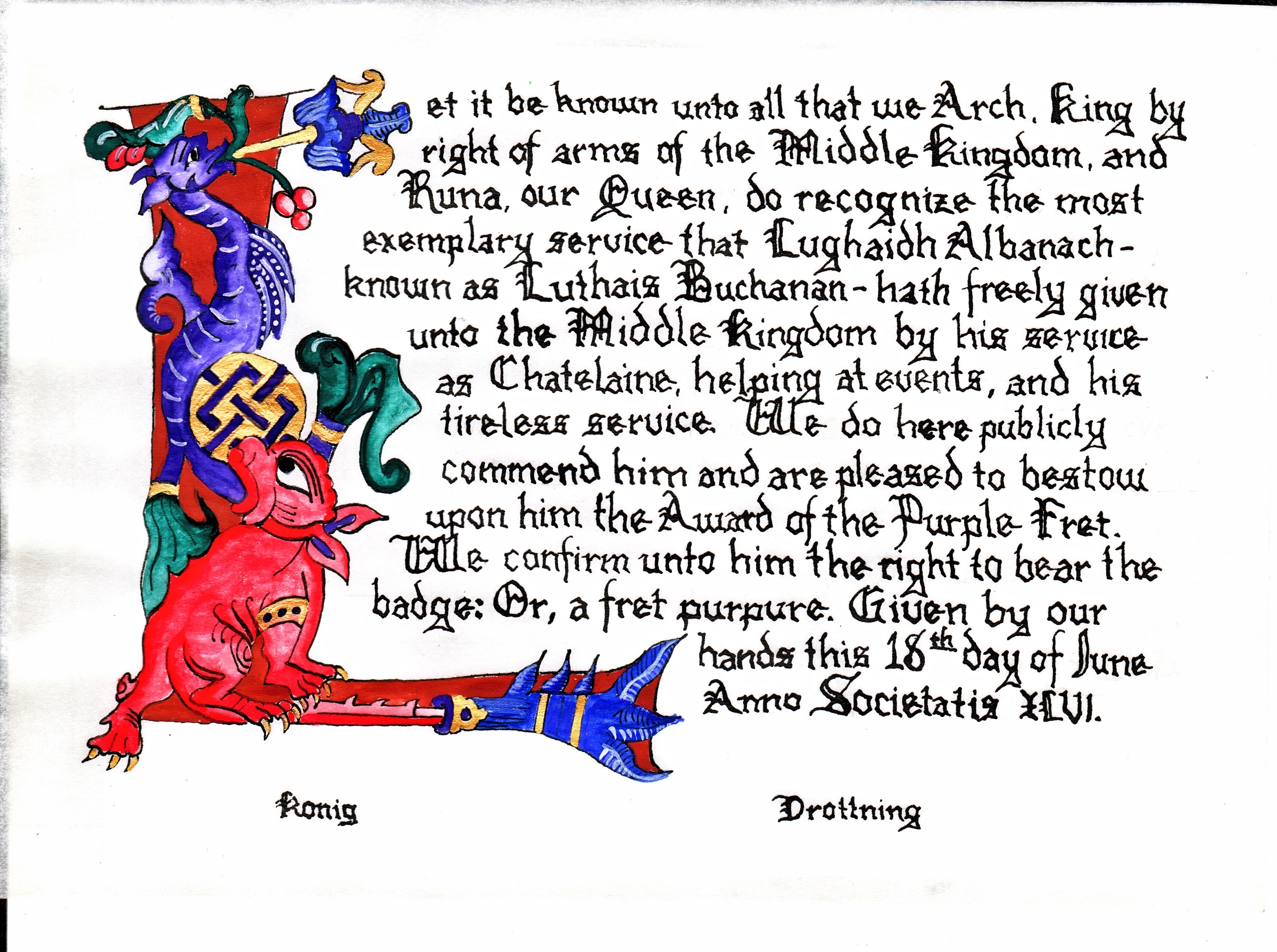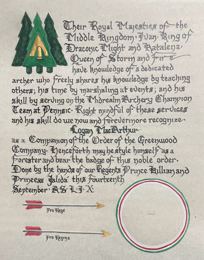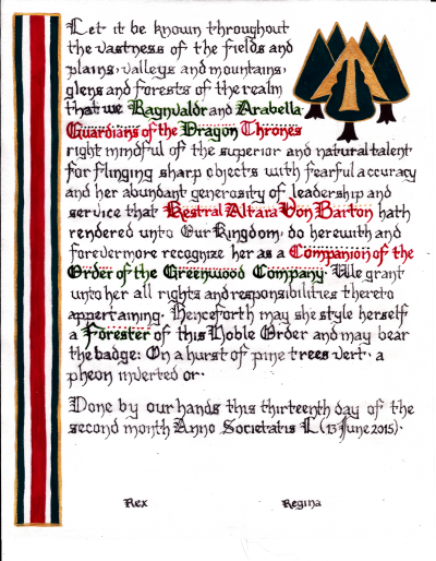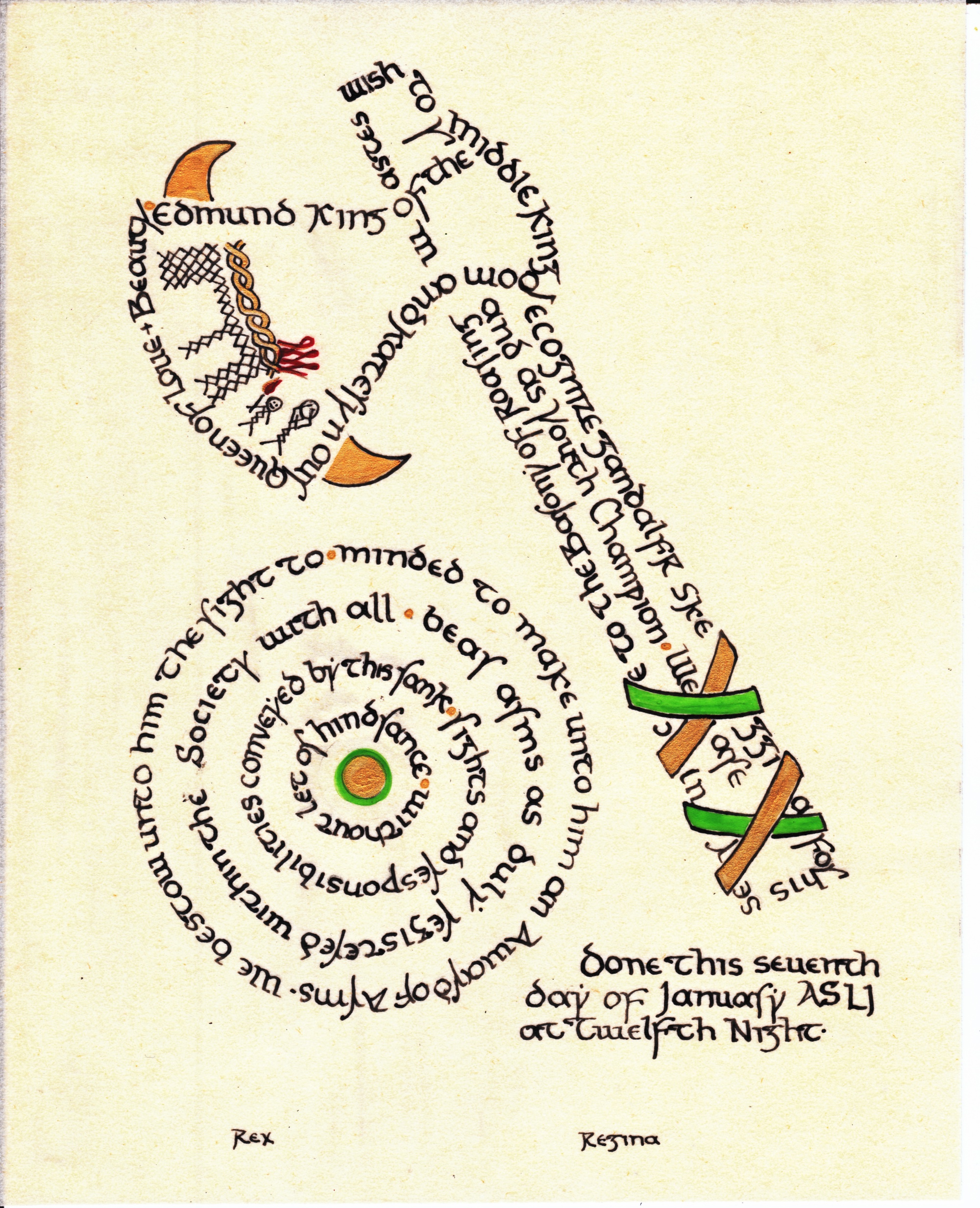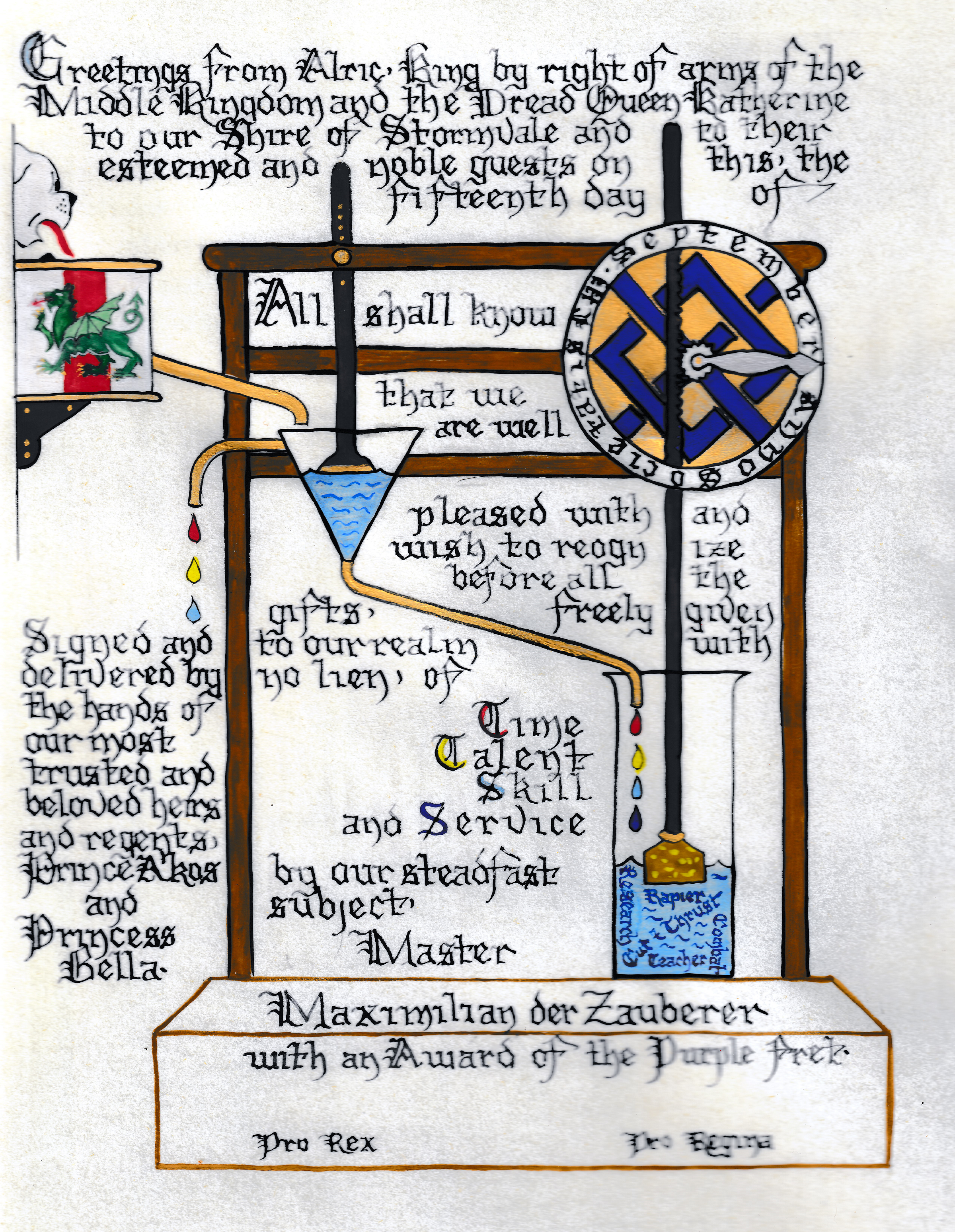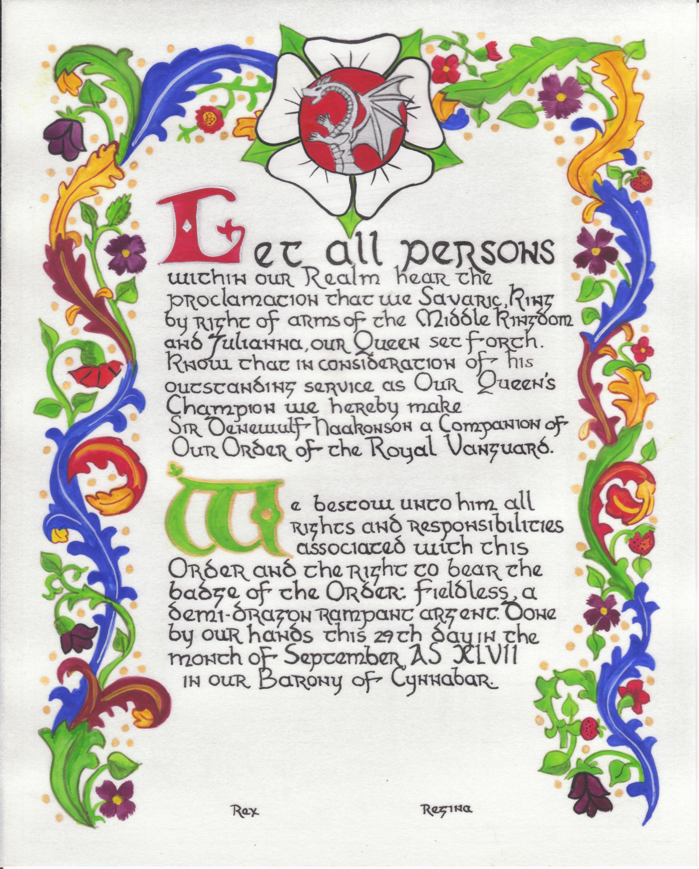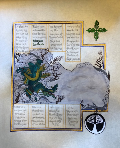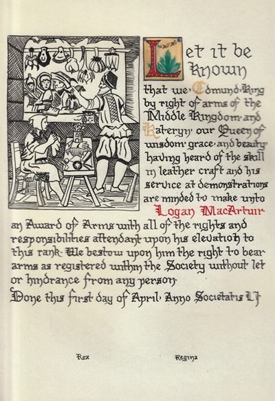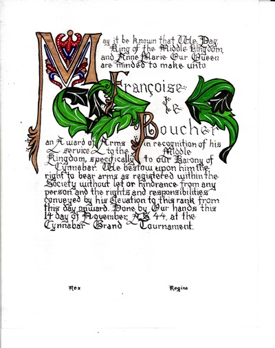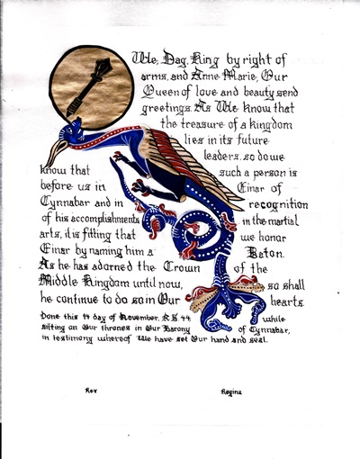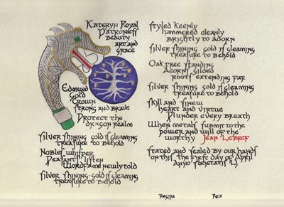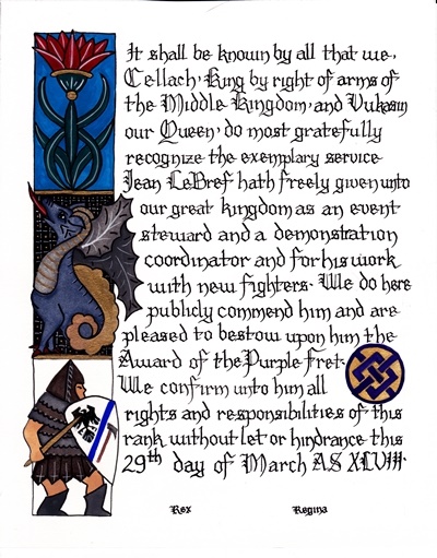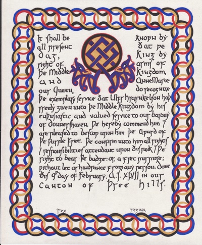 The tradition of using illumination and hand written documents continues today in special documents such as in the forms of wedding and event invitations, font design/ typography, original hand-lettered logo design, religious art, various announcements/ graphic design/ commissioned calligraphic art, cut stone inscriptions and memorial documents. (See http://www.saintjohnsbible.org/ for a modern illuminated hand written Bible in process.) The SCA continues this tradition in the use of illuminated manuscripts for their awards. (The Middle Kingdom - Midrealm provides a scroll with each award bestowed by the Crown. Examples of these are below organzied by award done by the hand of our resident scribes.)