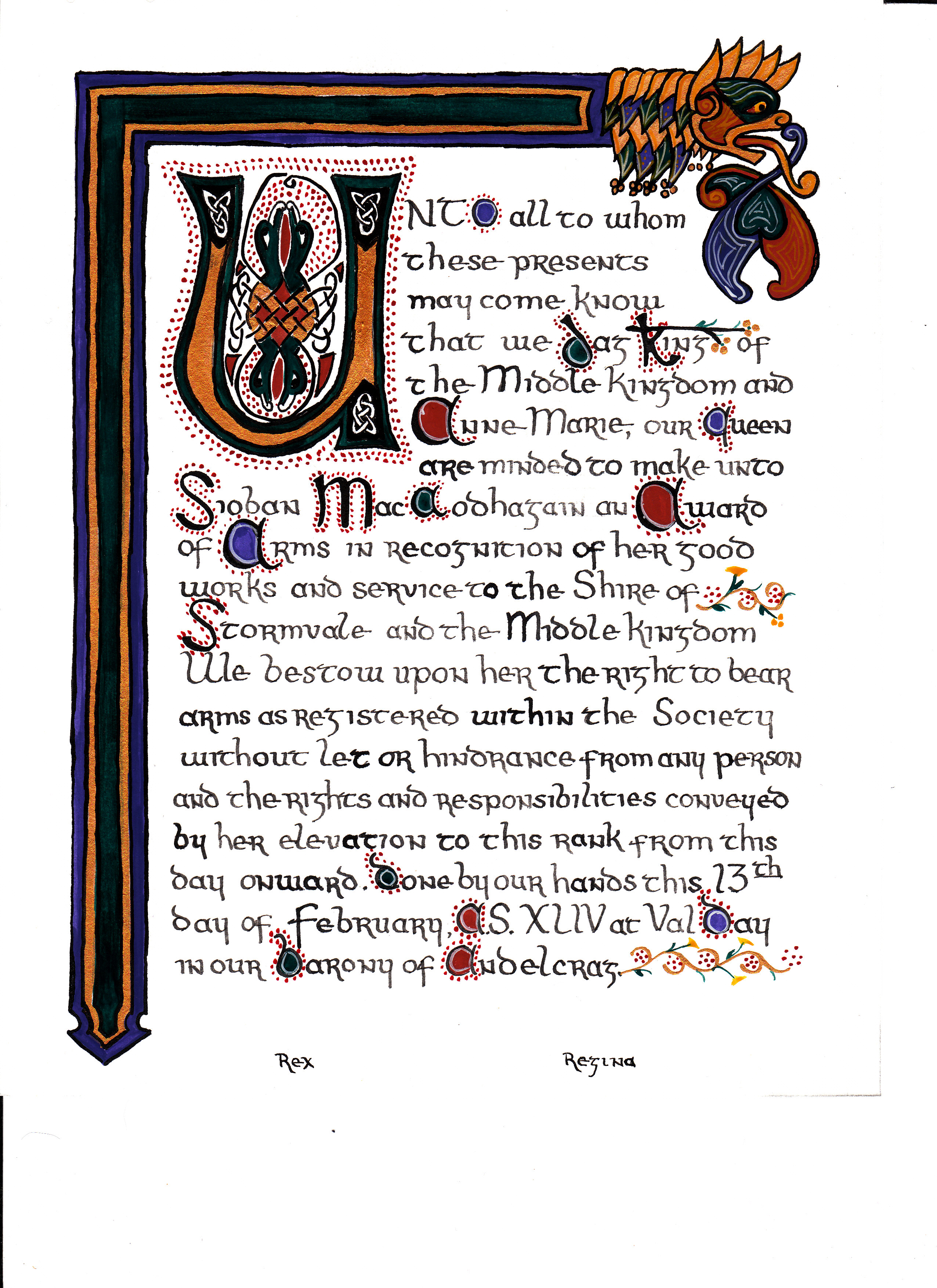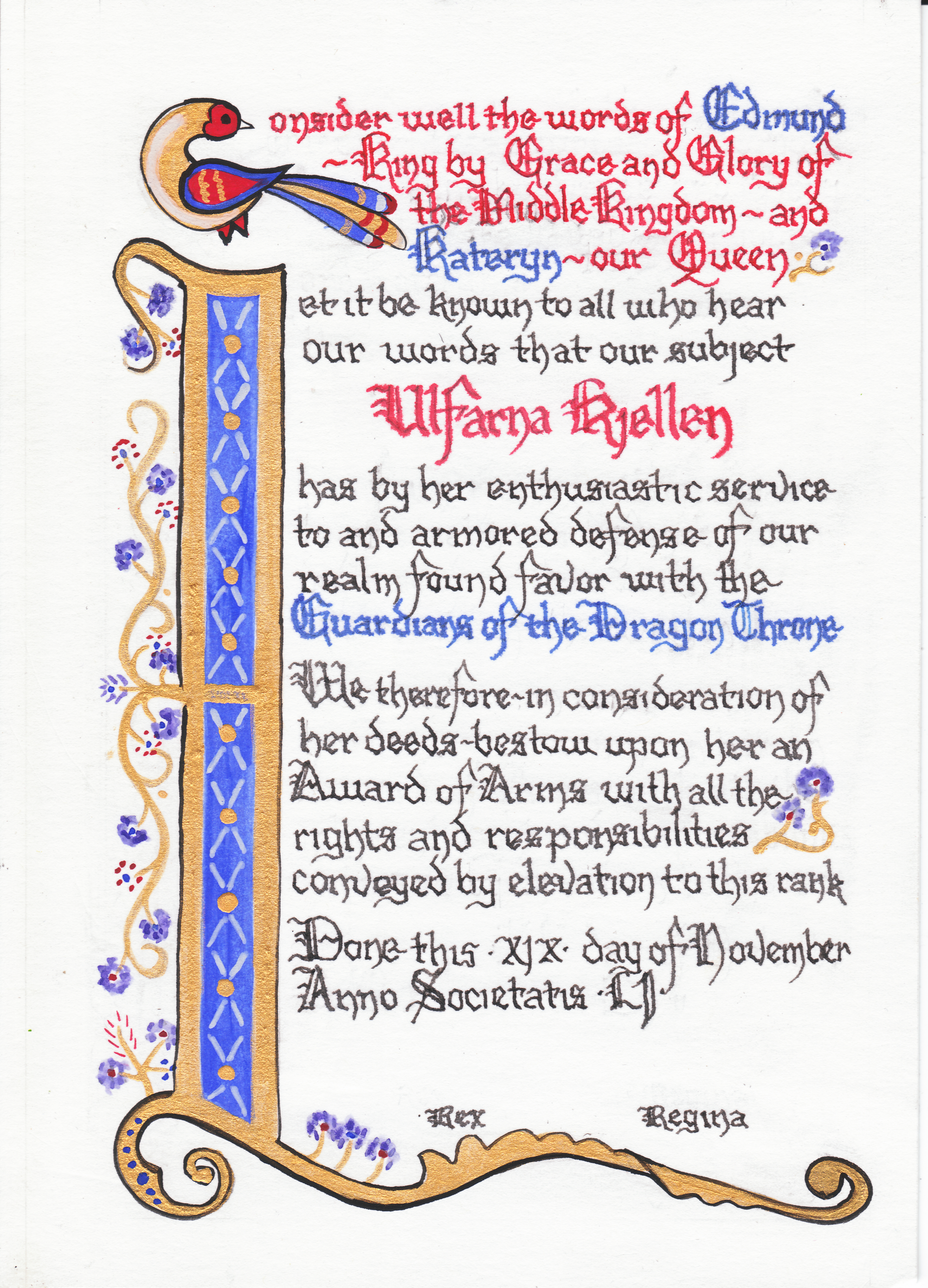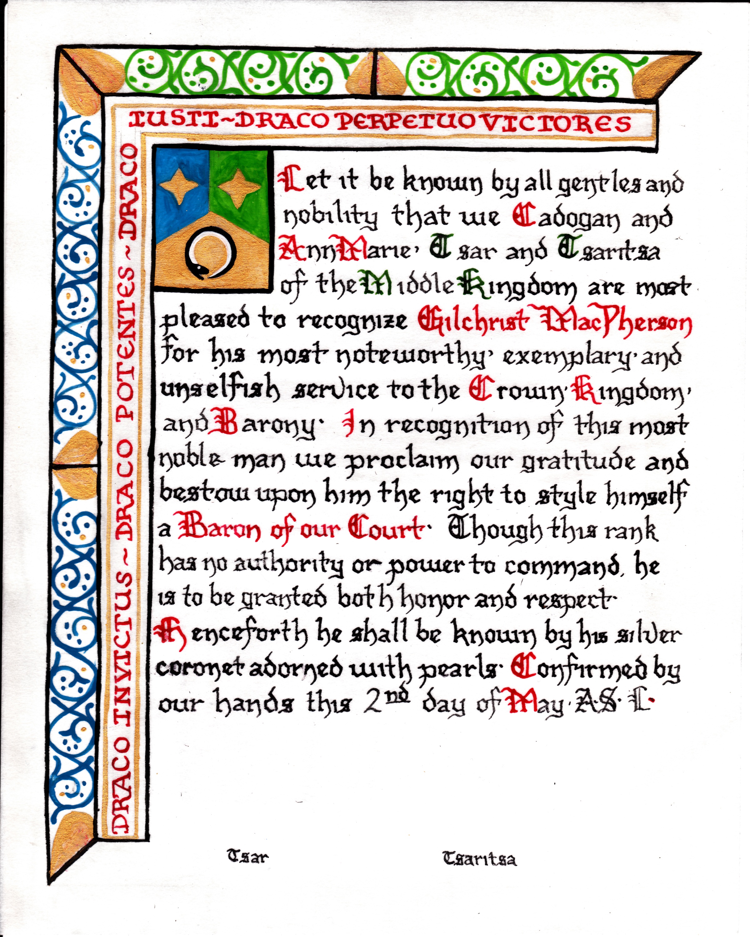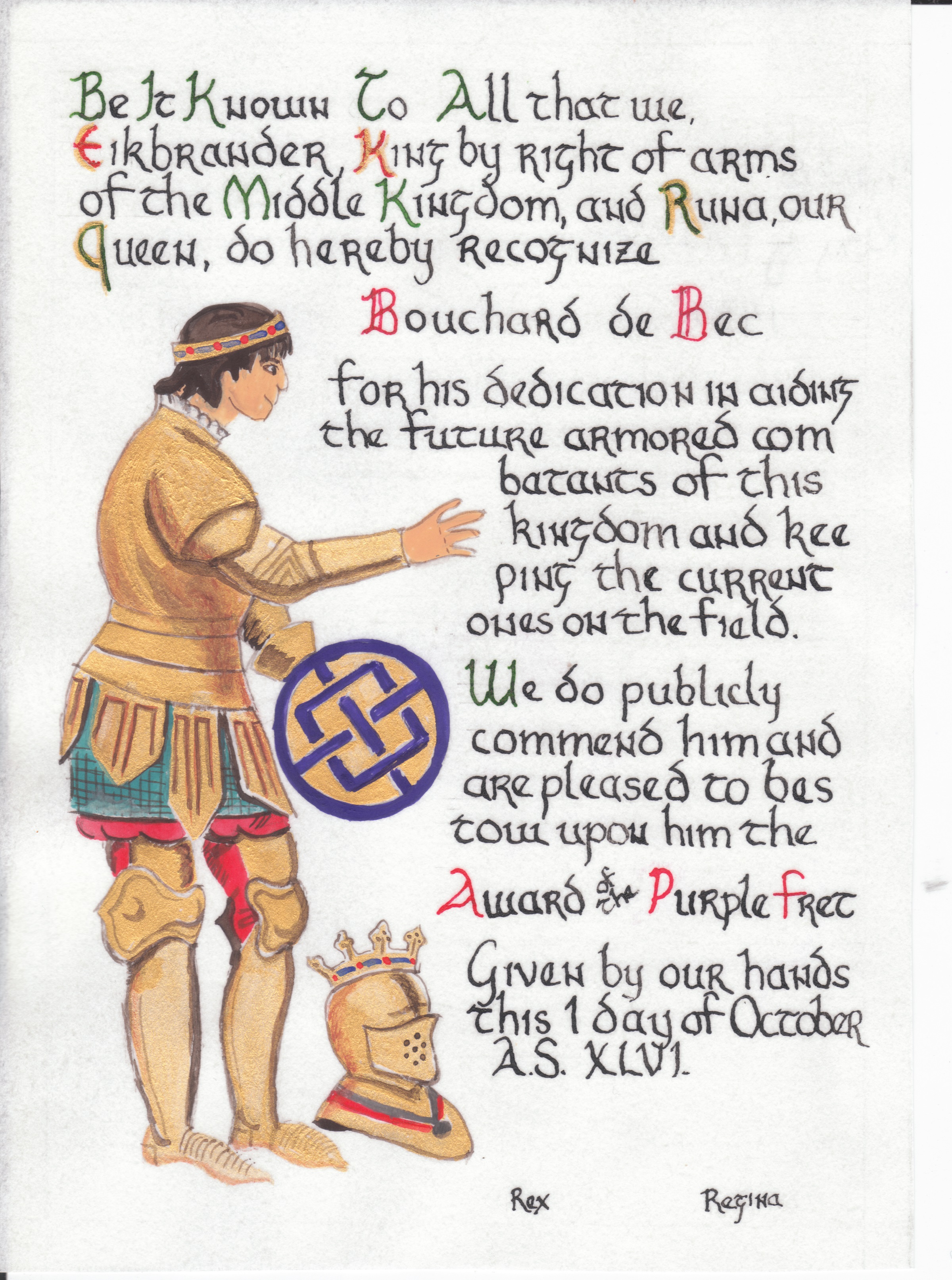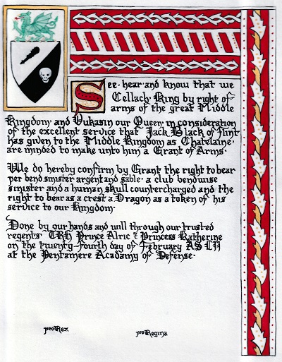 The tradition of using illumination and hand written documents continues today in special documents such as in the forms of wedding and event invitations, font design/ typography, original hand-lettered logo design, religious art, various announcements/ graphic design/ commissioned calligraphic art, cut stone inscriptions and memorial documents. (See http://www.saintjohnsbible.org/ for a modern illuminated hand written Bible in process.) The SCA continues this tradition in the use of illuminated manuscripts for their awards. (The Middle Kingdom - Midrealm provides a scroll with each award bestowed by the Crown. Examples of these are below organzied by award done by the hand of our resident scribes.)