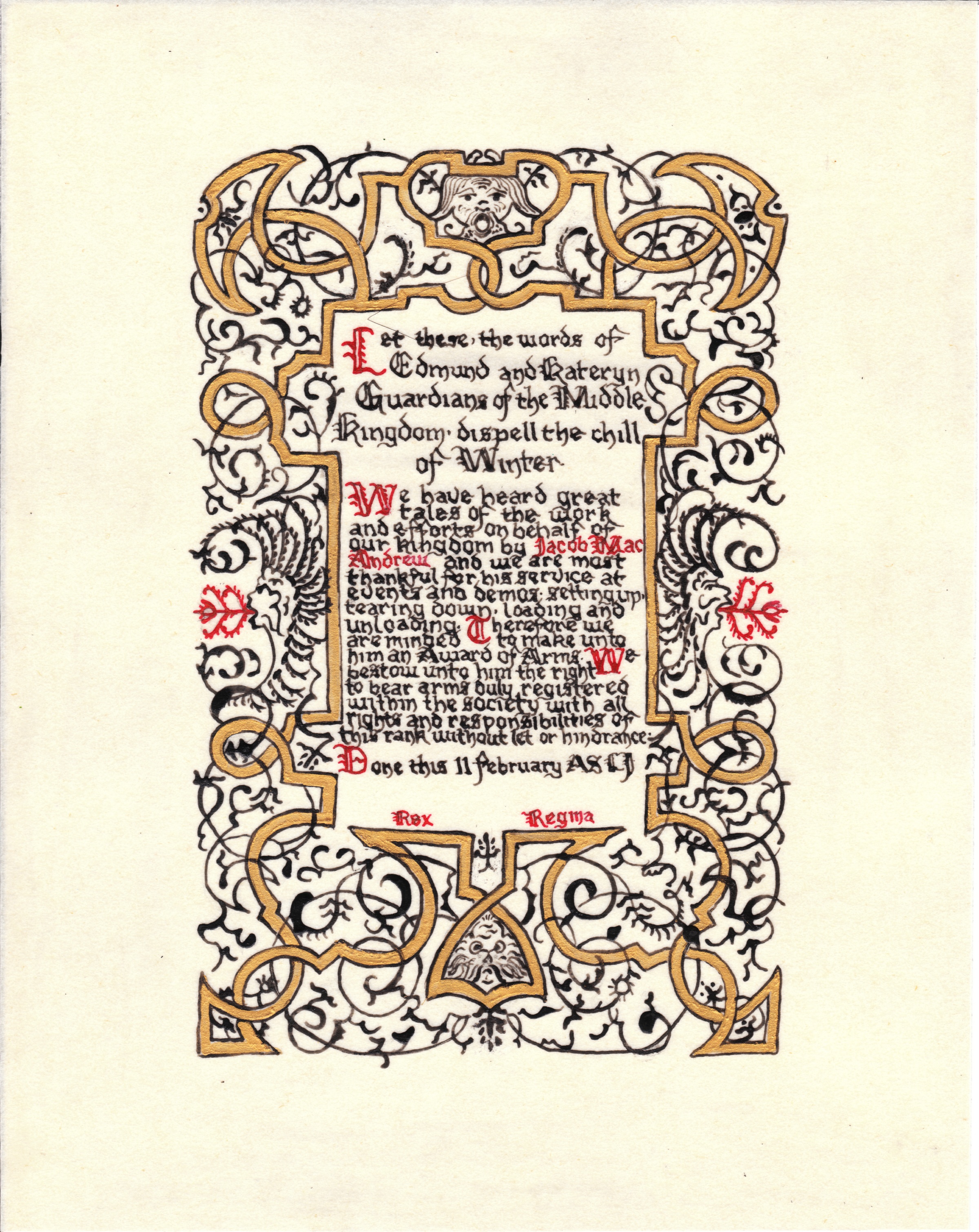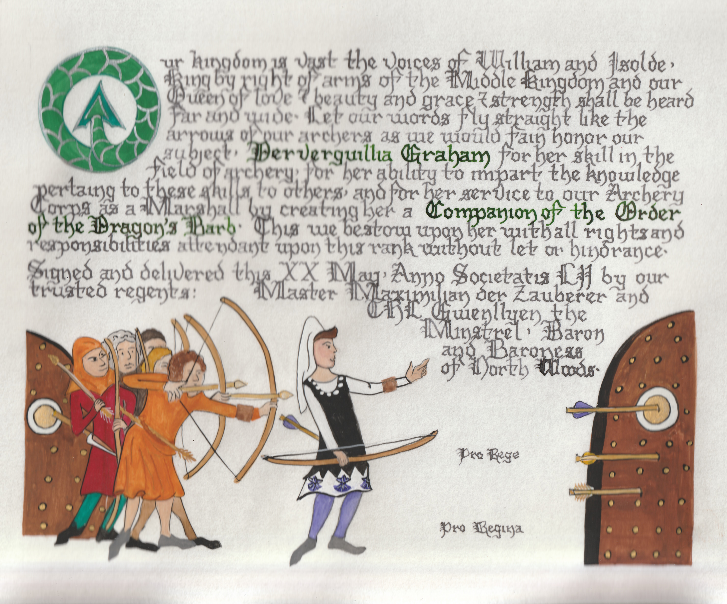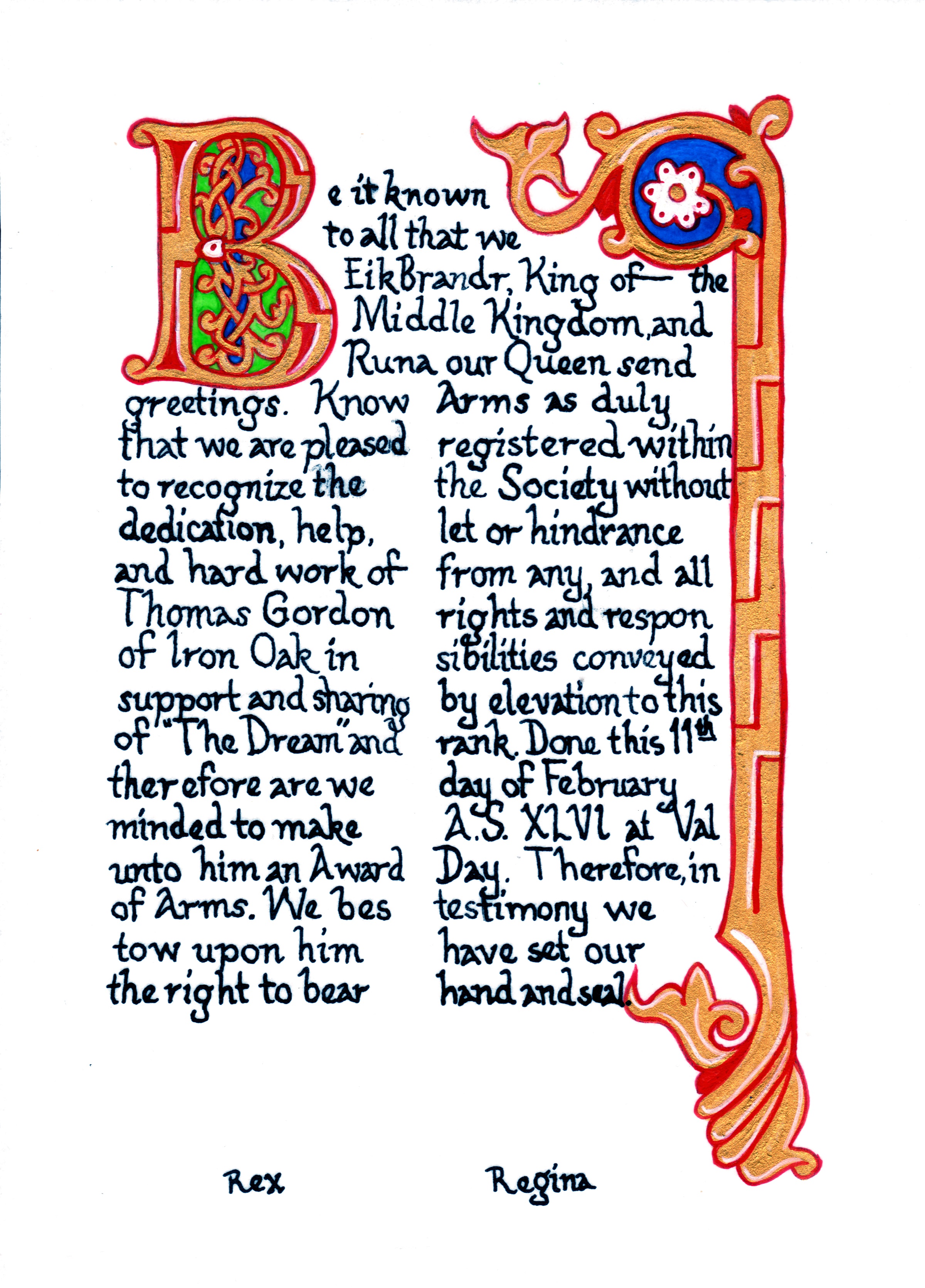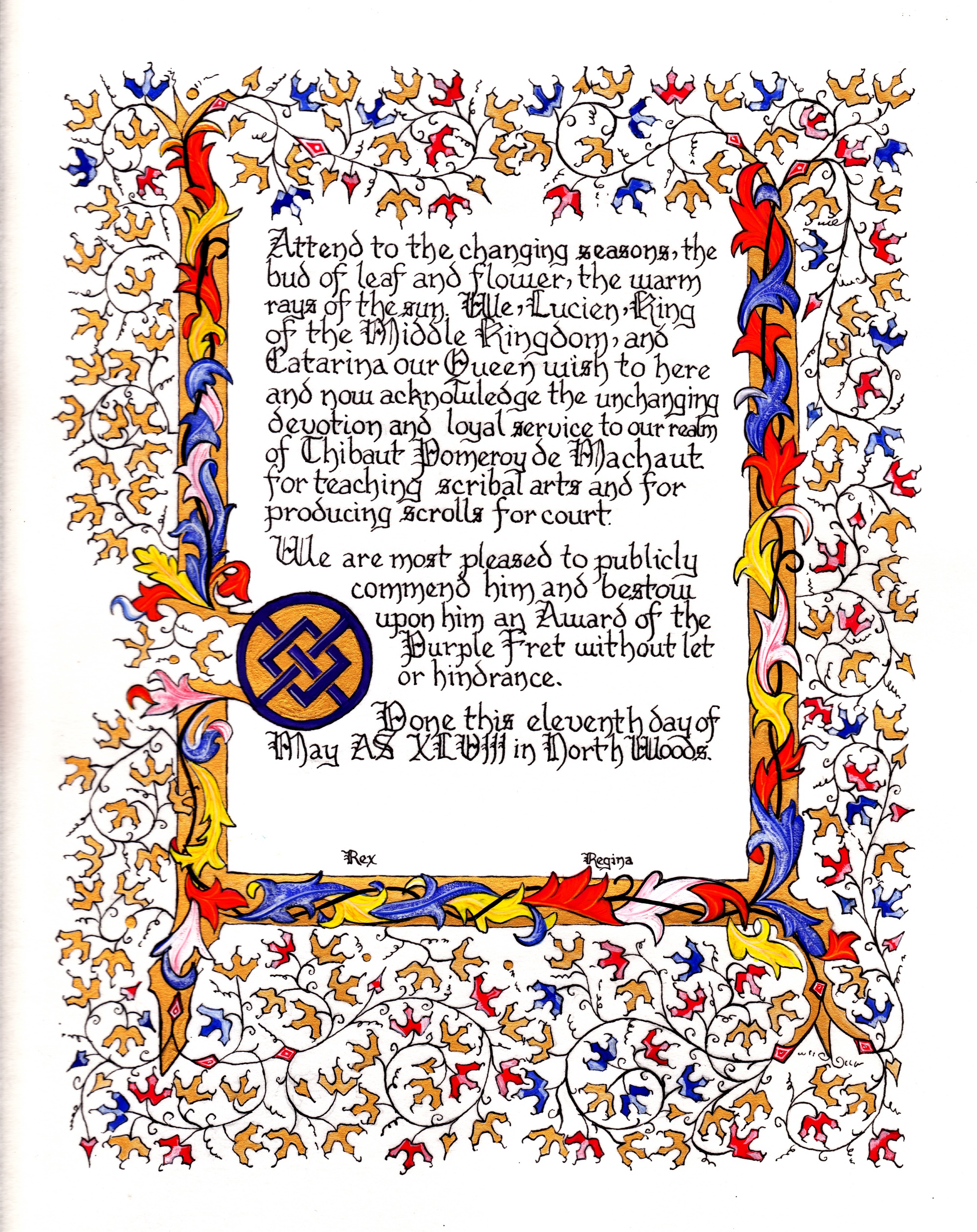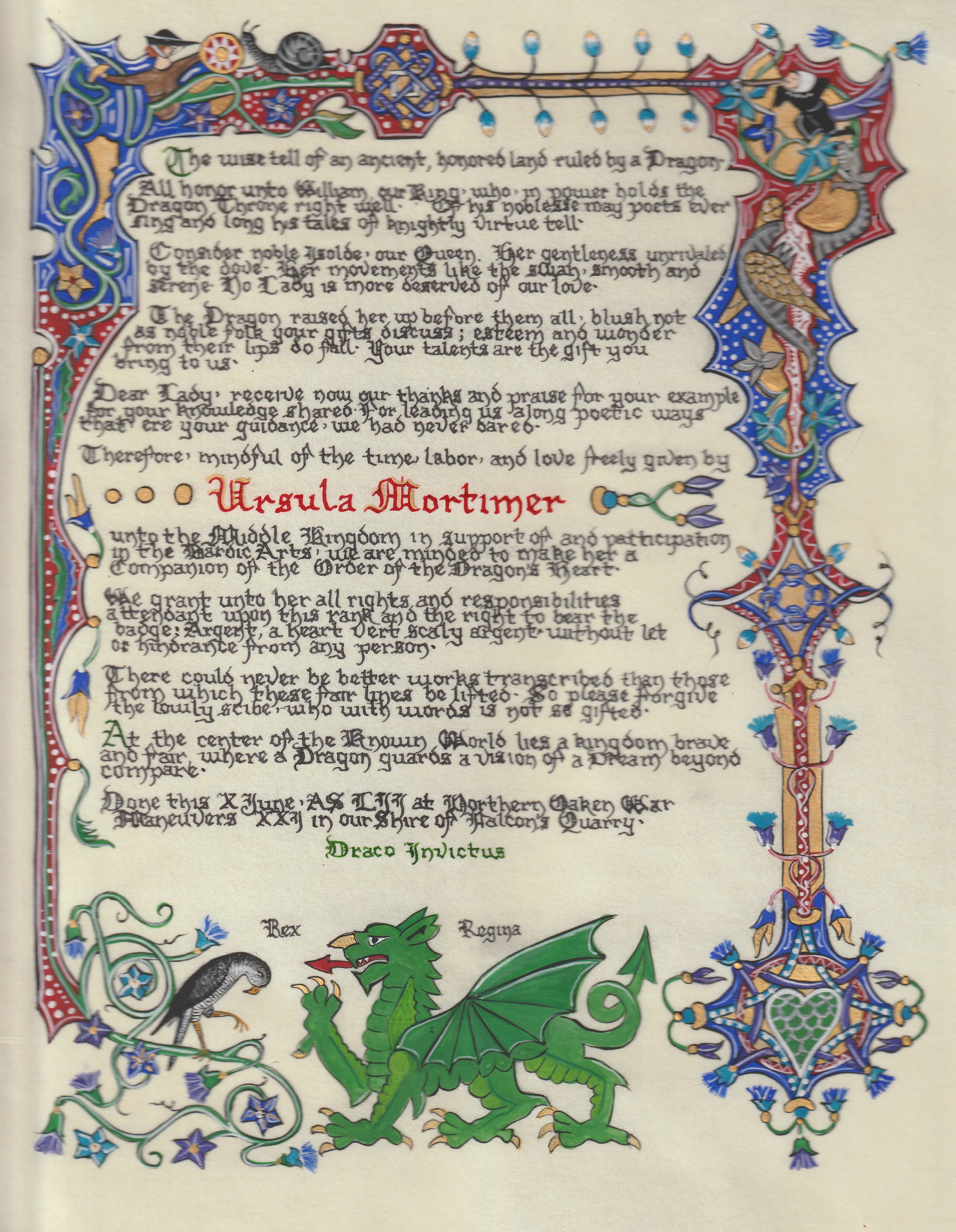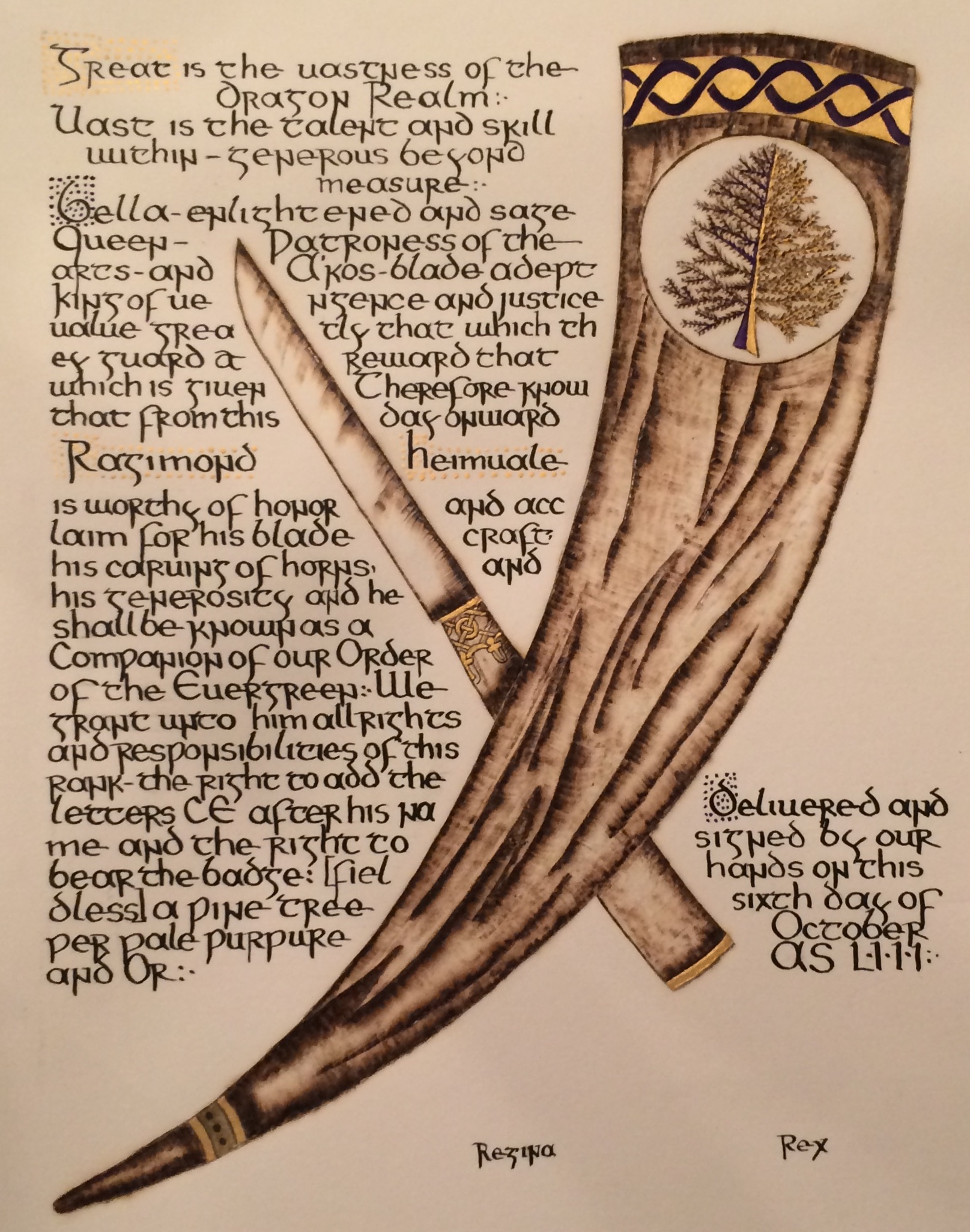 The tradition of using illumination and hand written documents continues today in special documents such as in the forms of wedding and event invitations, font design/ typography, original hand-lettered logo design, religious art, various announcements/ graphic design/ commissioned calligraphic art, cut stone inscriptions and memorial documents. (See http://www.saintjohnsbible.org/ for a modern illuminated hand written Bible in process.) The SCA continues this tradition in the use of illuminated manuscripts for their awards. (The Middle Kingdom - Midrealm provides a scroll with each award bestowed by the Crown. Examples of these are below organzied by award done by the hand of our resident scribes.)