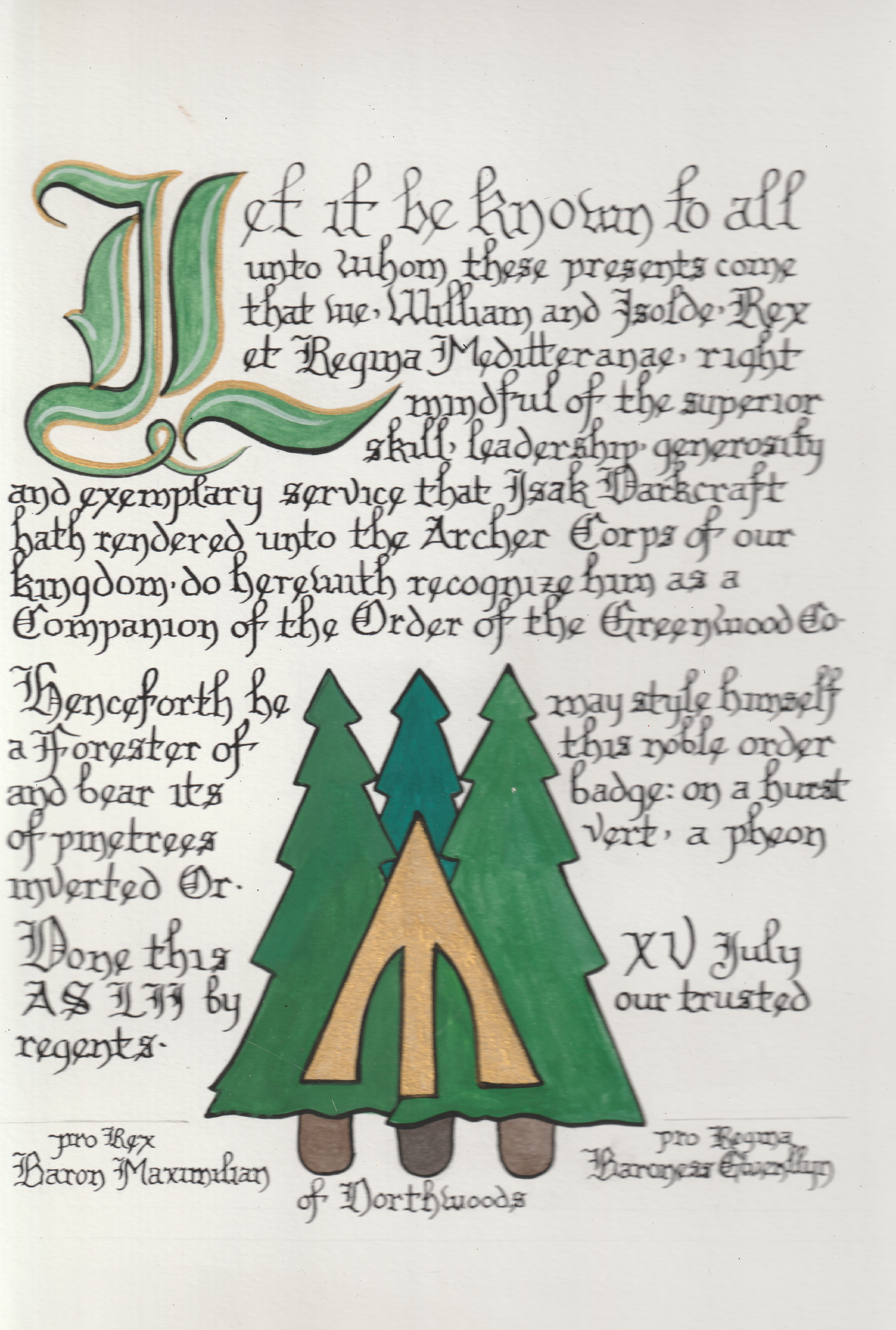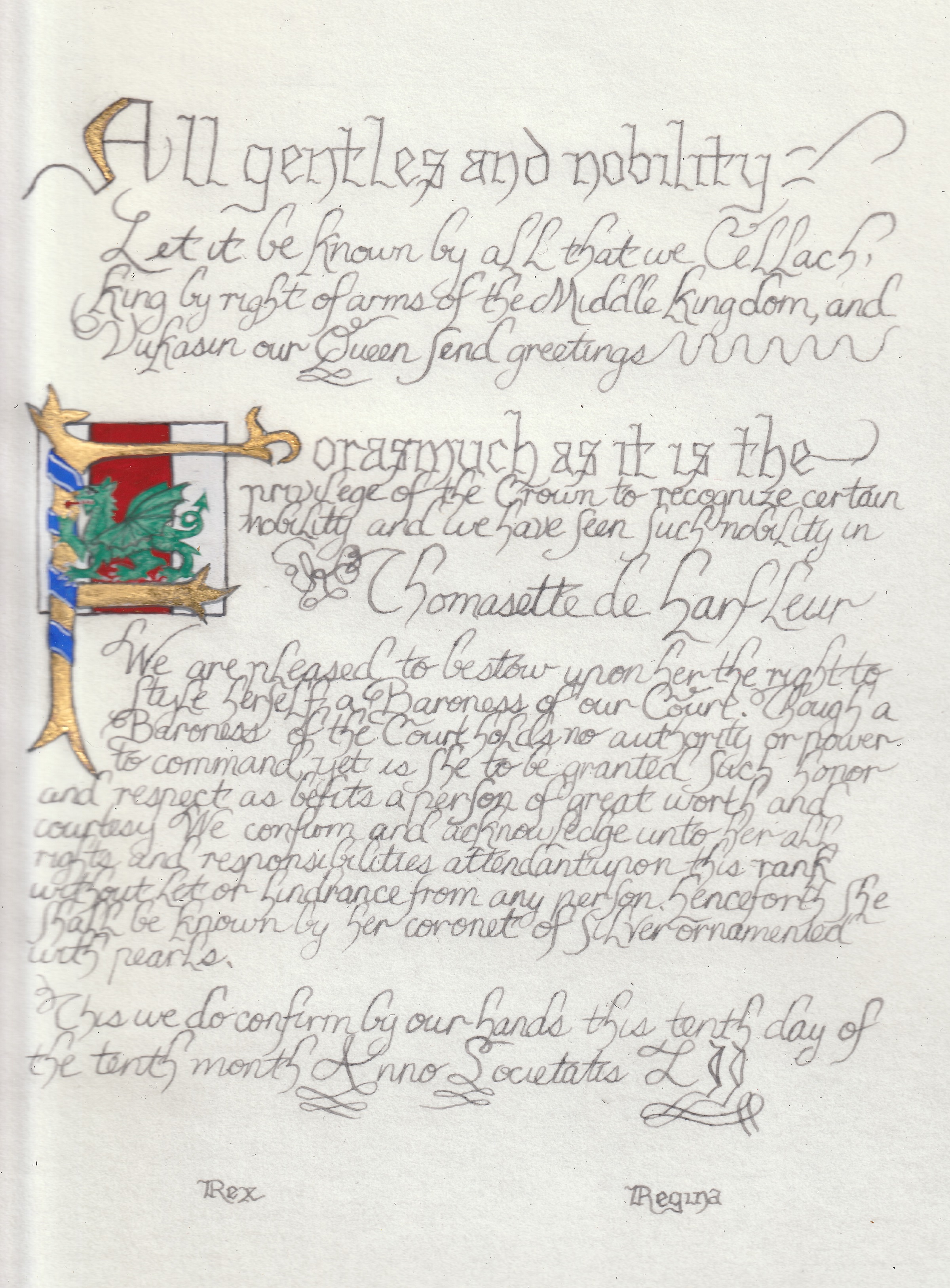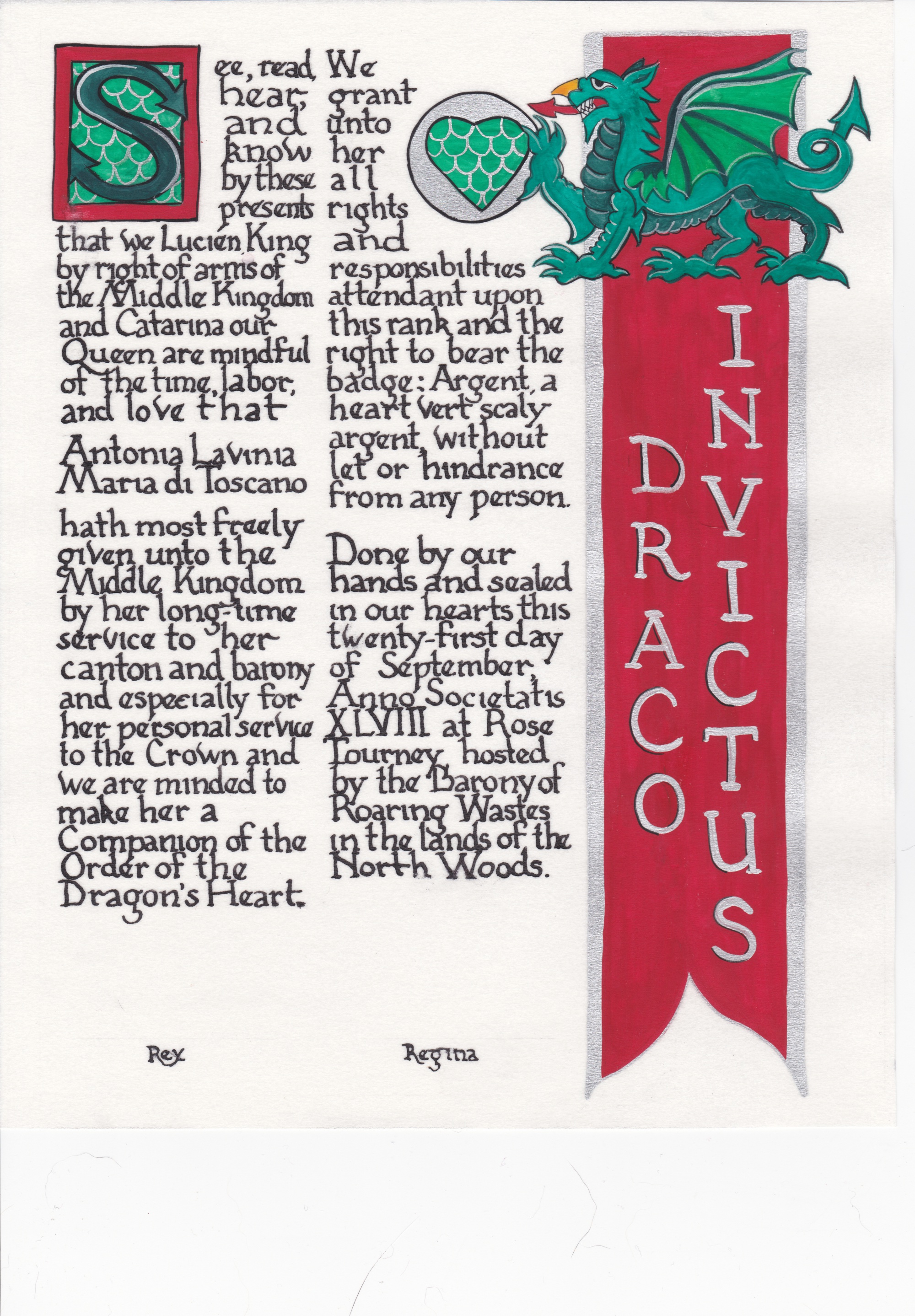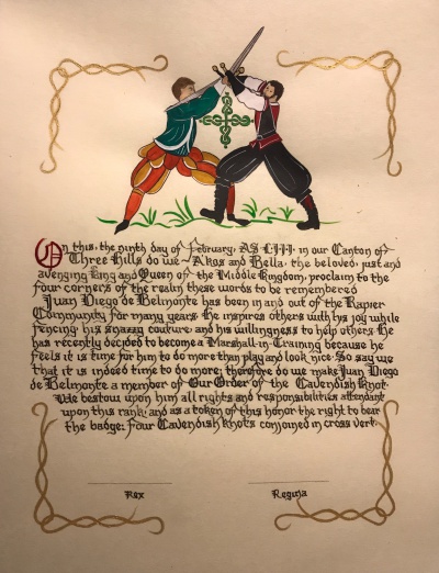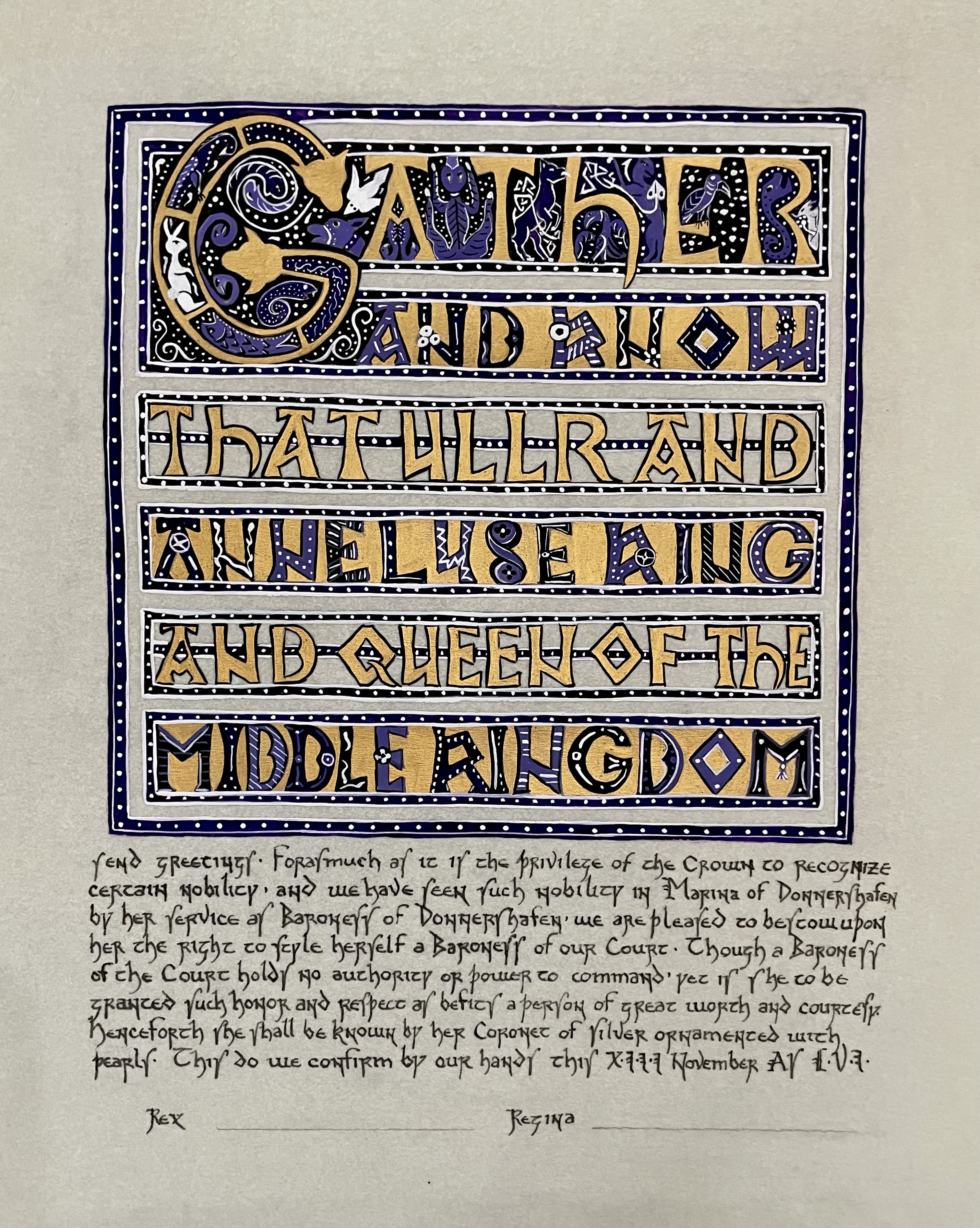 The tradition of using illumination and hand written documents continues today in special documents such as in the forms of wedding and event invitations, font design/ typography, original hand-lettered logo design, religious art, various announcements/ graphic design/ commissioned calligraphic art, cut stone inscriptions and memorial documents. (See http://www.saintjohnsbible.org/ for a modern illuminated hand written Bible in process.) The SCA continues this tradition in the use of illuminated manuscripts for their awards. (The Middle Kingdom - Midrealm provides a scroll with each award bestowed by the Crown. Examples of these are below organzied by award done by the hand of our resident scribes.)
