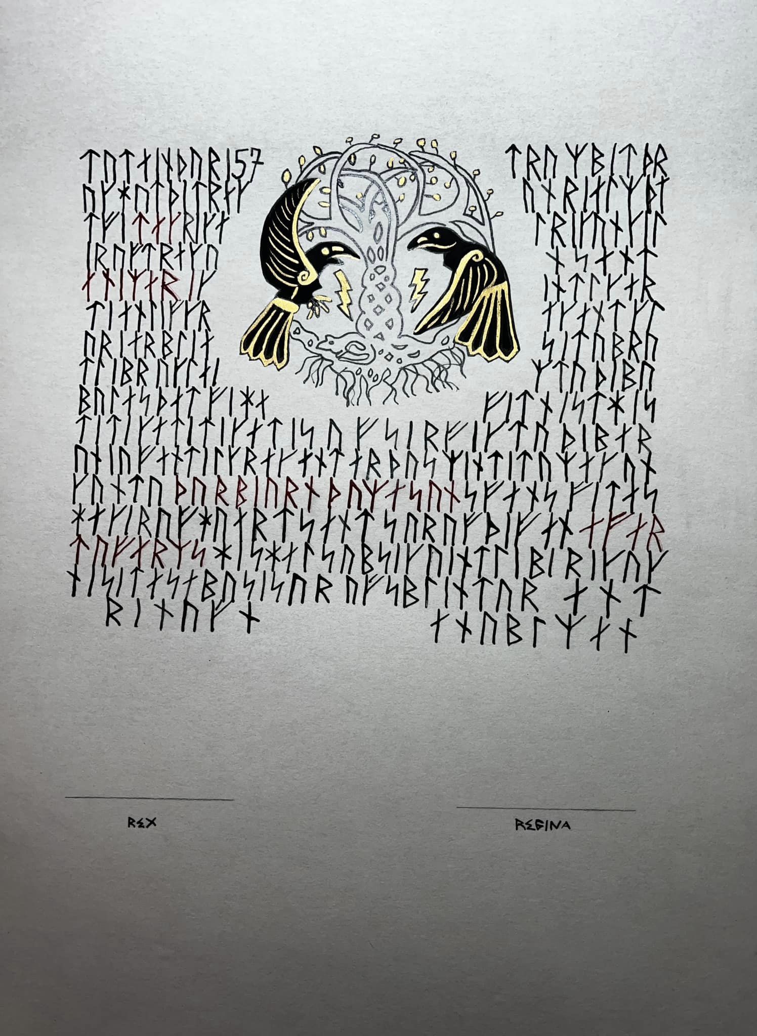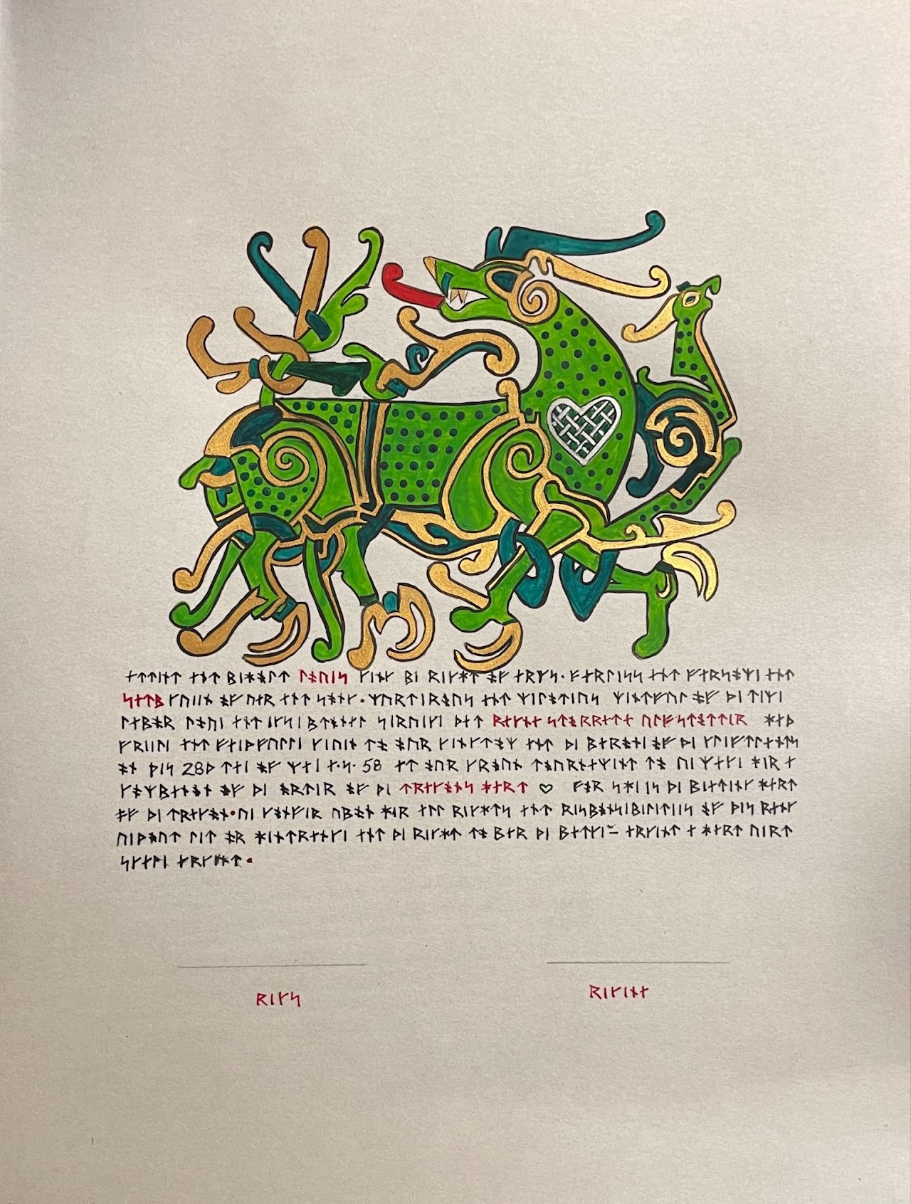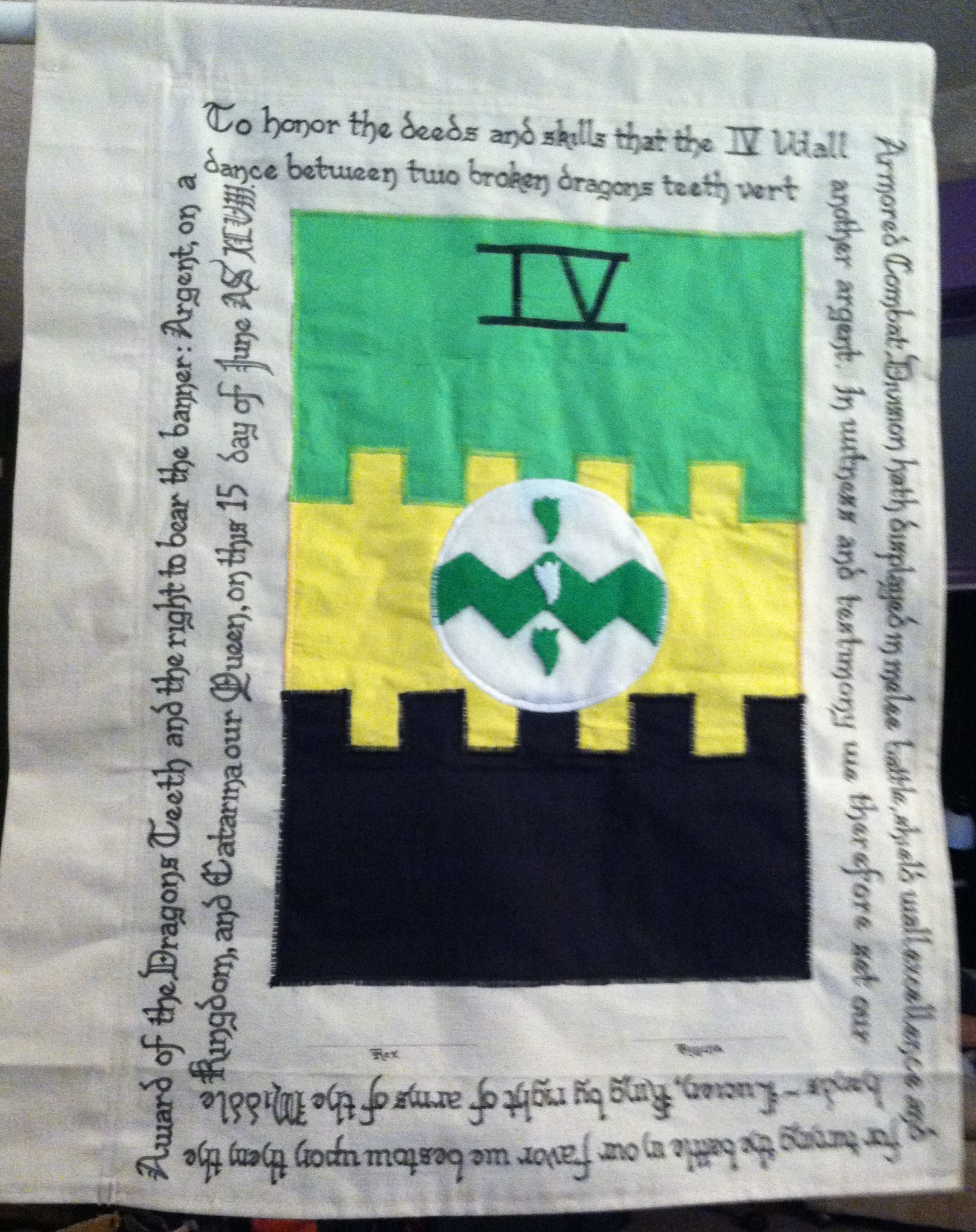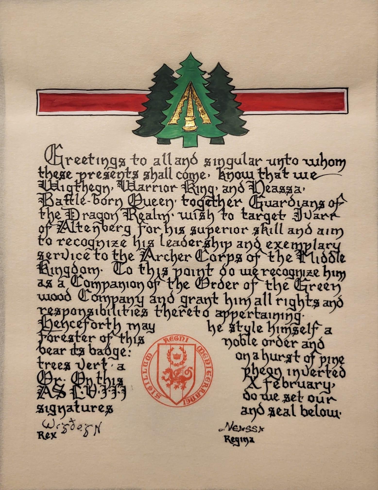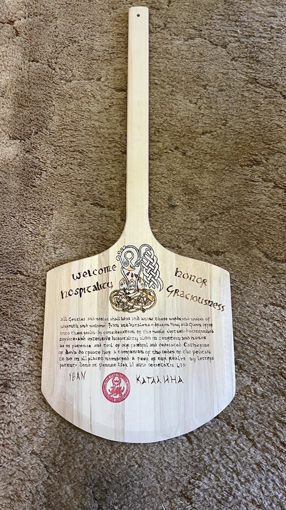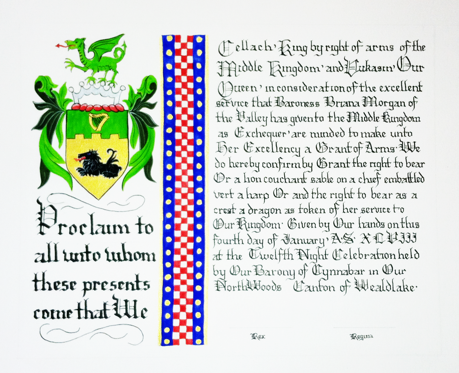 The tradition of using illumination and hand written documents continues today in special documents such as in the forms of wedding and event invitations, font design/ typography, original hand-lettered logo design, religious art, various announcements/ graphic design/ commissioned calligraphic art, cut stone inscriptions and memorial documents. (See http://www.saintjohnsbible.org/ for a modern illuminated hand written Bible in process.) The SCA continues this tradition in the use of illuminated manuscripts for their awards. (The Middle Kingdom - Midrealm provides a scroll with each award bestowed by the Crown. Examples of these are below organzied by award done by the hand of our resident scribes.)