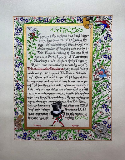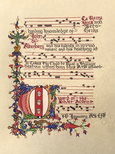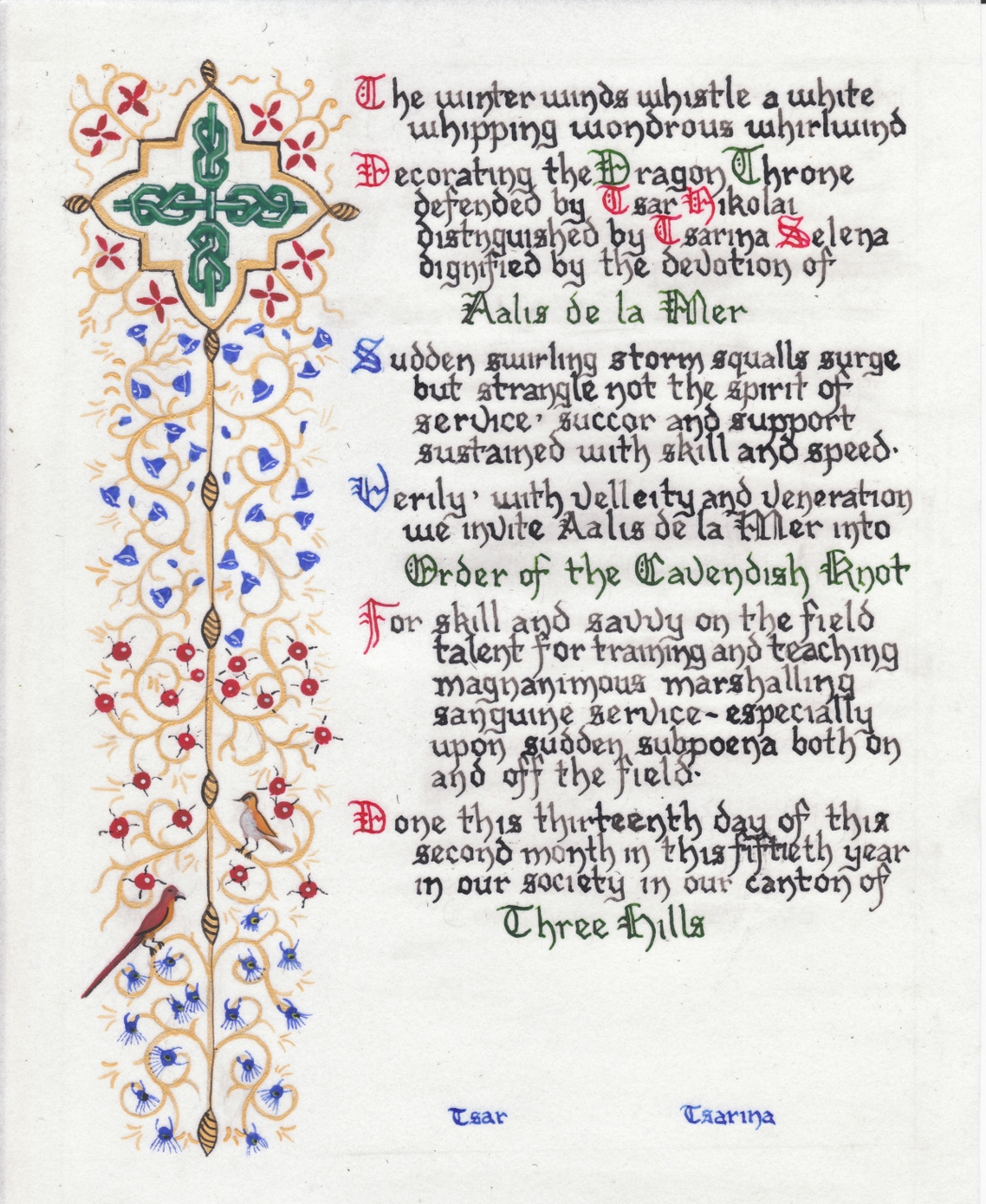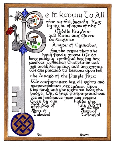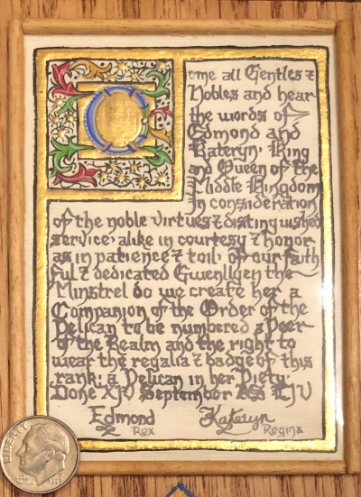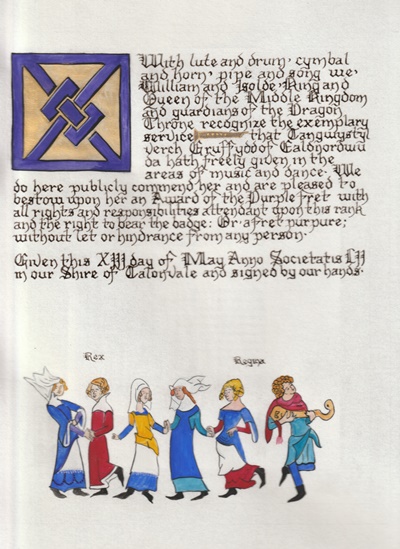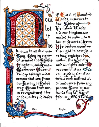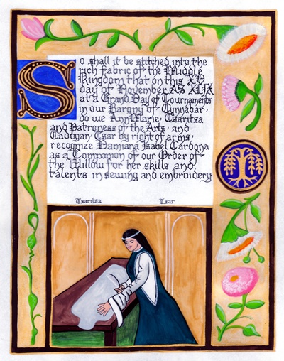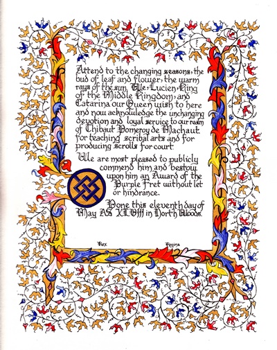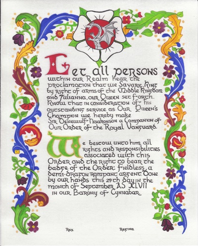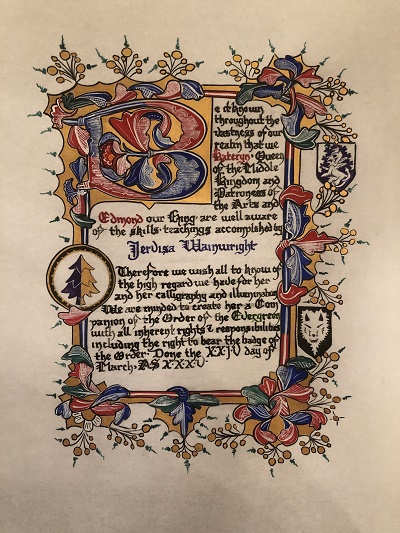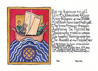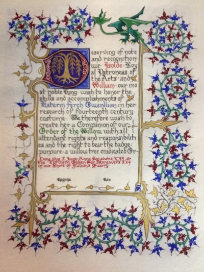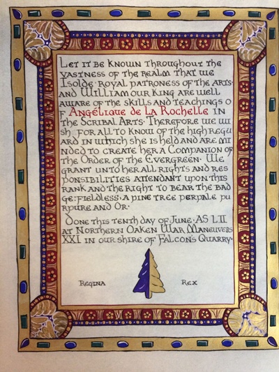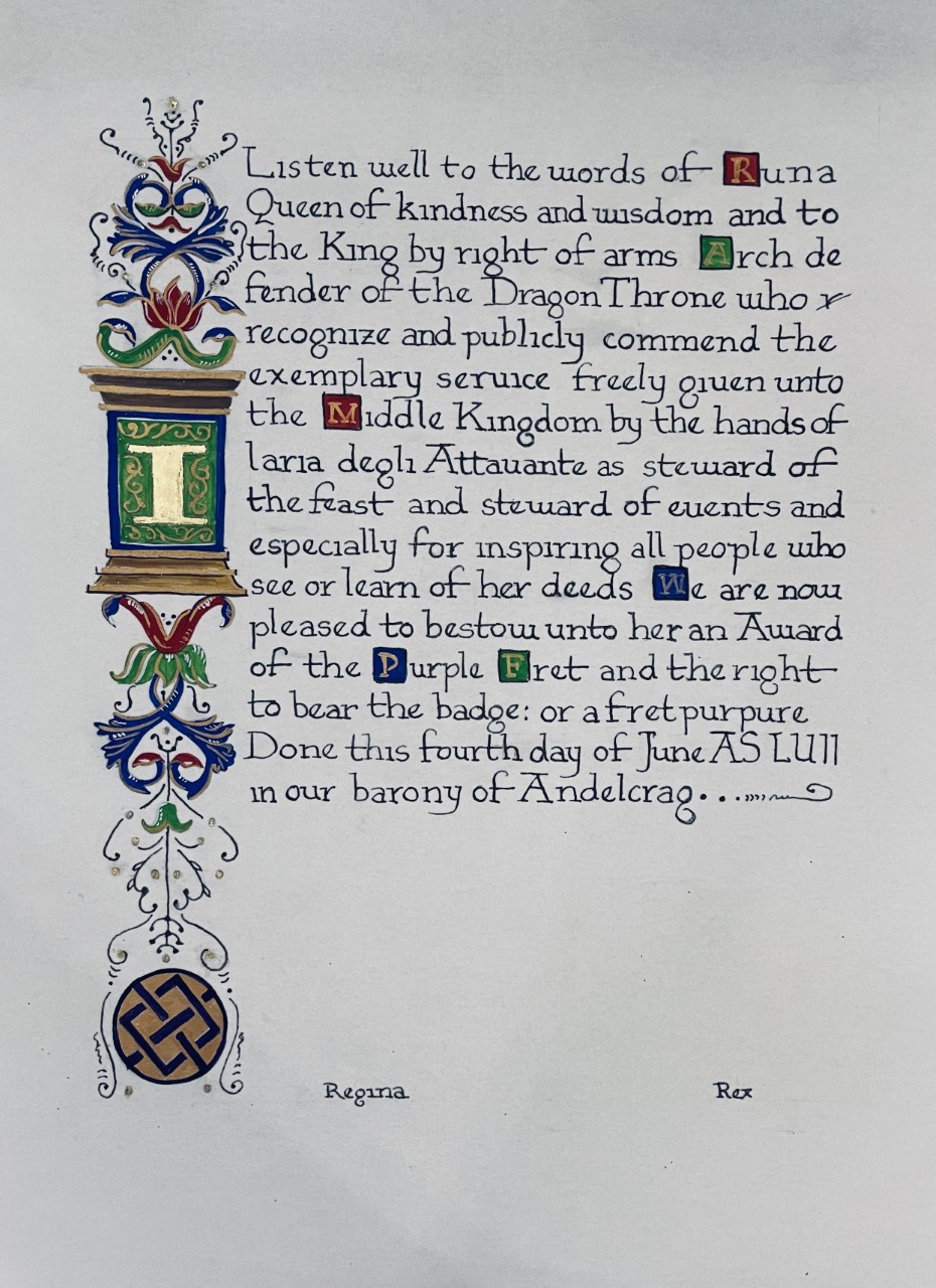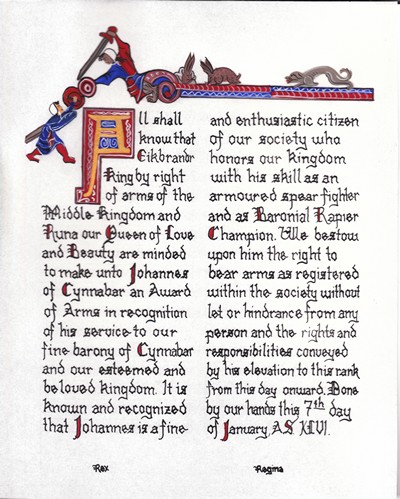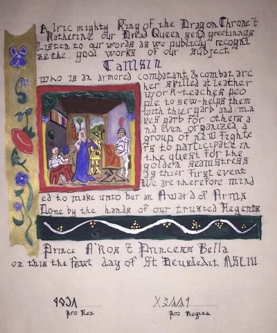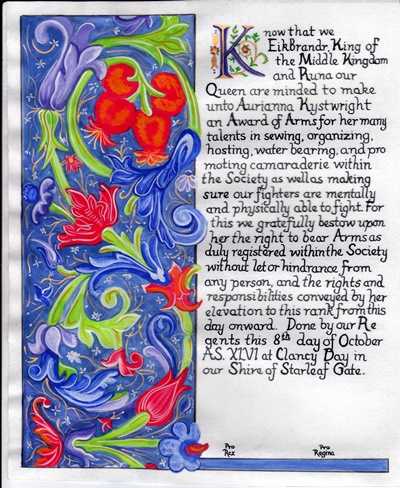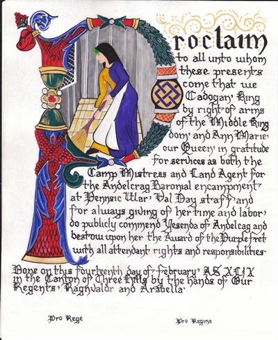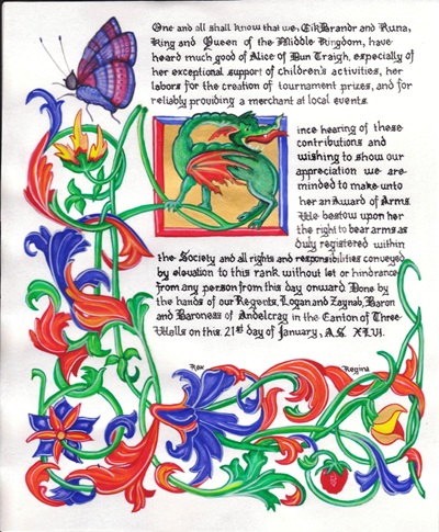 The SCA has a tradition of the giving of illuminated manuscripts for their awards. (The Middle Kingdom - Midrealm provides a scroll with each award bestowed by the Crown.) Examples of these produced by the hand of Baroness Alianor bat Asriel (known as Lady Aliyah) and The Honorable Lady SaehildR barngodR are below: