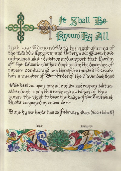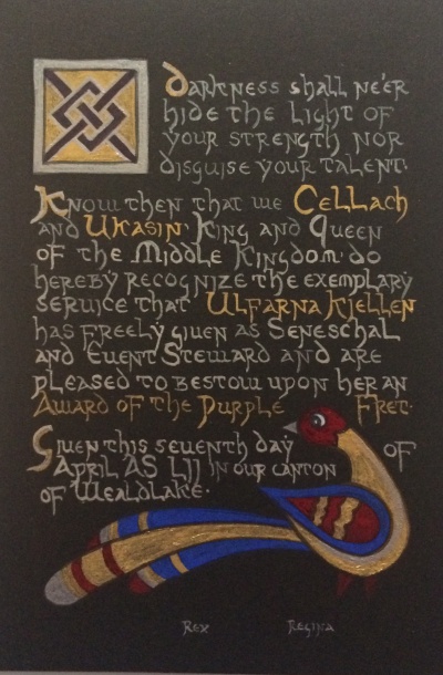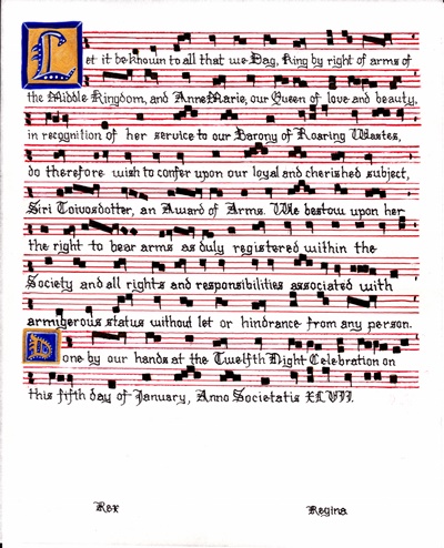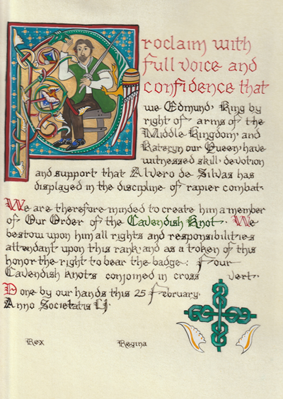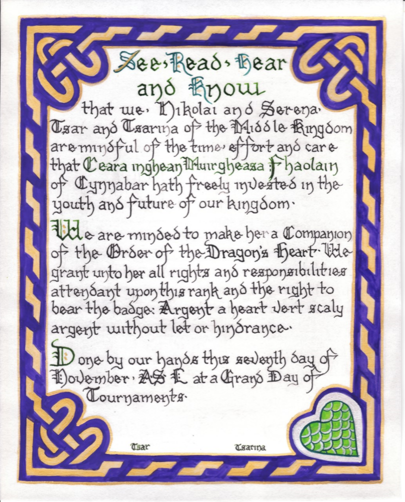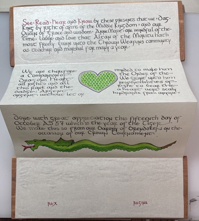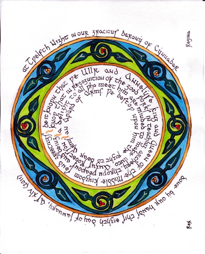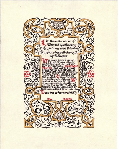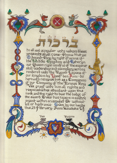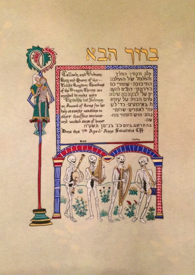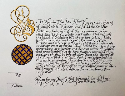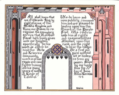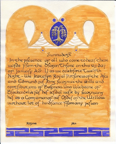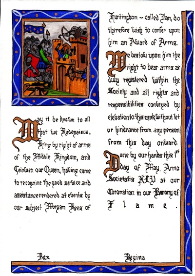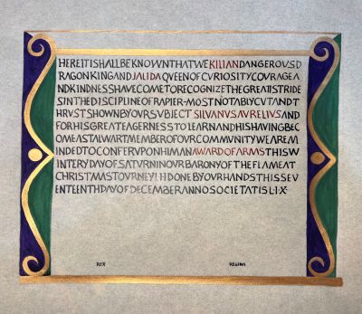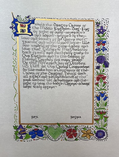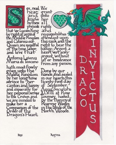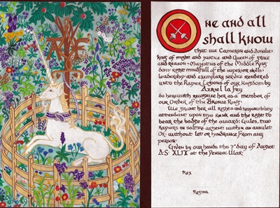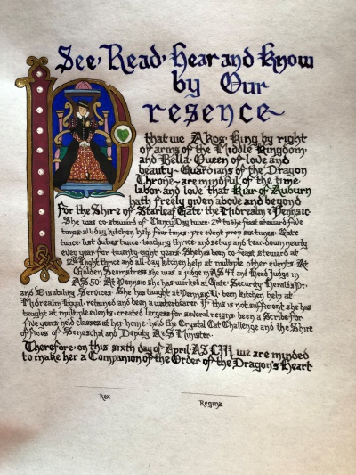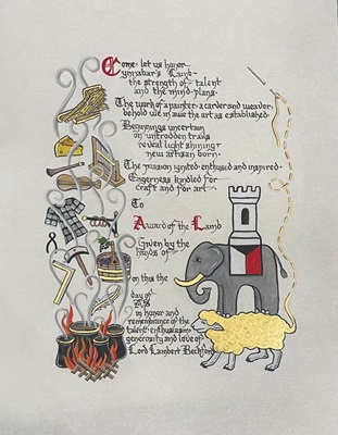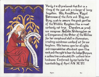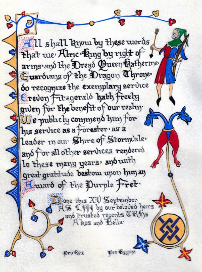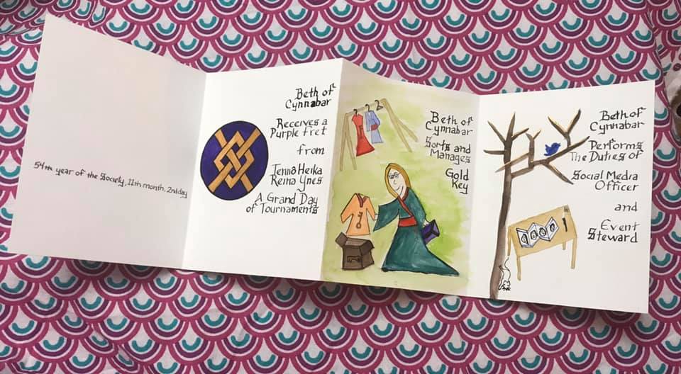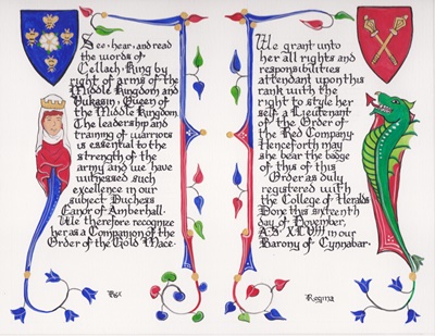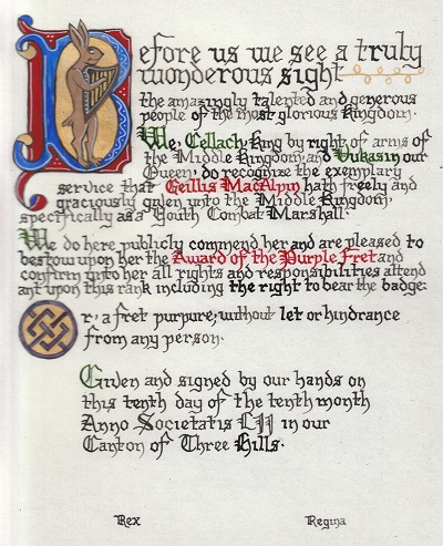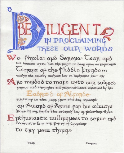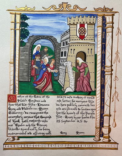 The SCA has a tradition of the giving of illuminated manuscripts for their awards. (The Middle Kingdom - Midrealm provides a scroll with each award bestowed by the Crown.) Examples of these produced by the hand of Baroness Alianor bat Asriel (known as Lady Aliyah) and The Honorable Lady SaehildR barngodR are below: