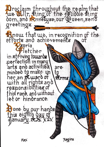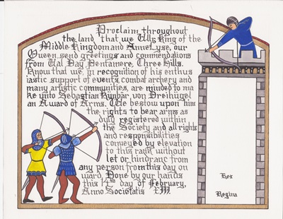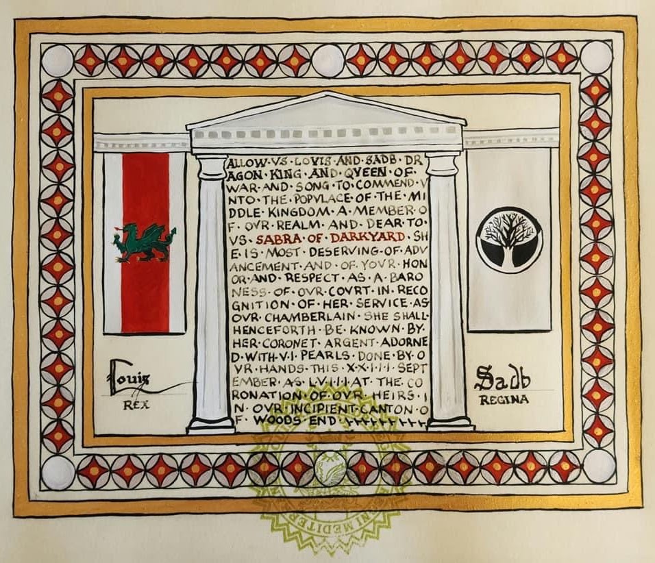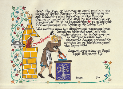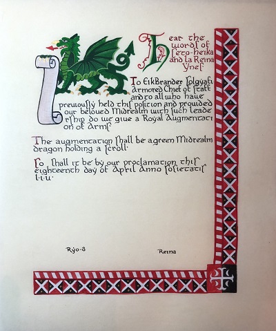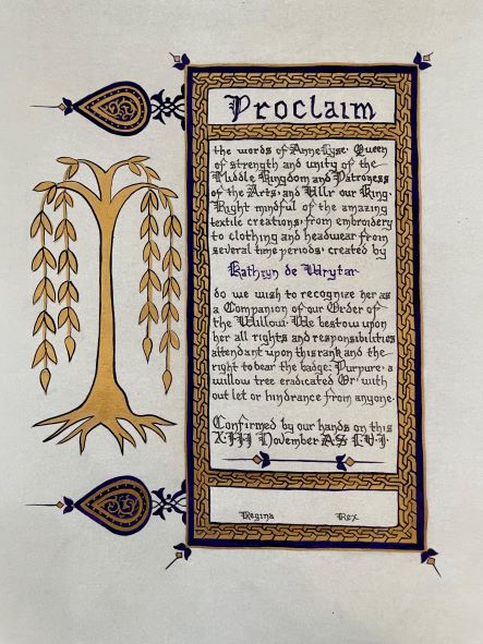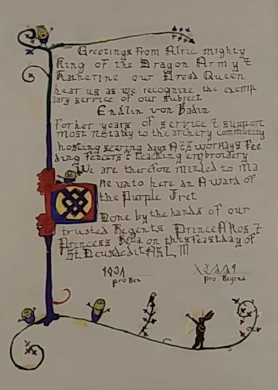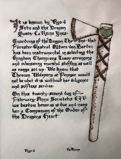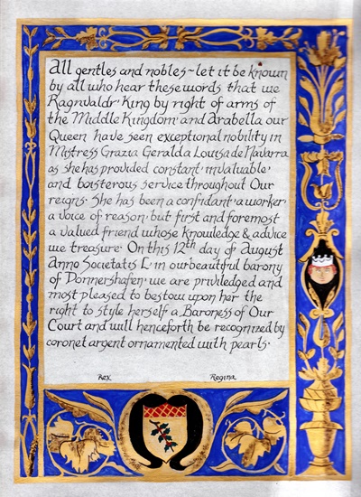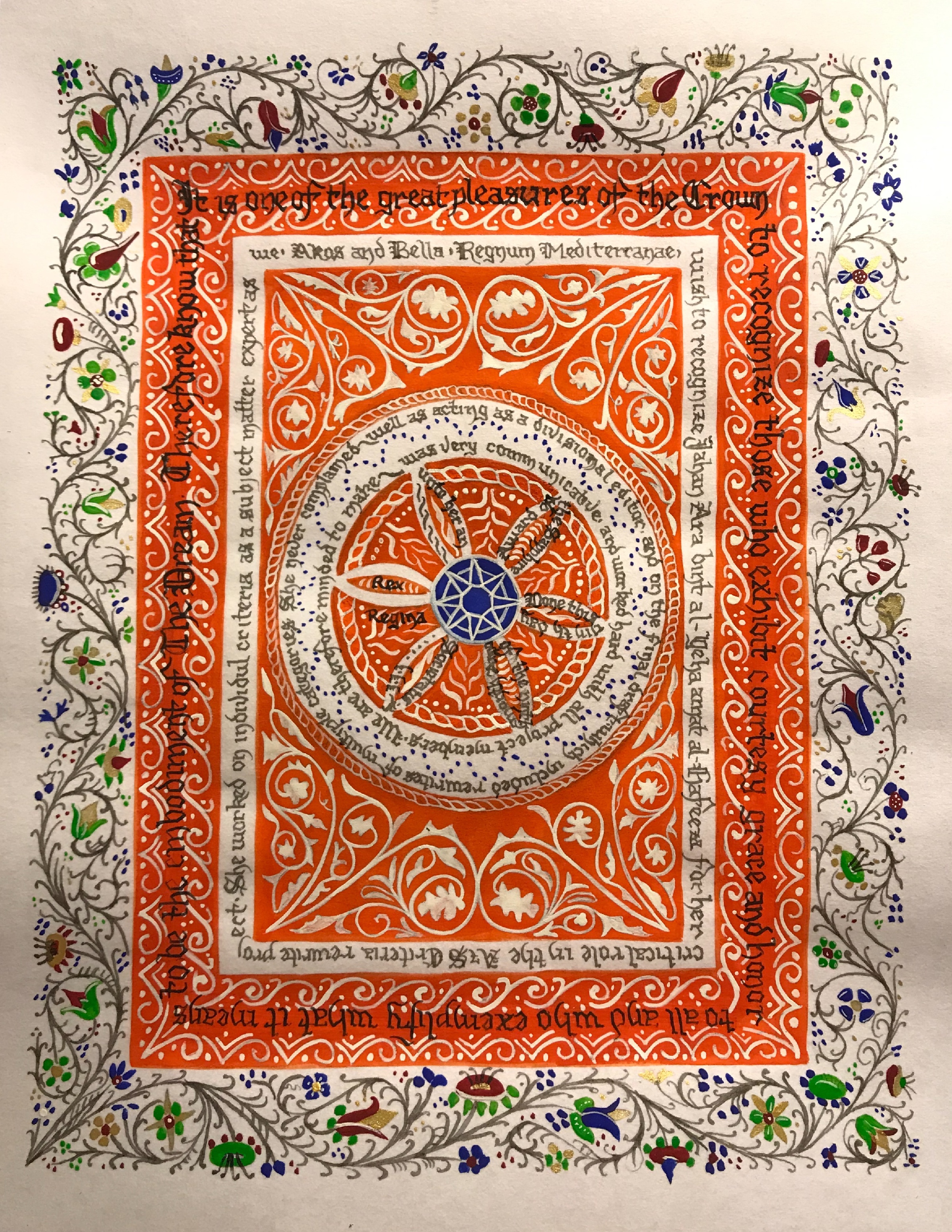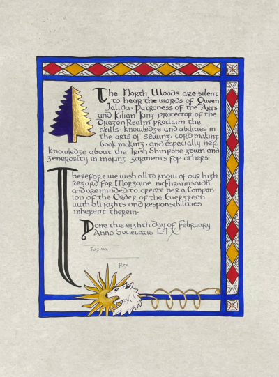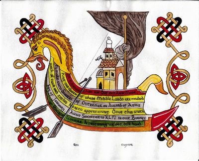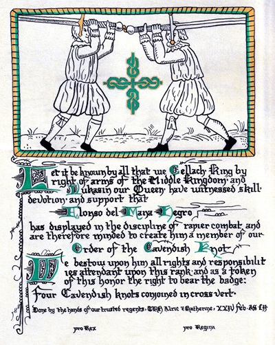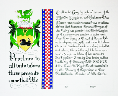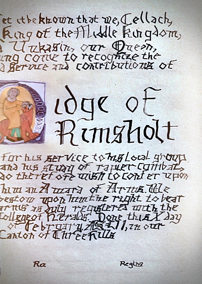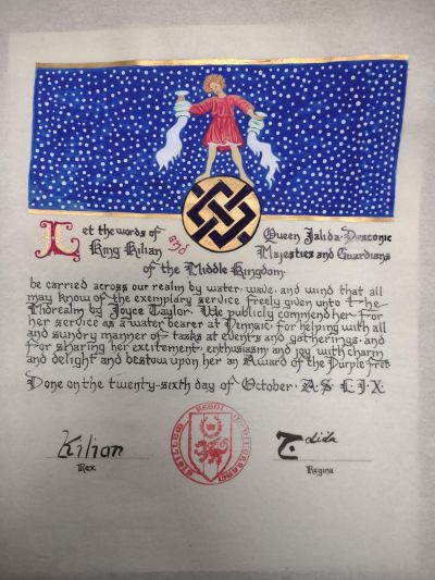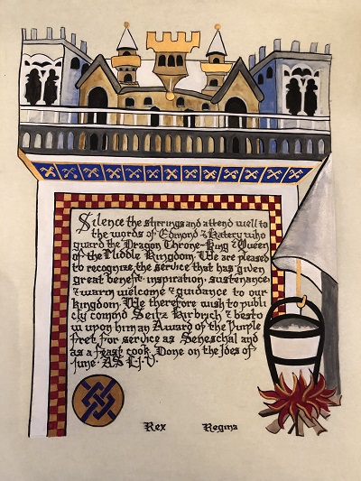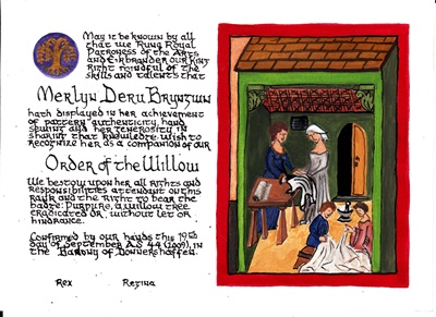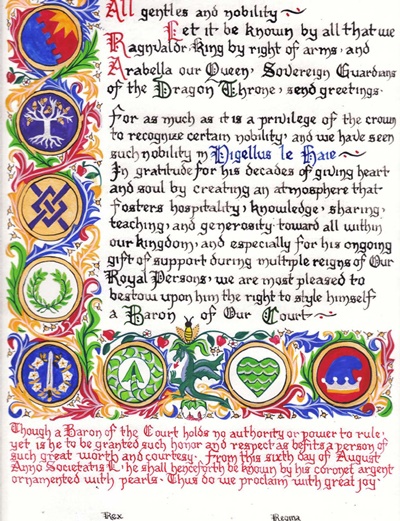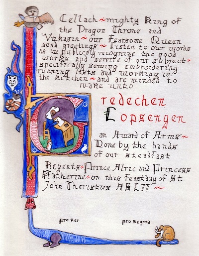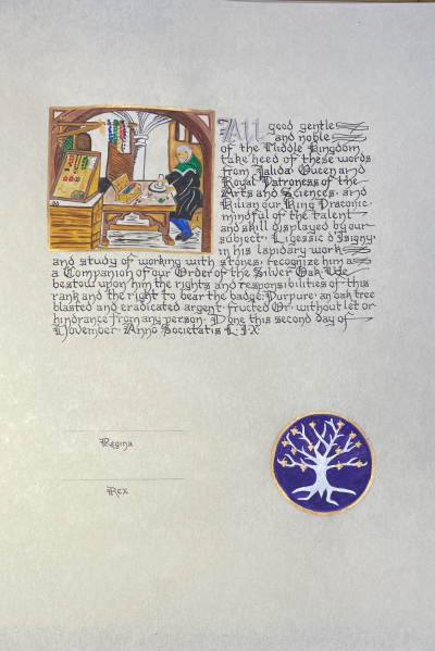 The SCA has a tradition of the giving of illuminated manuscripts for their awards. (The Middle Kingdom - Midrealm provides a scroll with each award bestowed by the Crown.) Examples of these produced by the hand of Baroness Alianor bat Asriel (known as Lady Aliyah) and The Honorable Lady SaehildR barngodR are below: