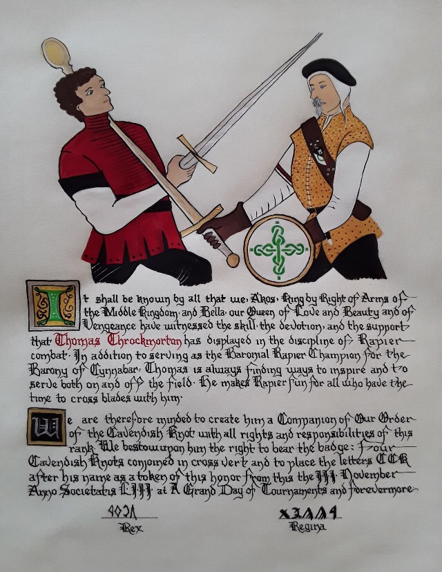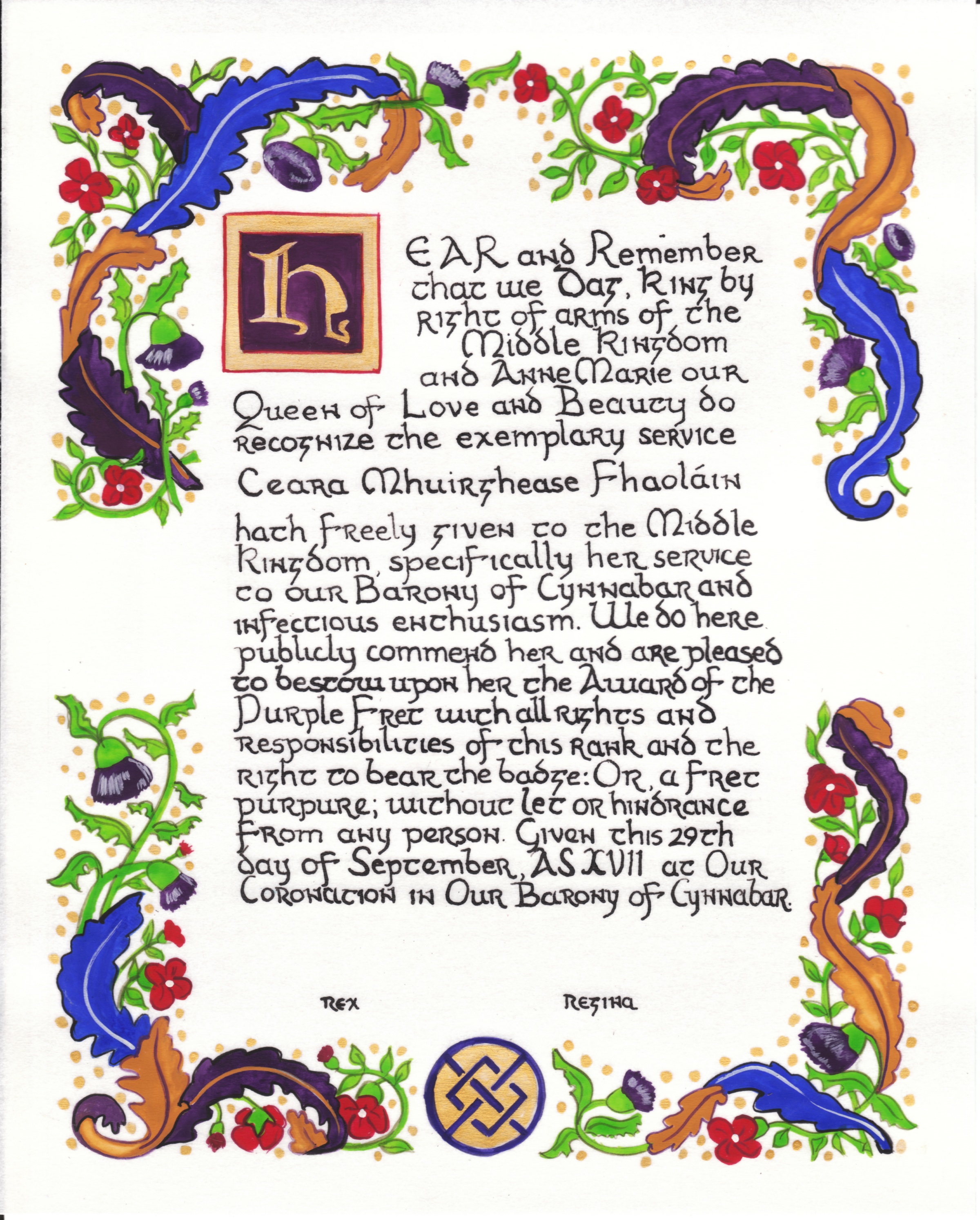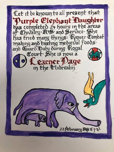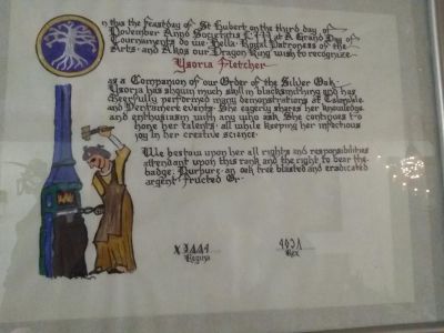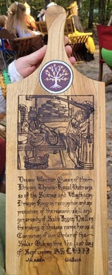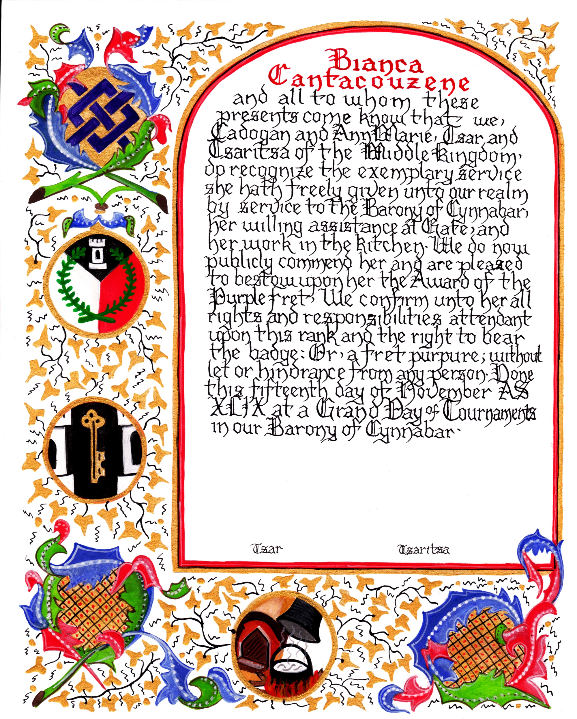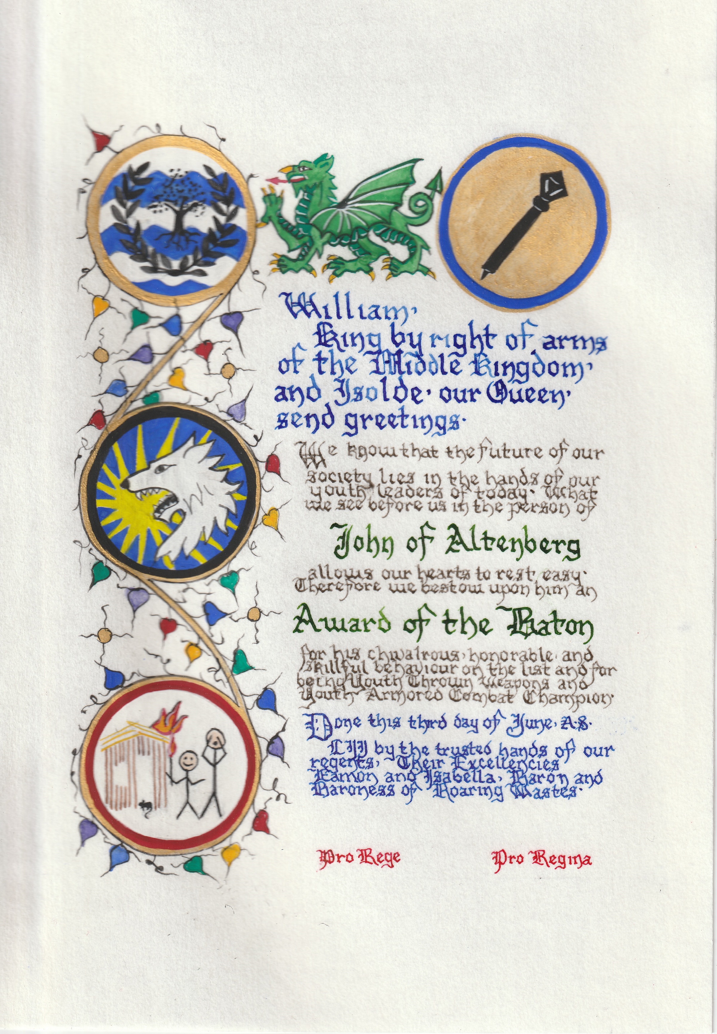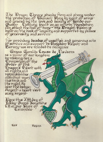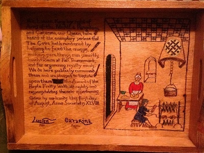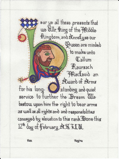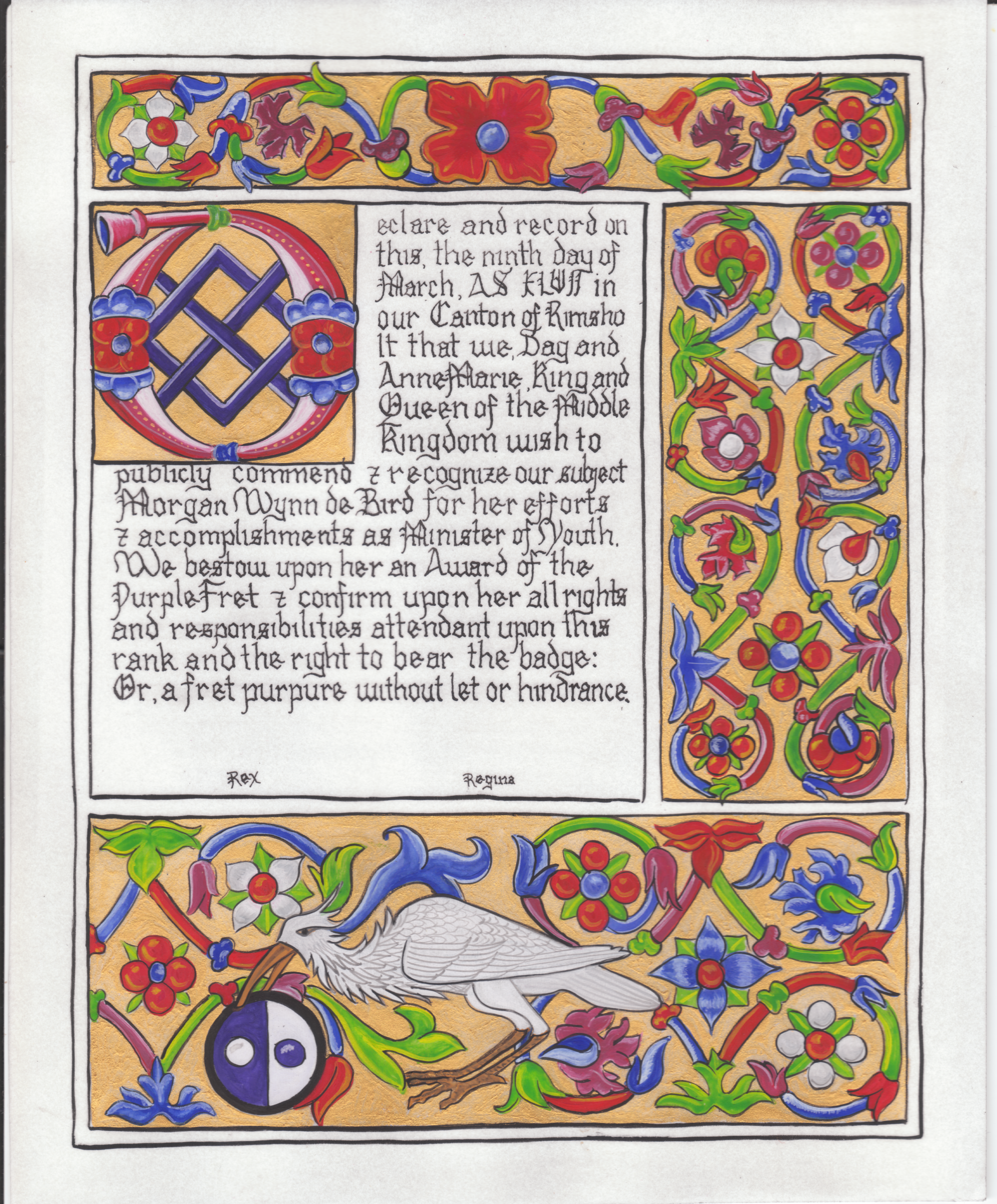 The SCA has a tradition of the giving of illuminated manuscripts for their awards. (The Middle Kingdom - Midrealm provides a scroll with each award bestowed by the Crown.) Examples of these produced by the hand of Baroness Alianor bat Asriel (known as Lady Aliyah) and The Honorable Lady SaehildR barngodR are below: