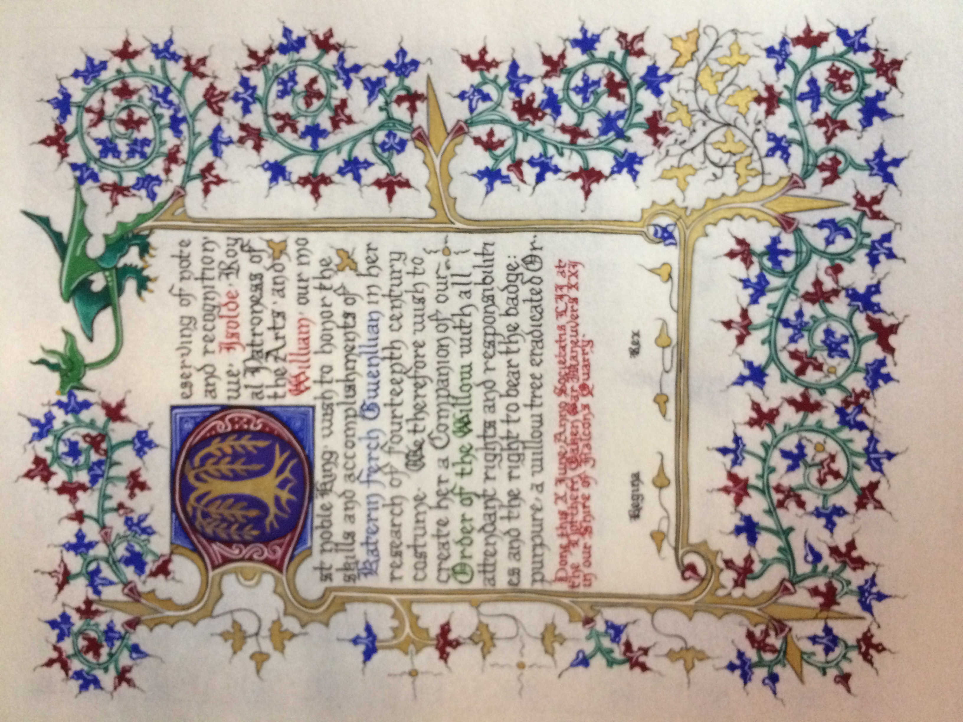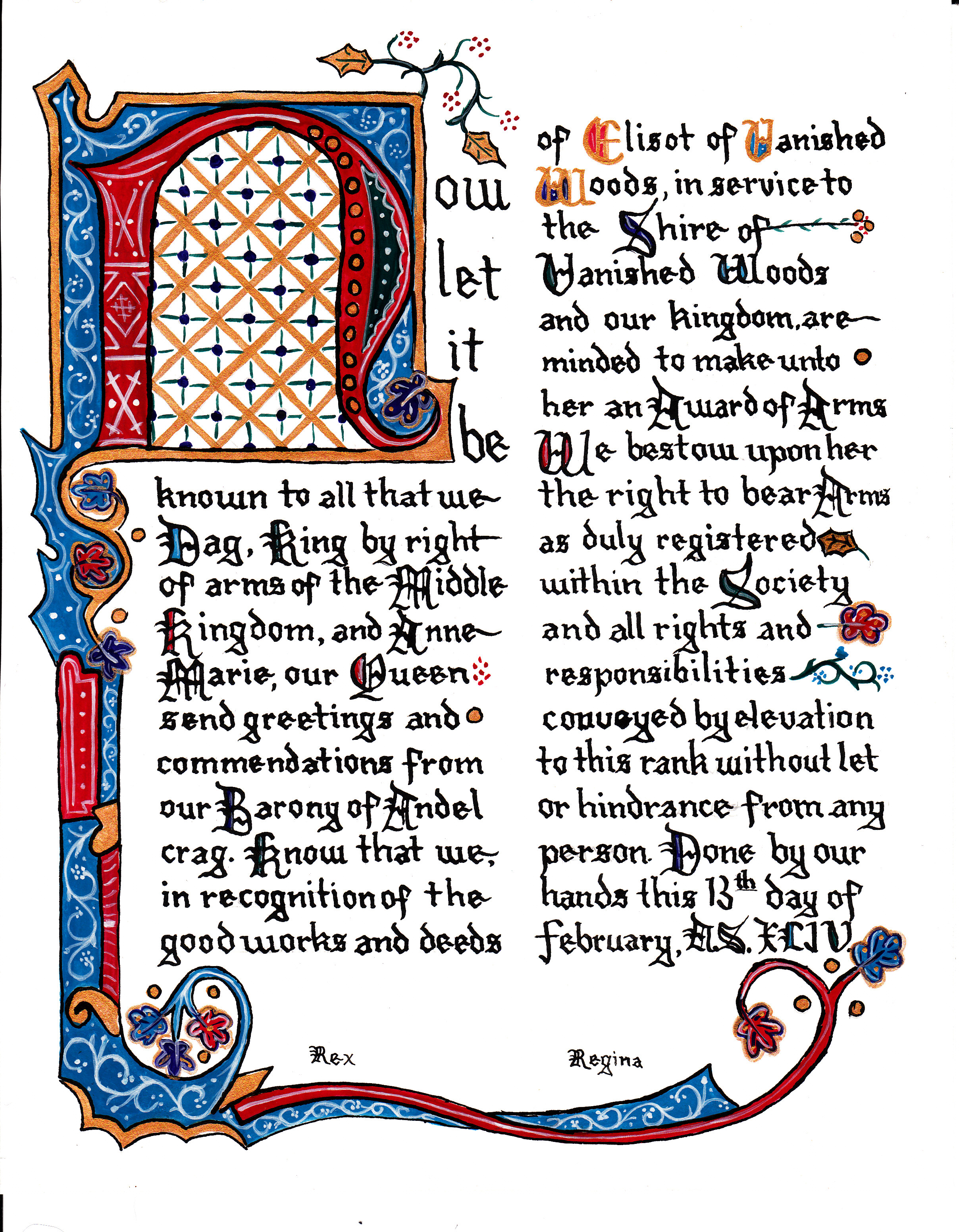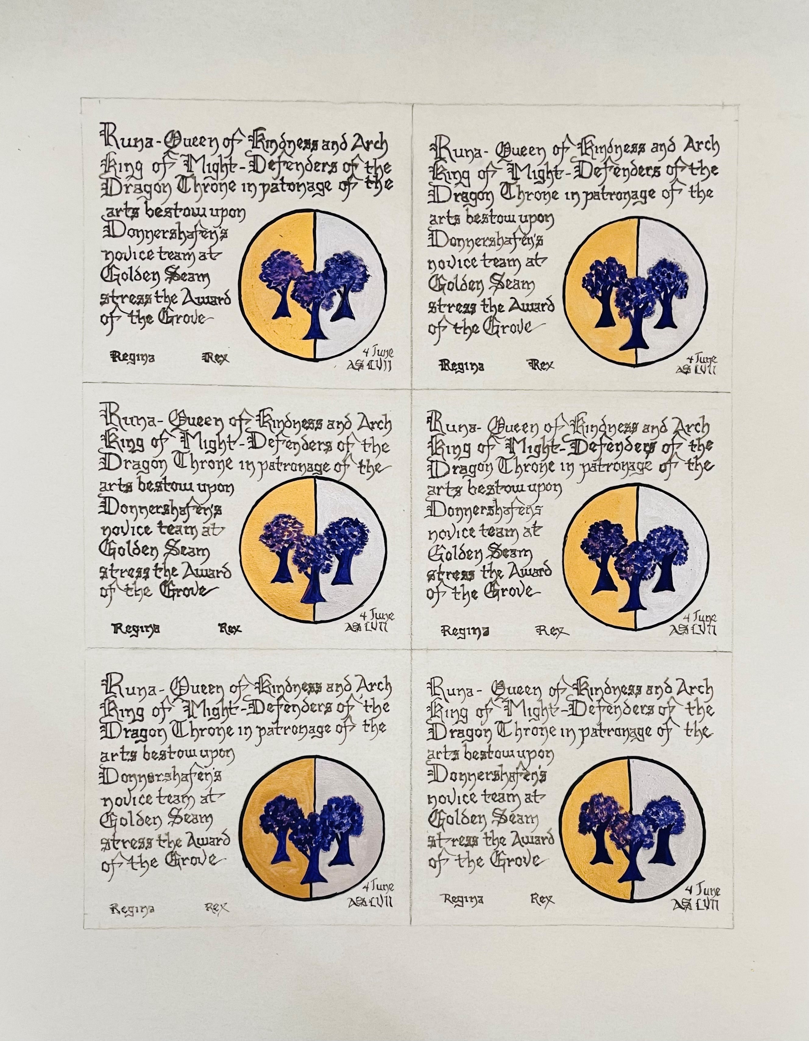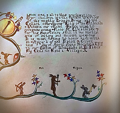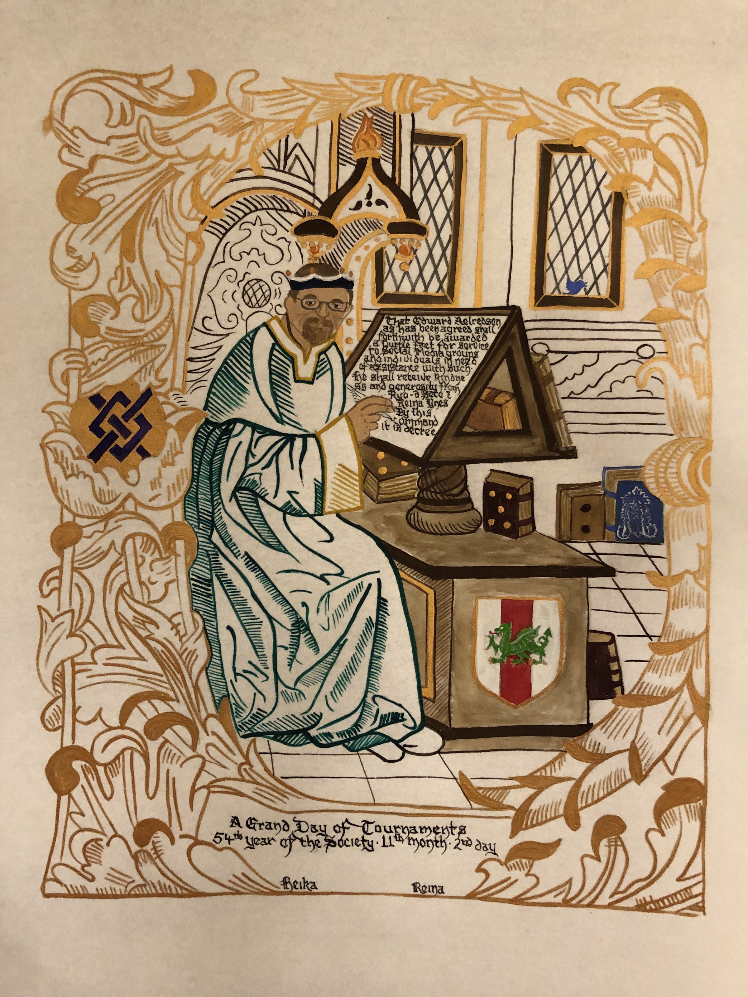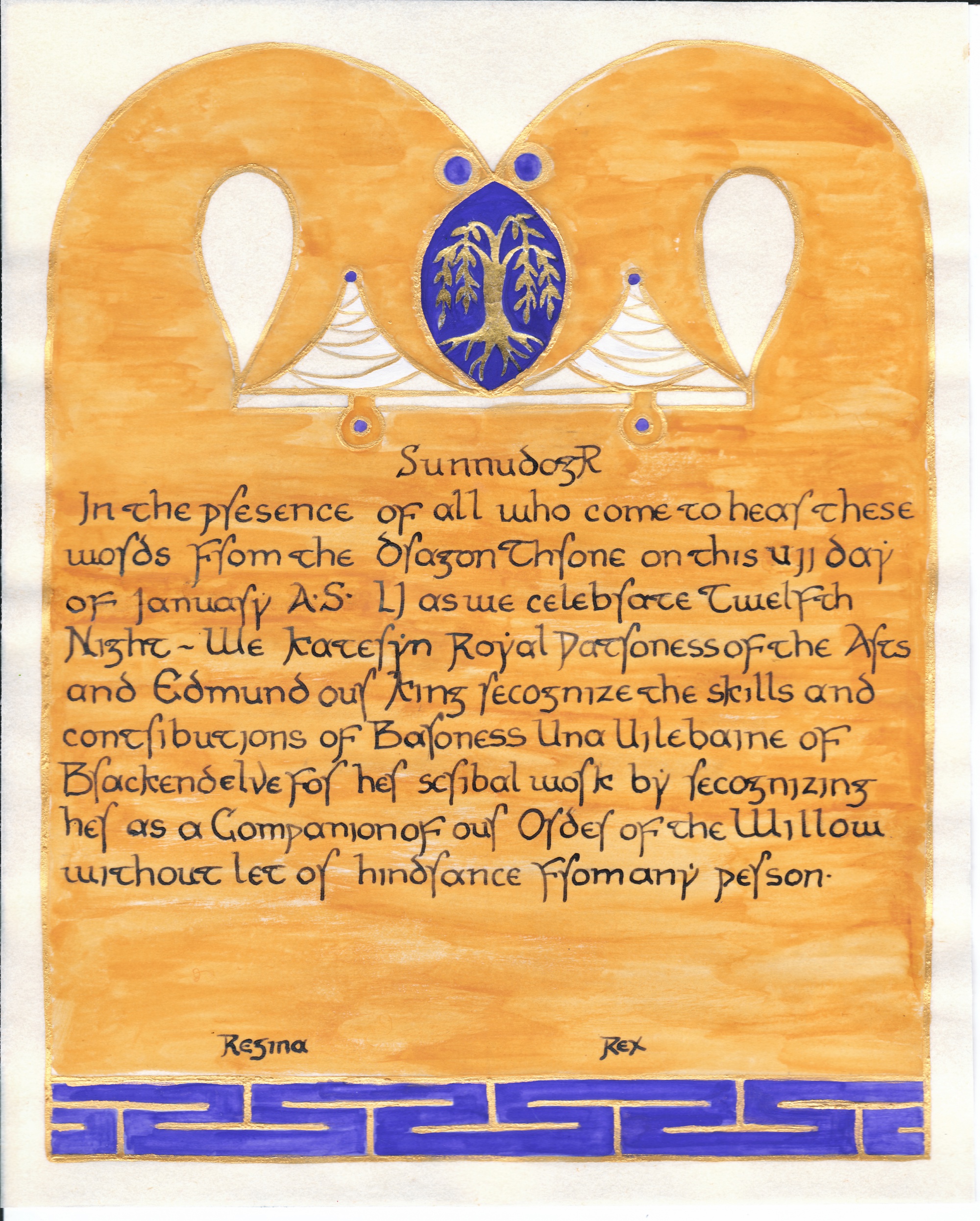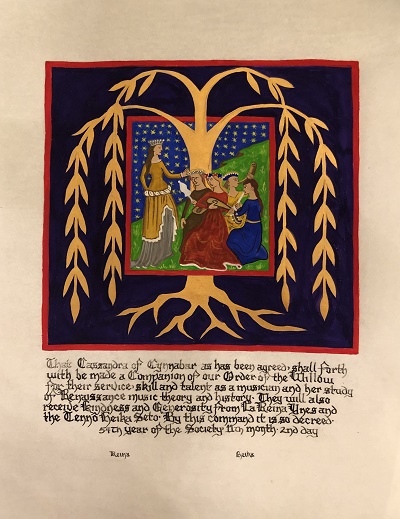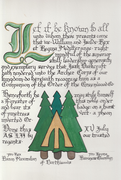 The SCA has a tradition of the giving of illuminated manuscripts for their awards. (The Middle Kingdom - Midrealm provides a scroll with each award bestowed by the Crown.) Examples of these produced by the hand of Baroness Alianor bat Asriel (known as Lady Aliyah) and The Honorable Lady SaehildR barngodR are below: