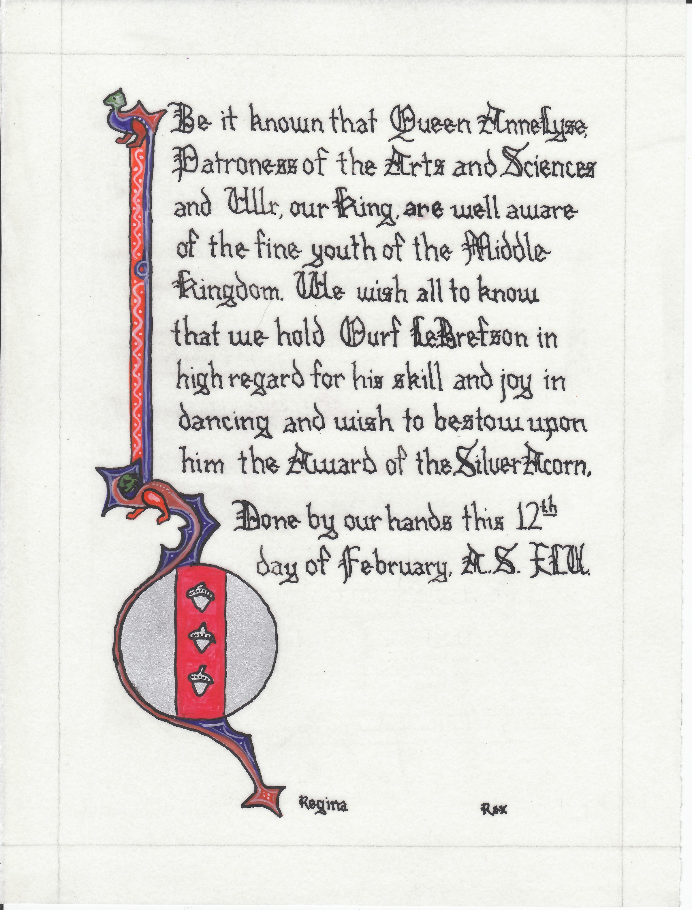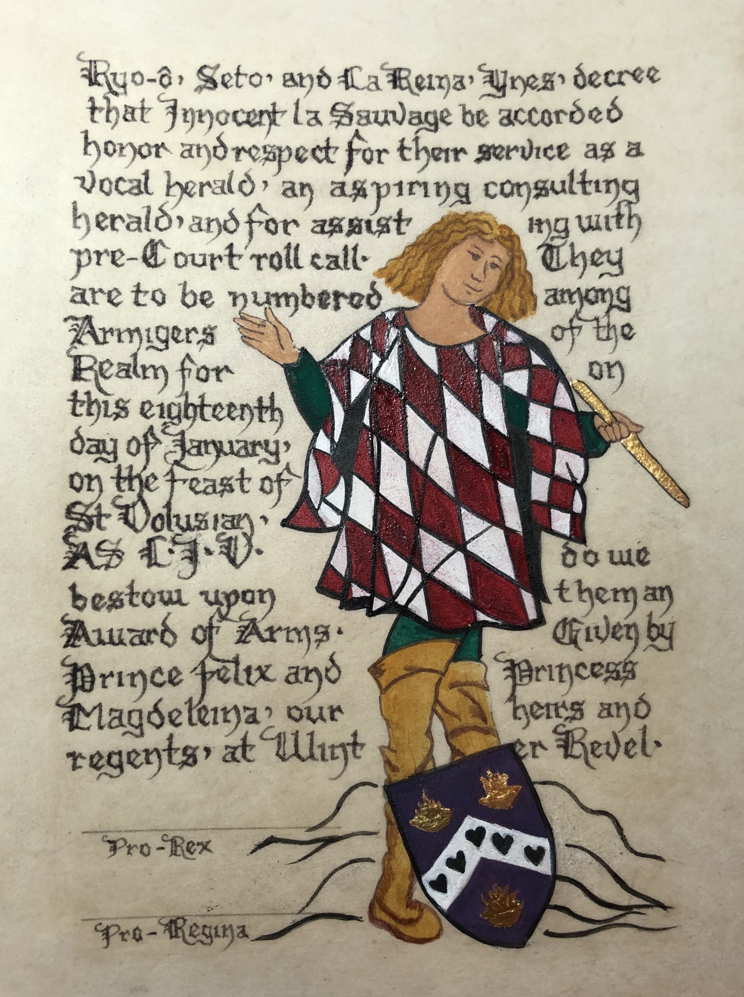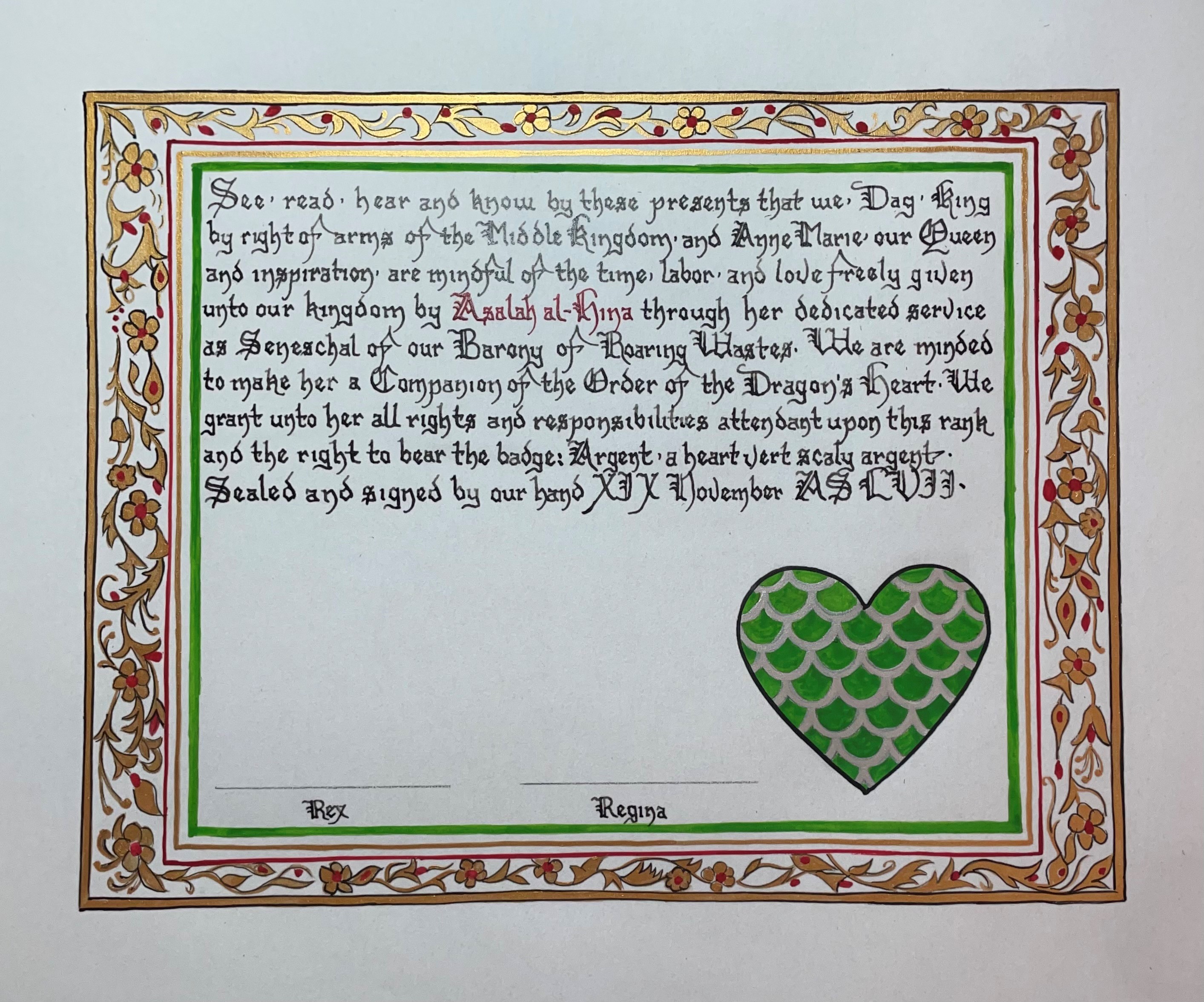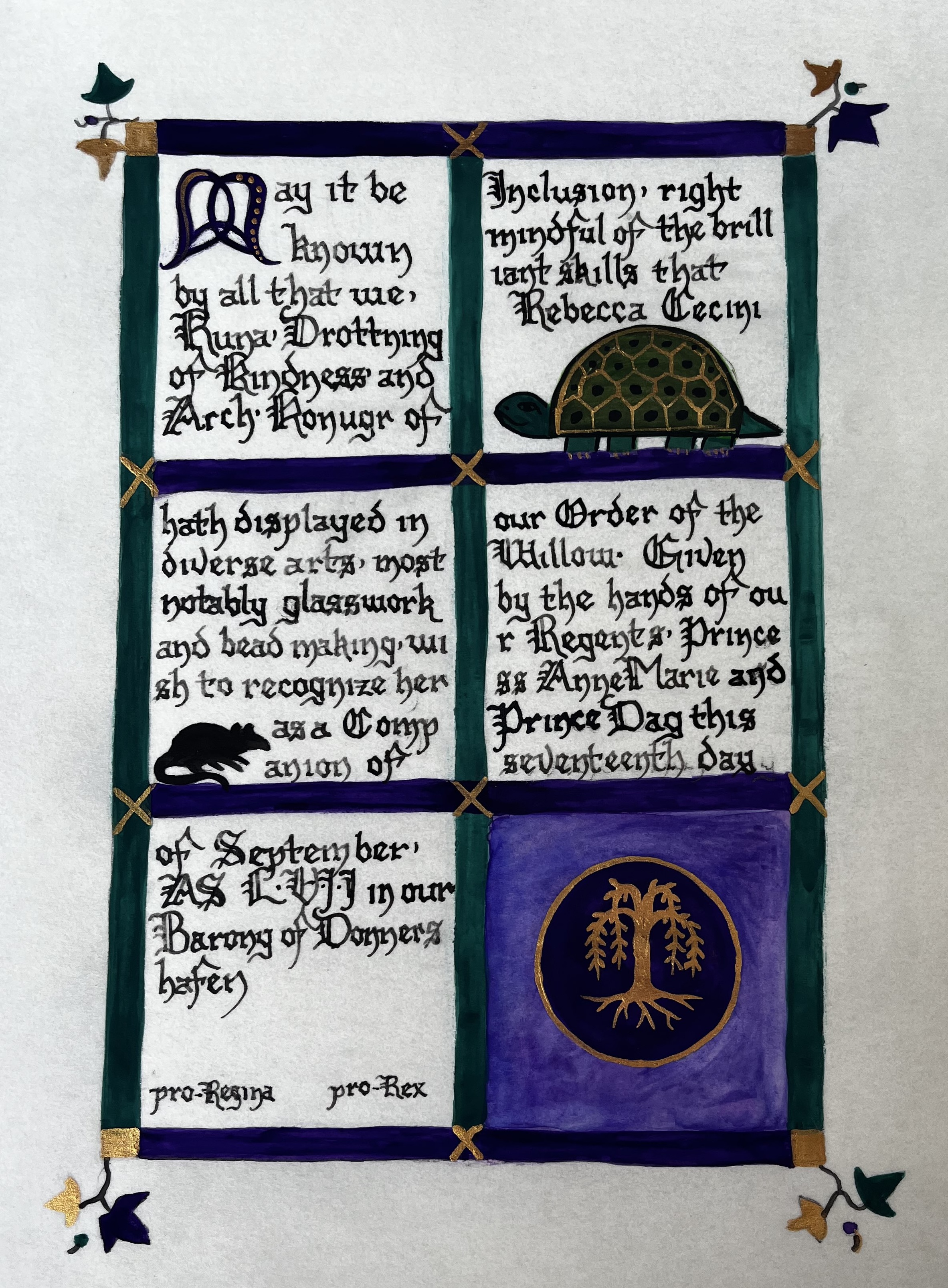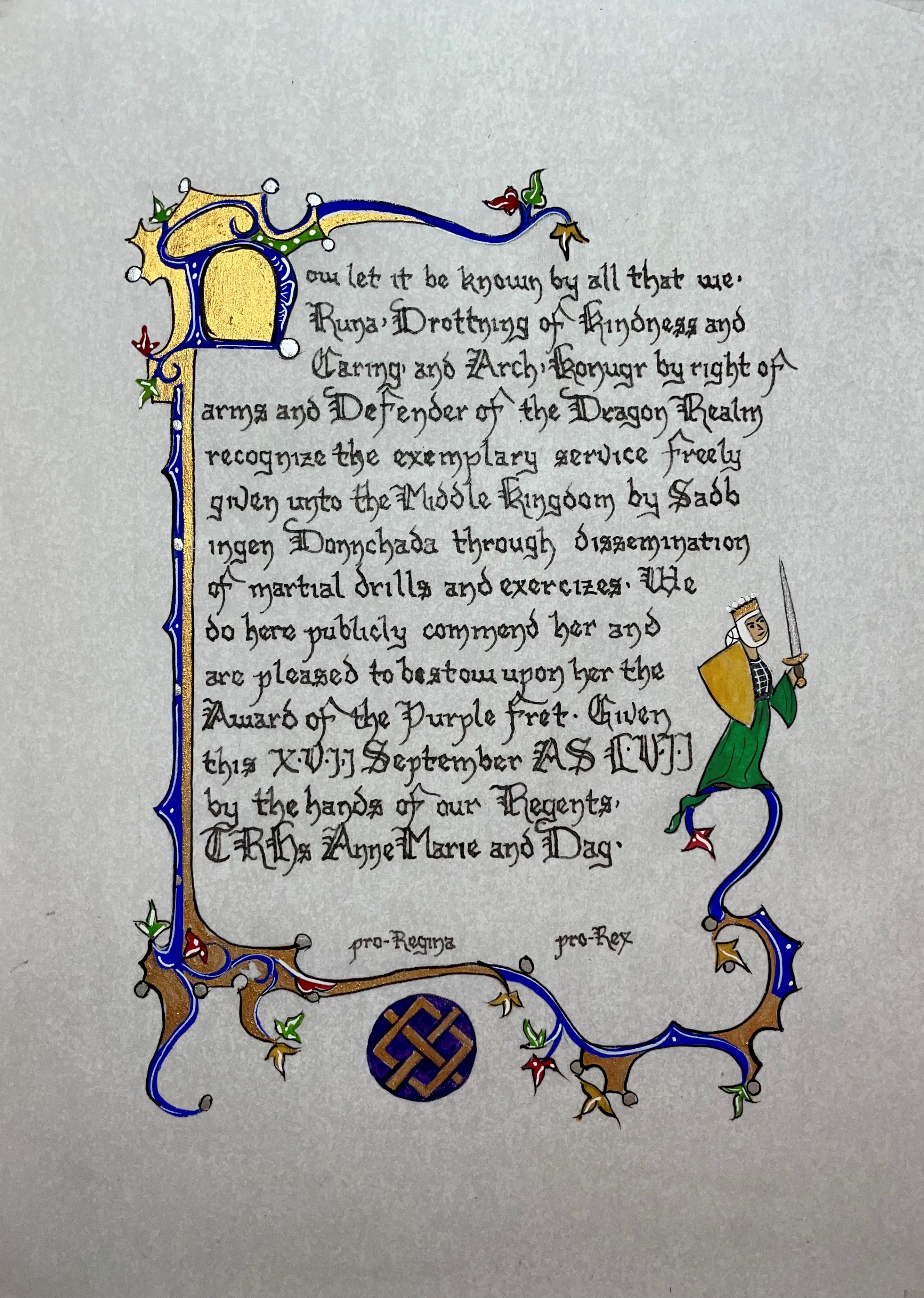 The SCA has a tradition of the giving of illuminated manuscripts for their awards. (The Middle Kingdom - Midrealm provides a scroll with each award bestowed by the Crown.) Examples of these produced by the hand of Baroness Alianor bat Asriel (known as Lady Aliyah) and The Honorable Lady SaehildR barngodR are below: