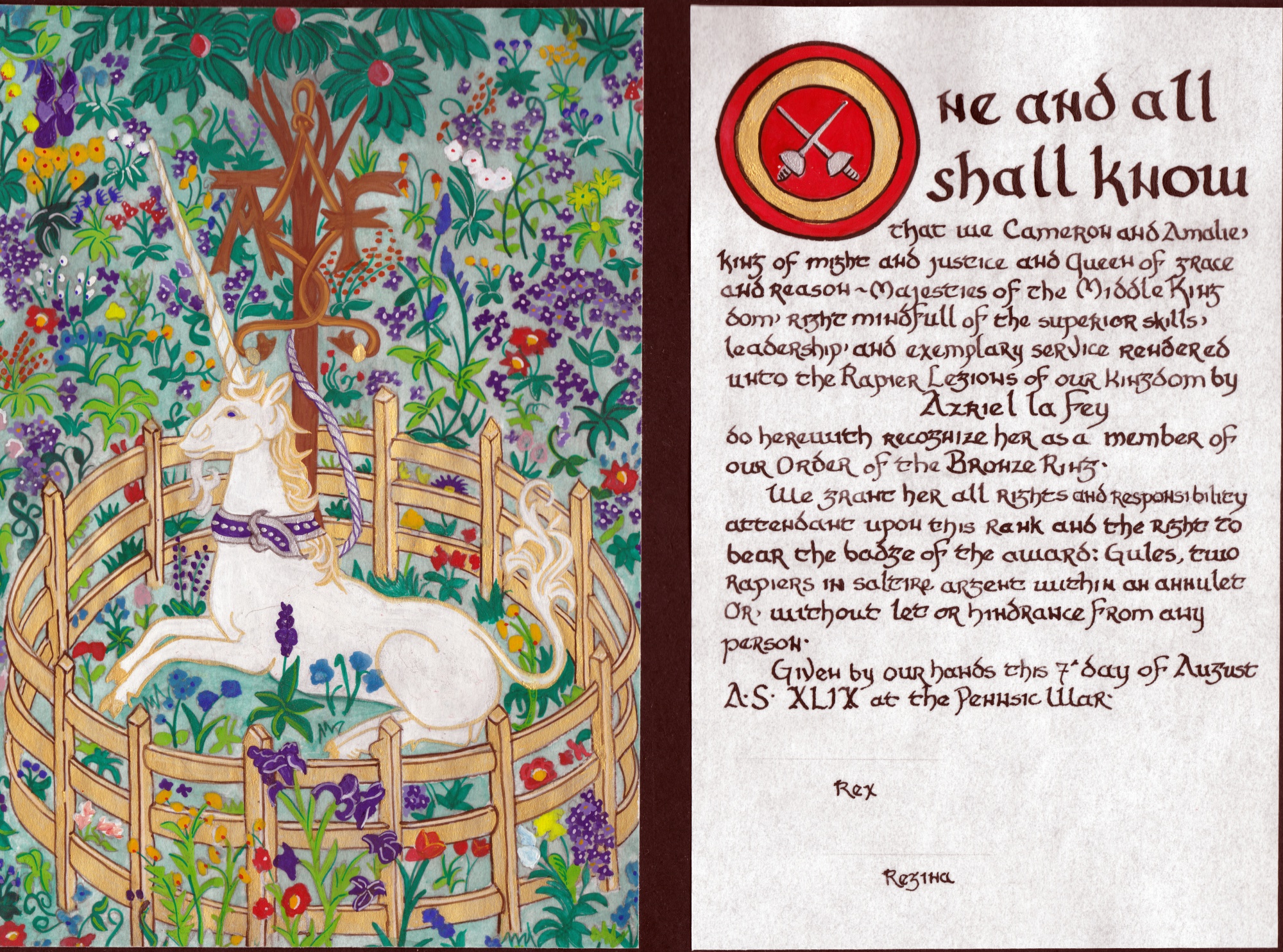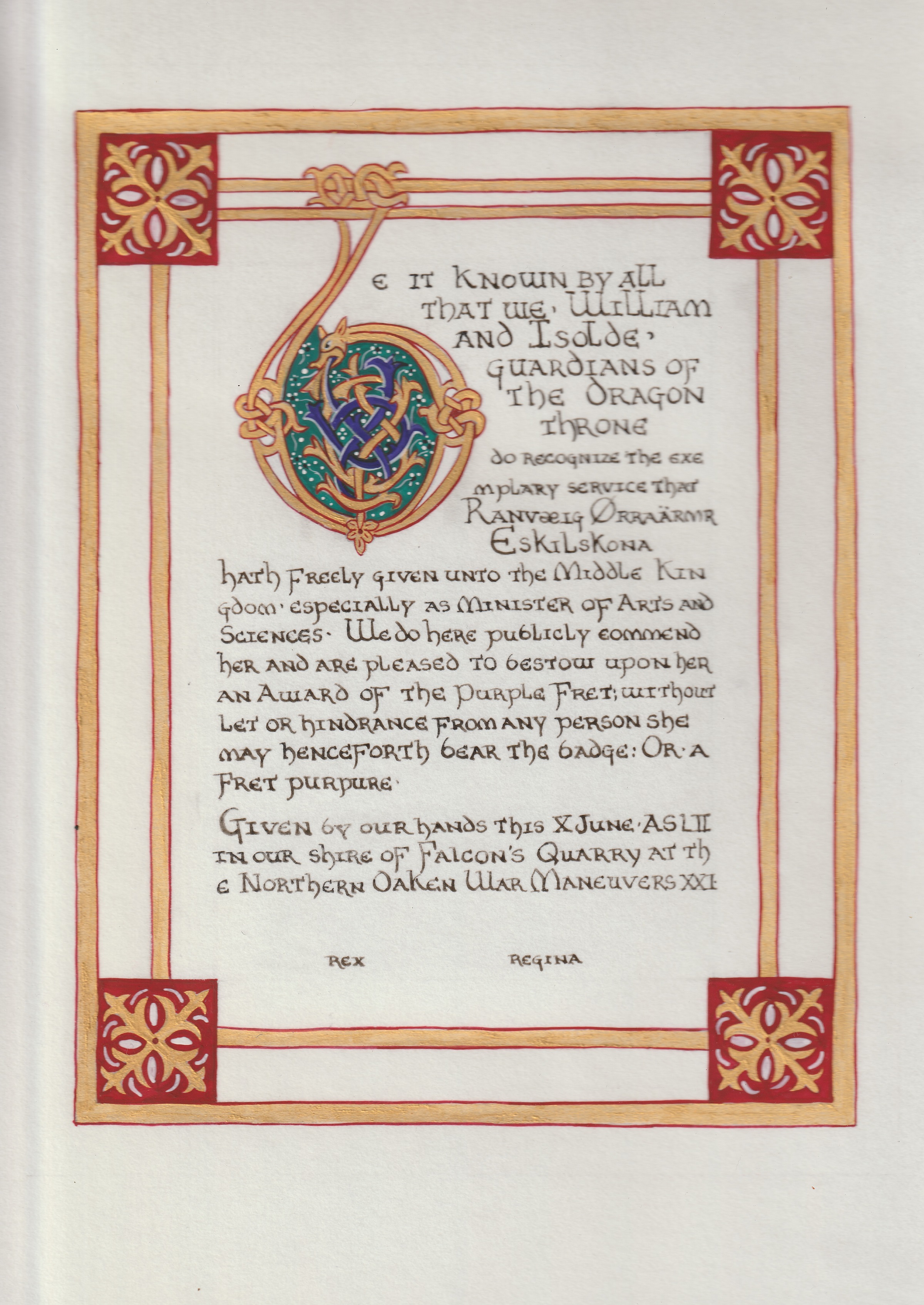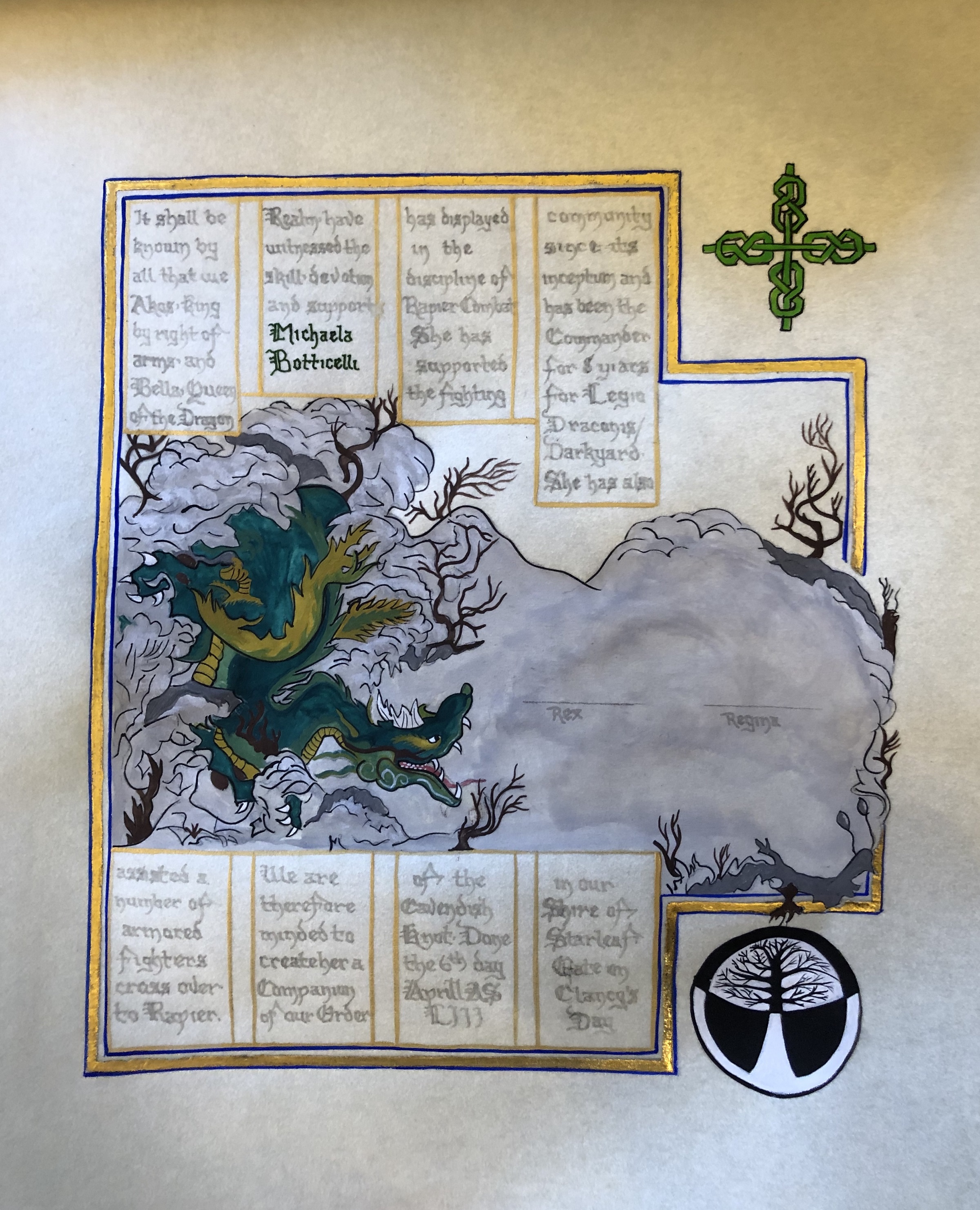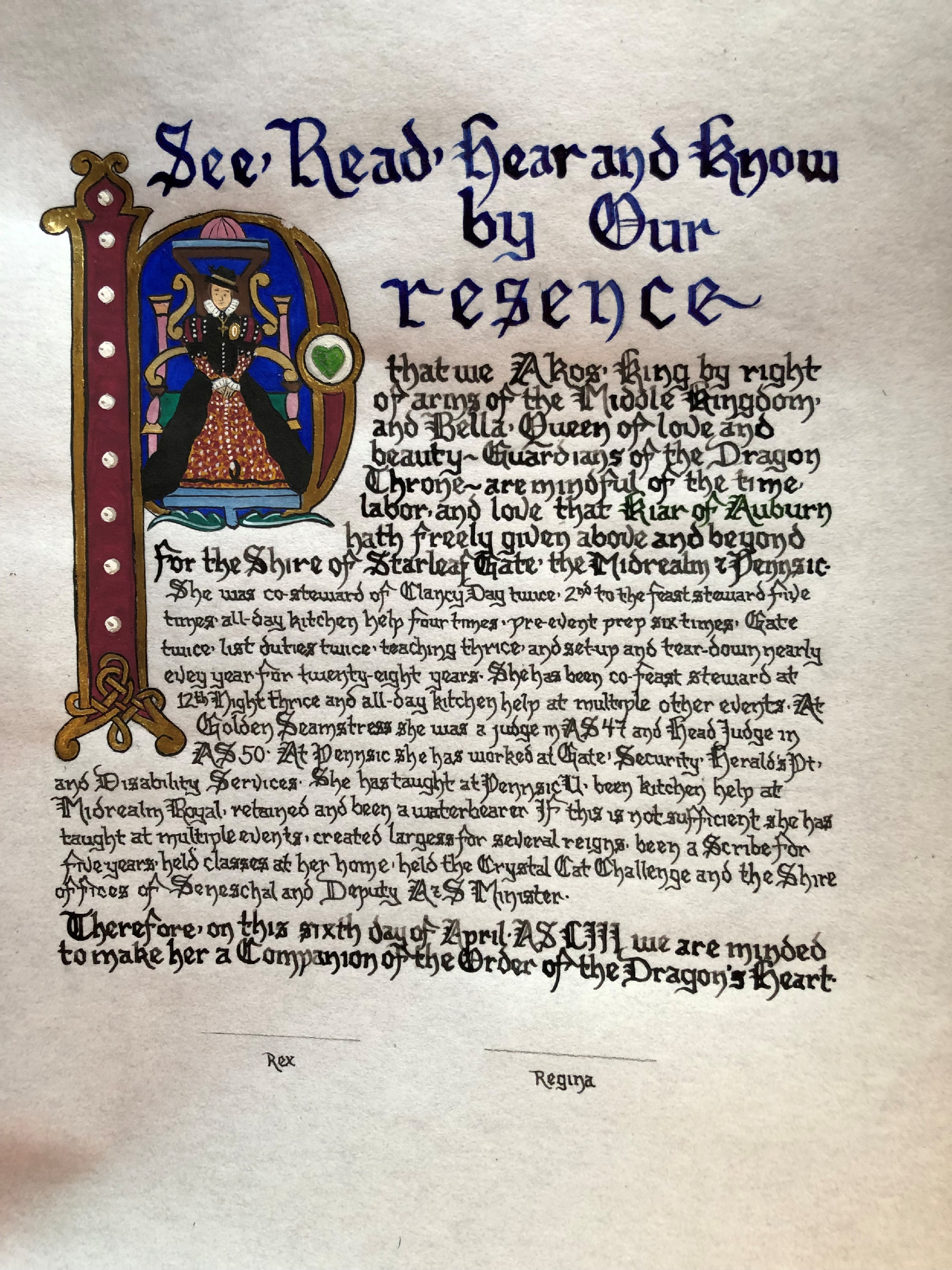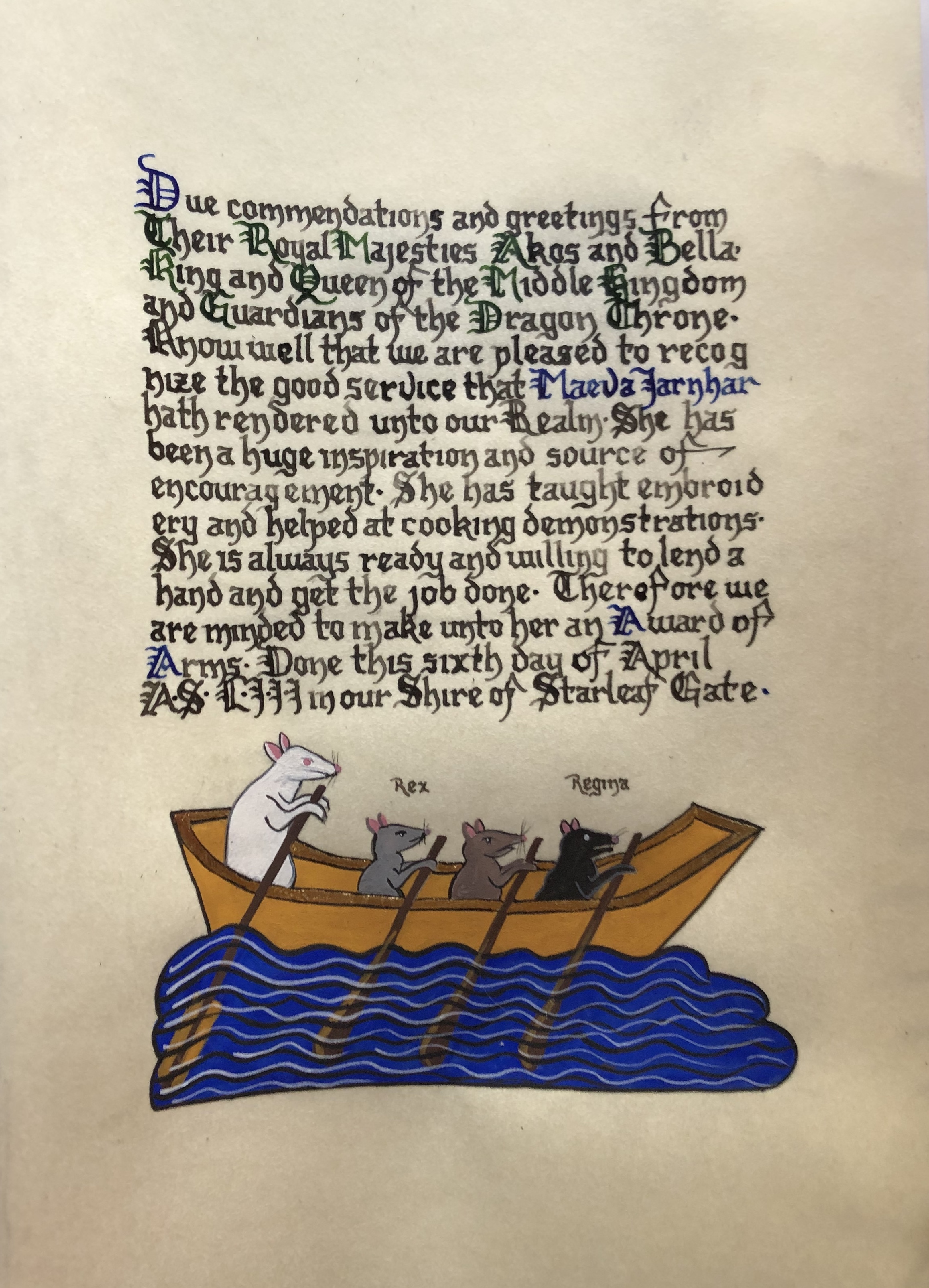 The SCA has a tradition of the giving of illuminated manuscripts for their awards. (The Middle Kingdom - Midrealm provides a scroll with each award bestowed by the Crown.) Examples of these produced by the hand of Baroness Alianor bat Asriel (known as Lady Aliyah) and The Honorable Lady SaehildR barngodR are below: