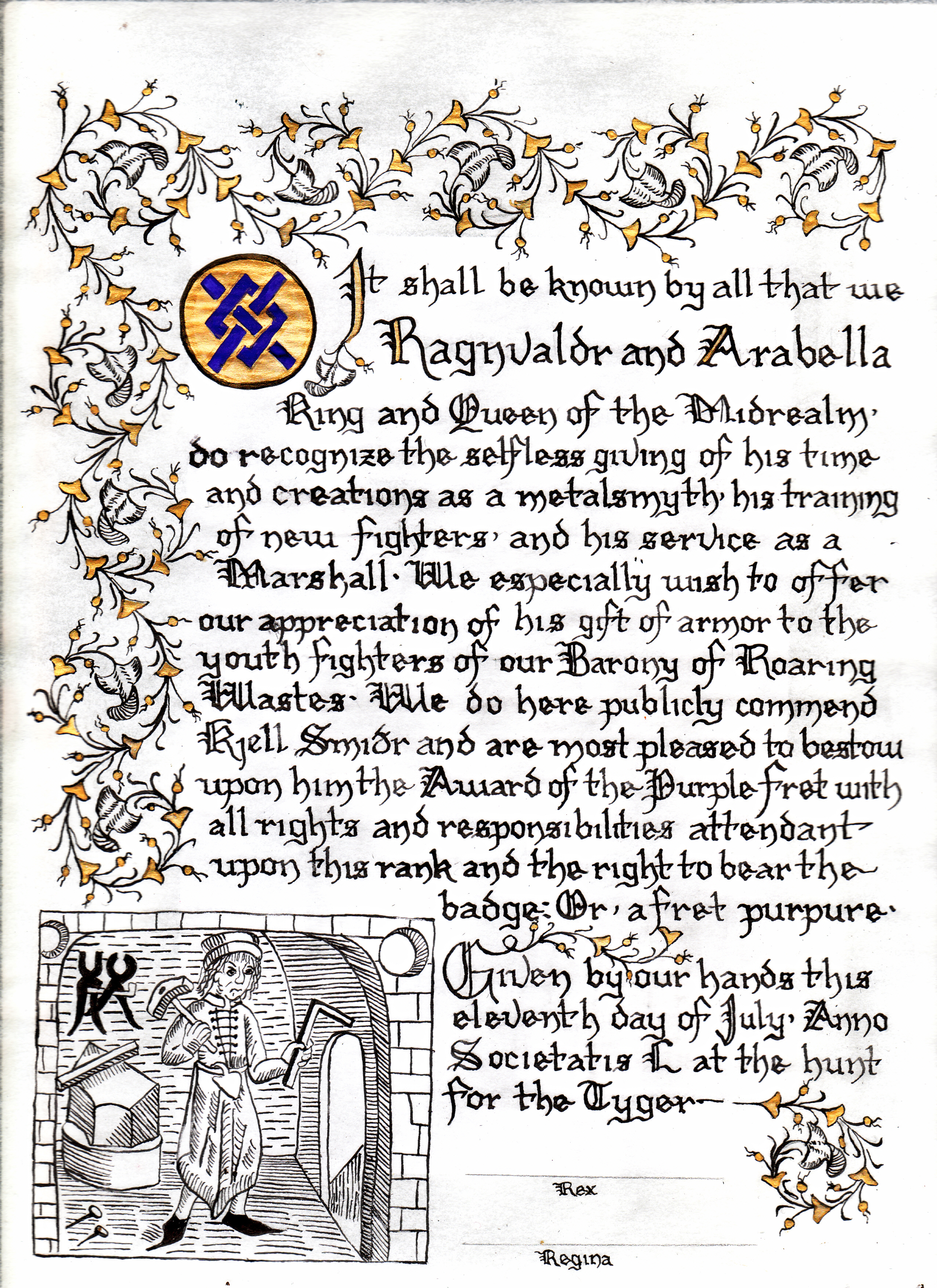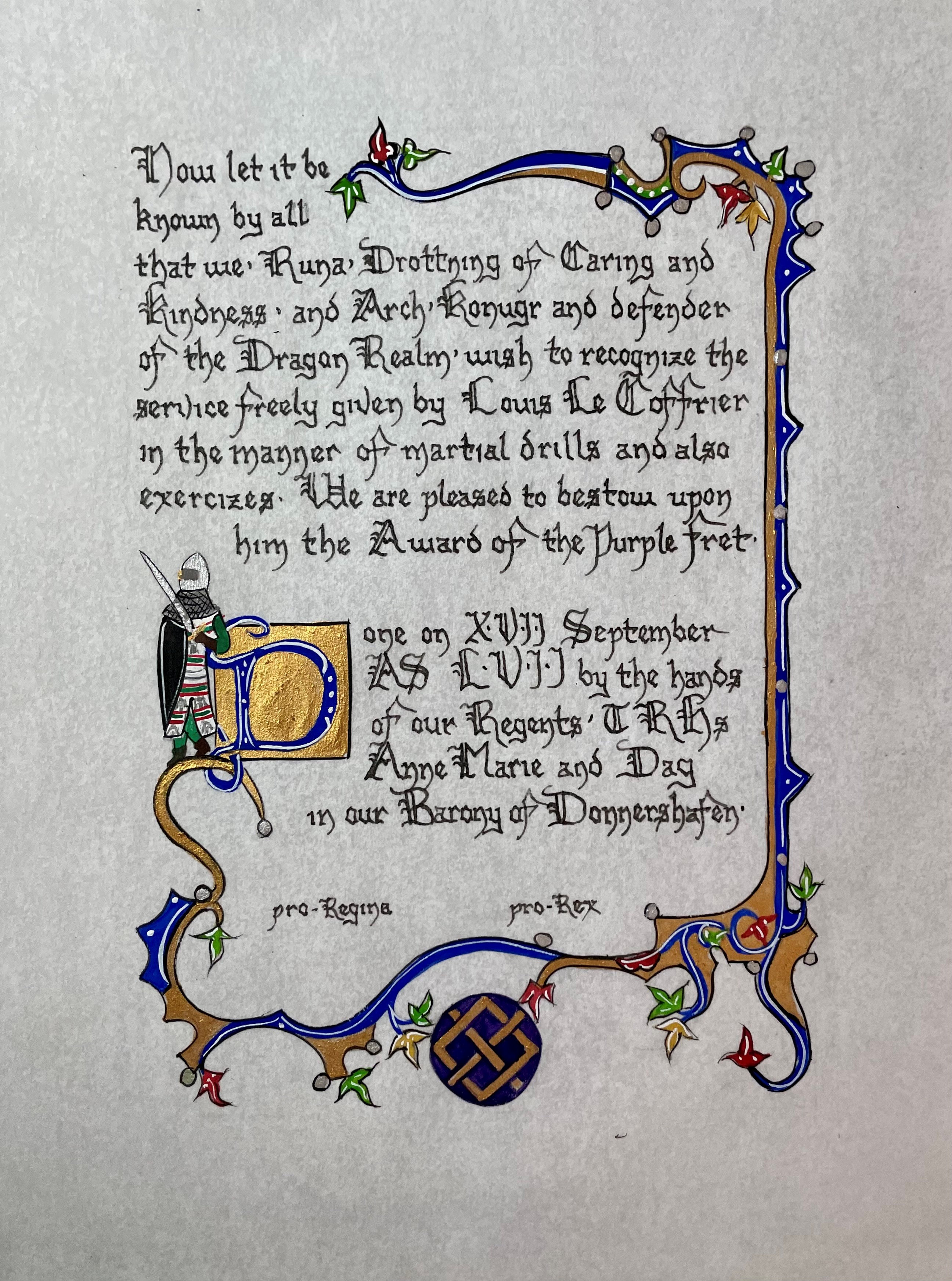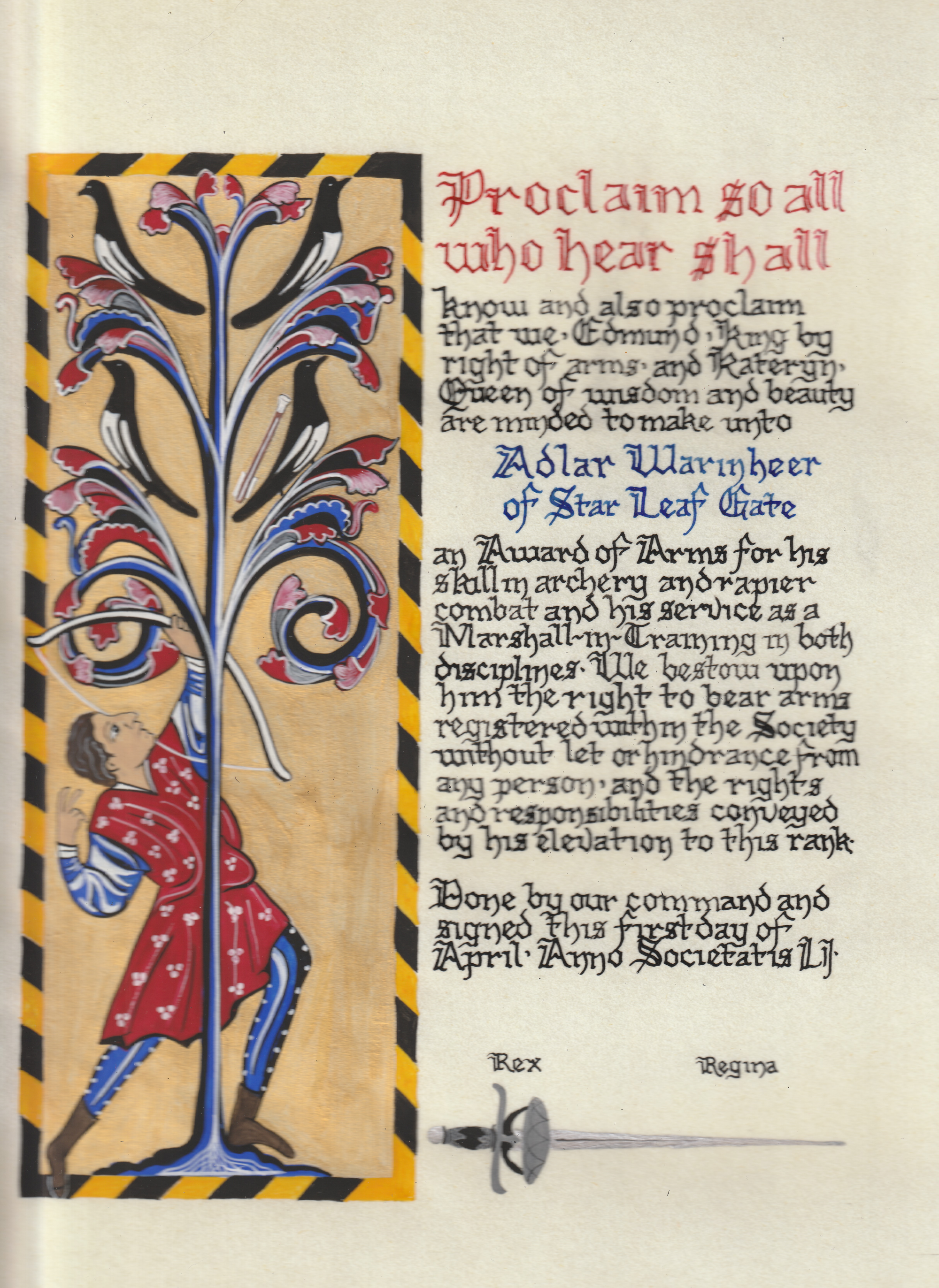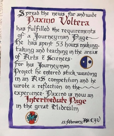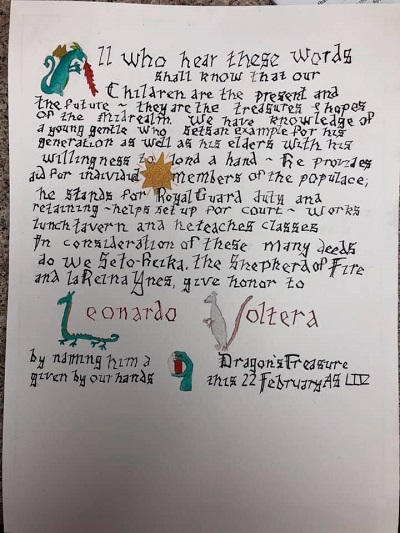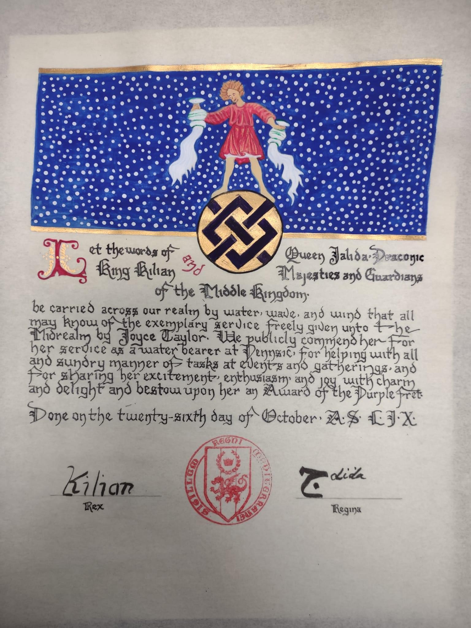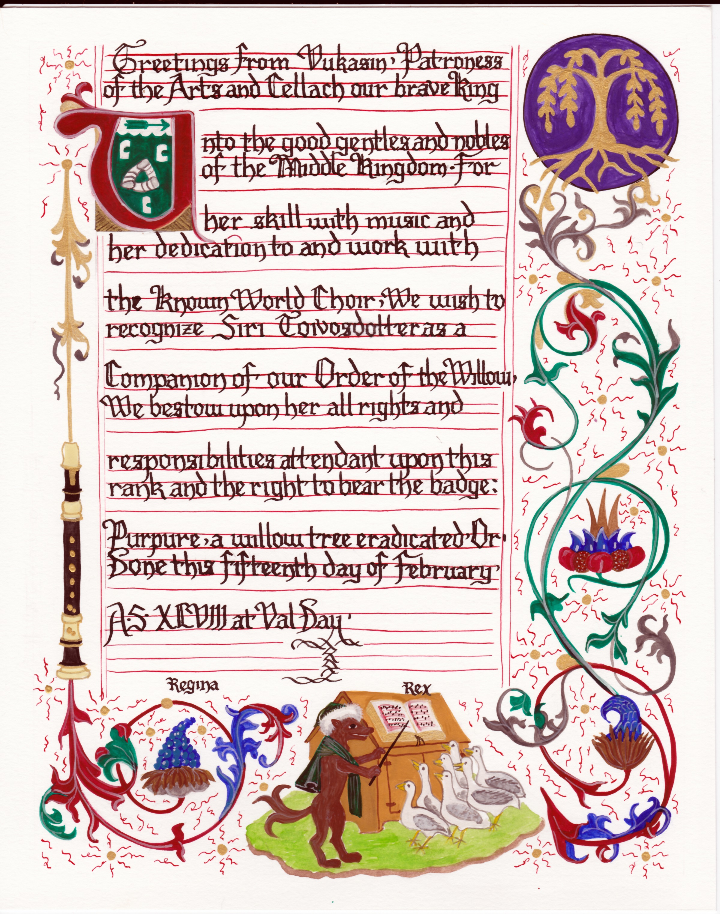 The SCA has a tradition of the giving of illuminated manuscripts for their awards. (The Middle Kingdom - Midrealm provides a scroll with each award bestowed by the Crown.) Examples of these produced by the hand of Baroness Alianor bat Asriel (known as Lady Aliyah) and The Honorable Lady SaehildR barngodR are below: