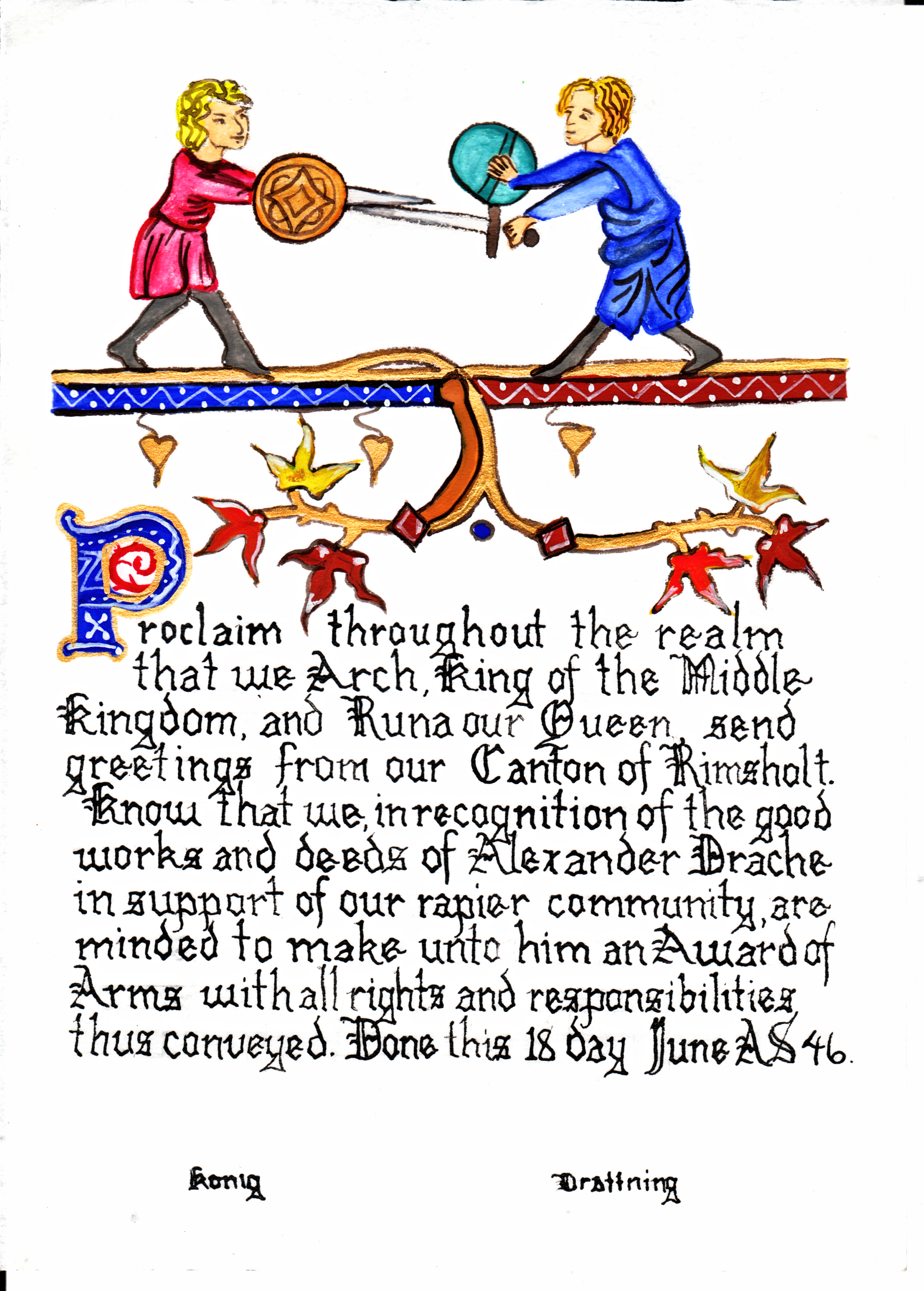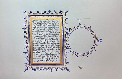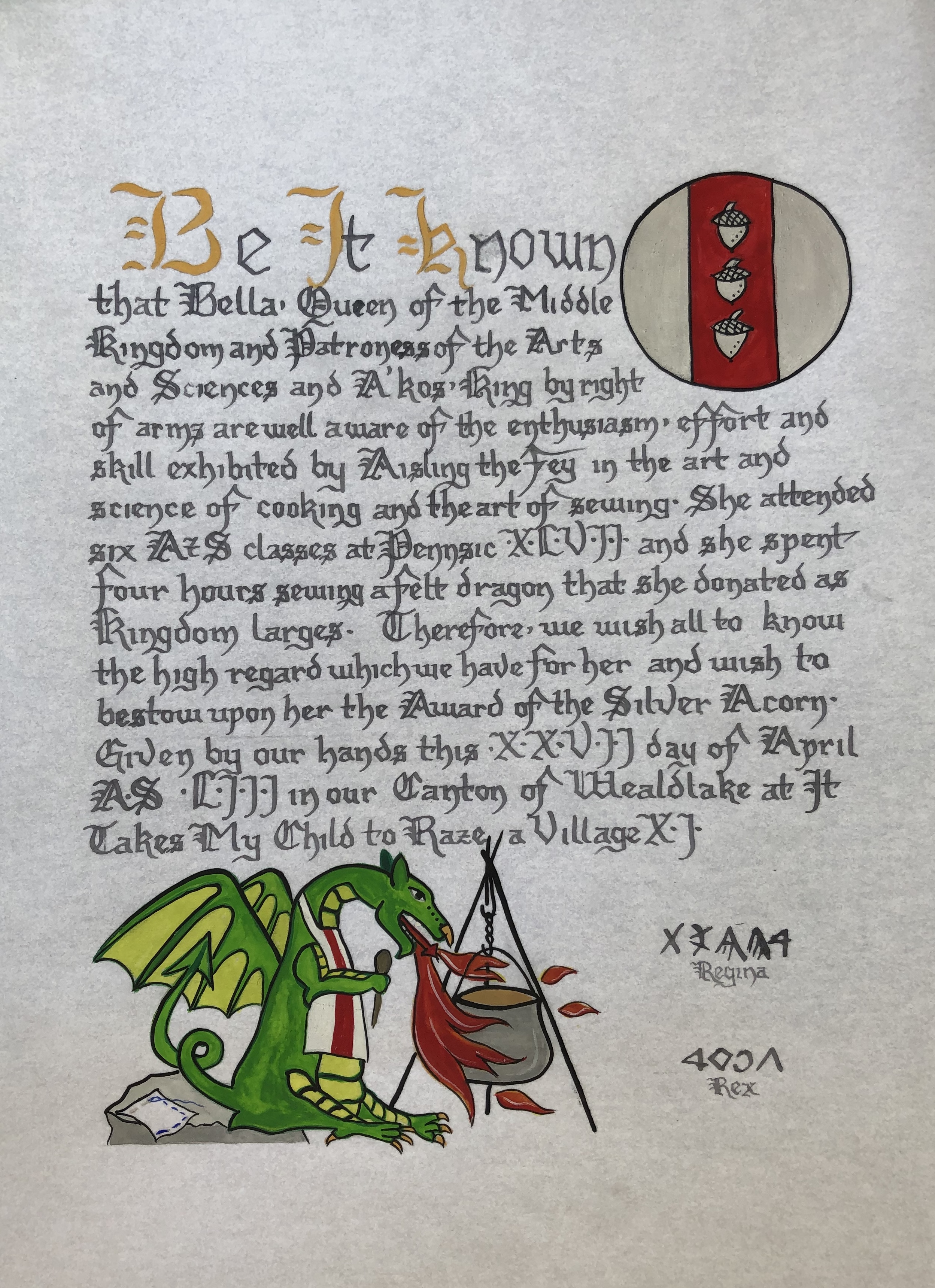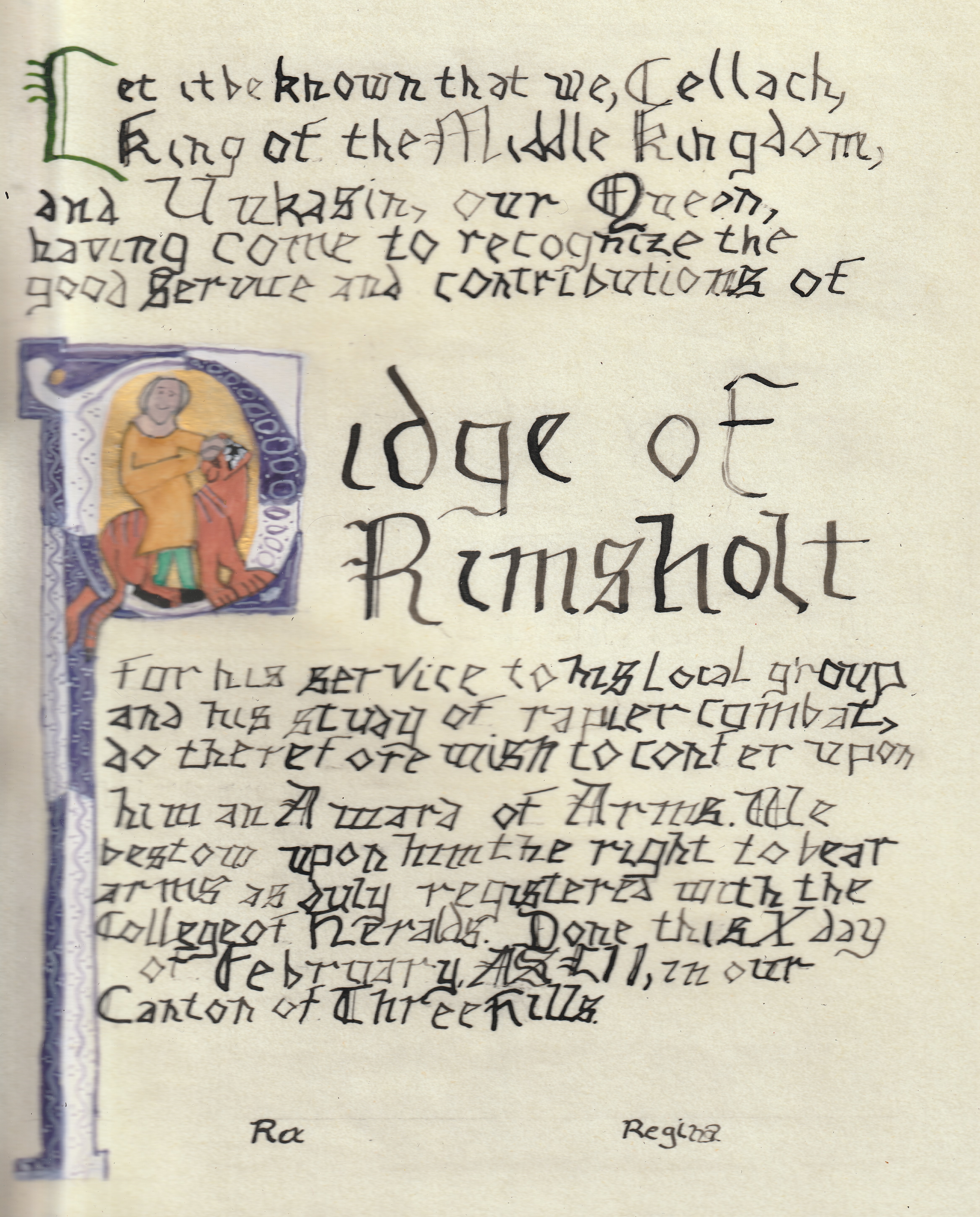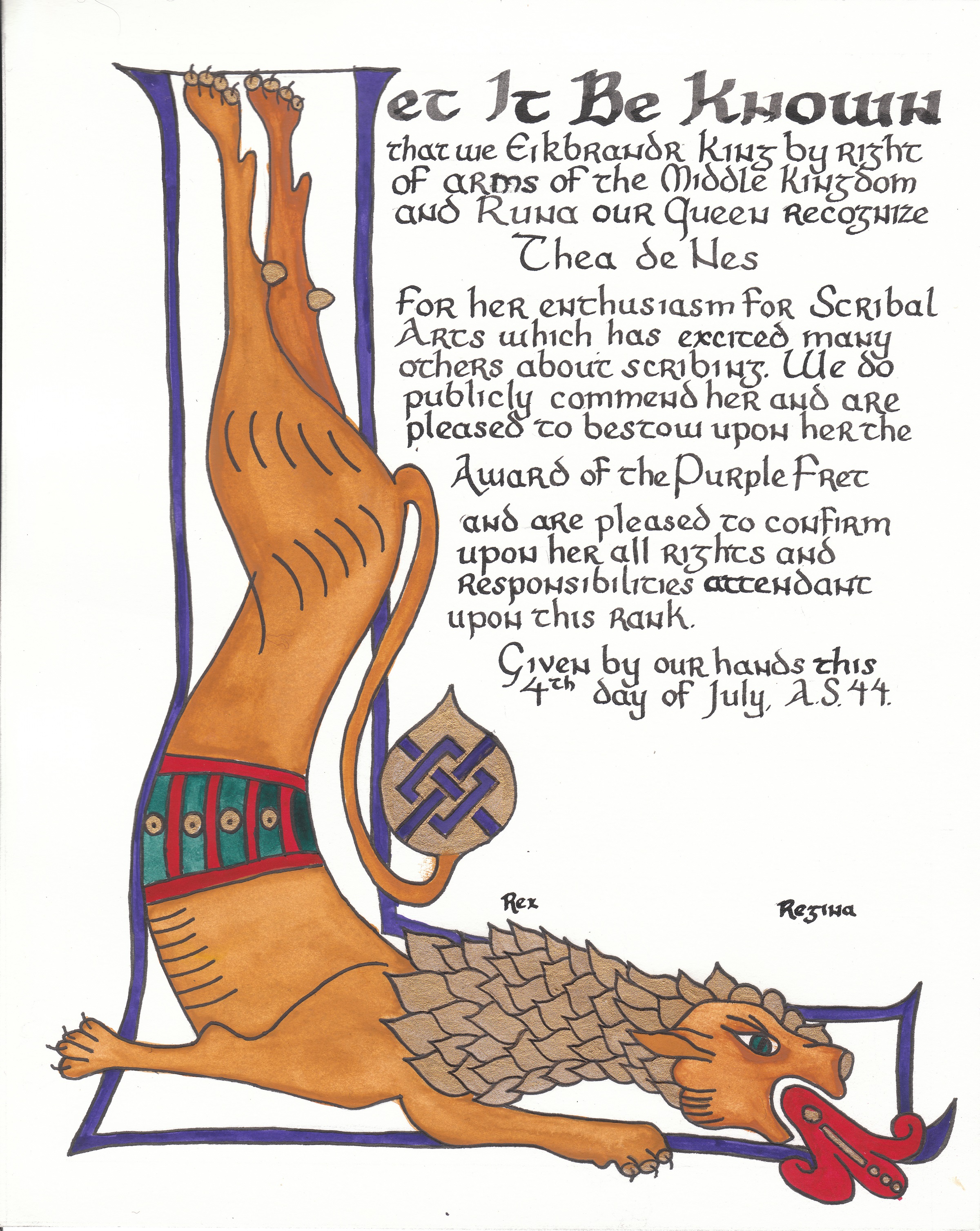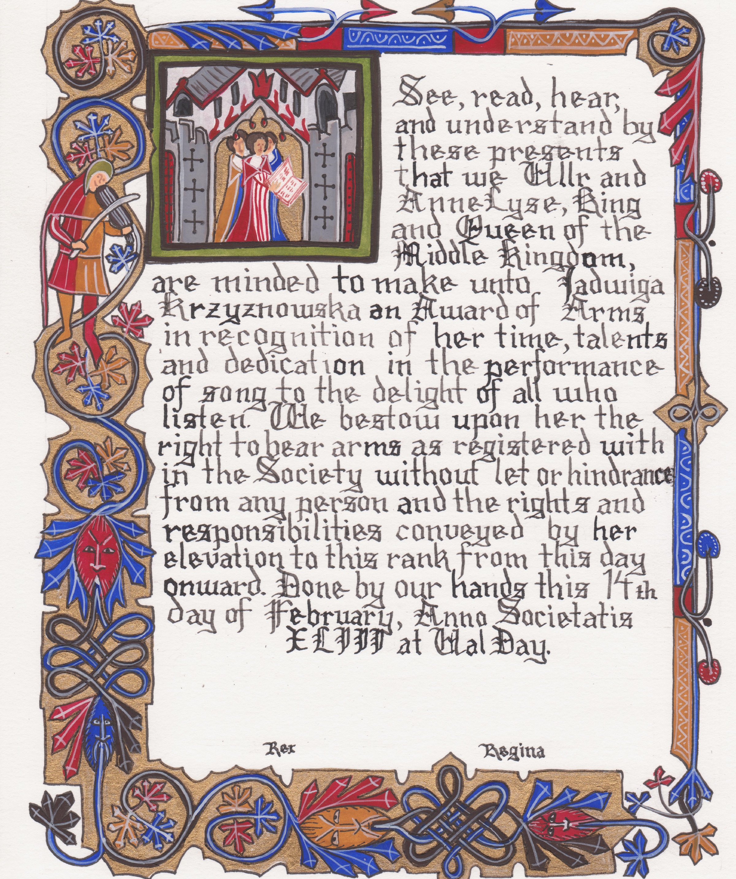 The SCA has a tradition of the giving of illuminated manuscripts for their awards. (The Middle Kingdom - Midrealm provides a scroll with each award bestowed by the Crown.) Examples of these produced by the hand of Baroness Alianor bat Asriel (known as Lady Aliyah) and The Honorable Lady SaehildR barngodR are below: