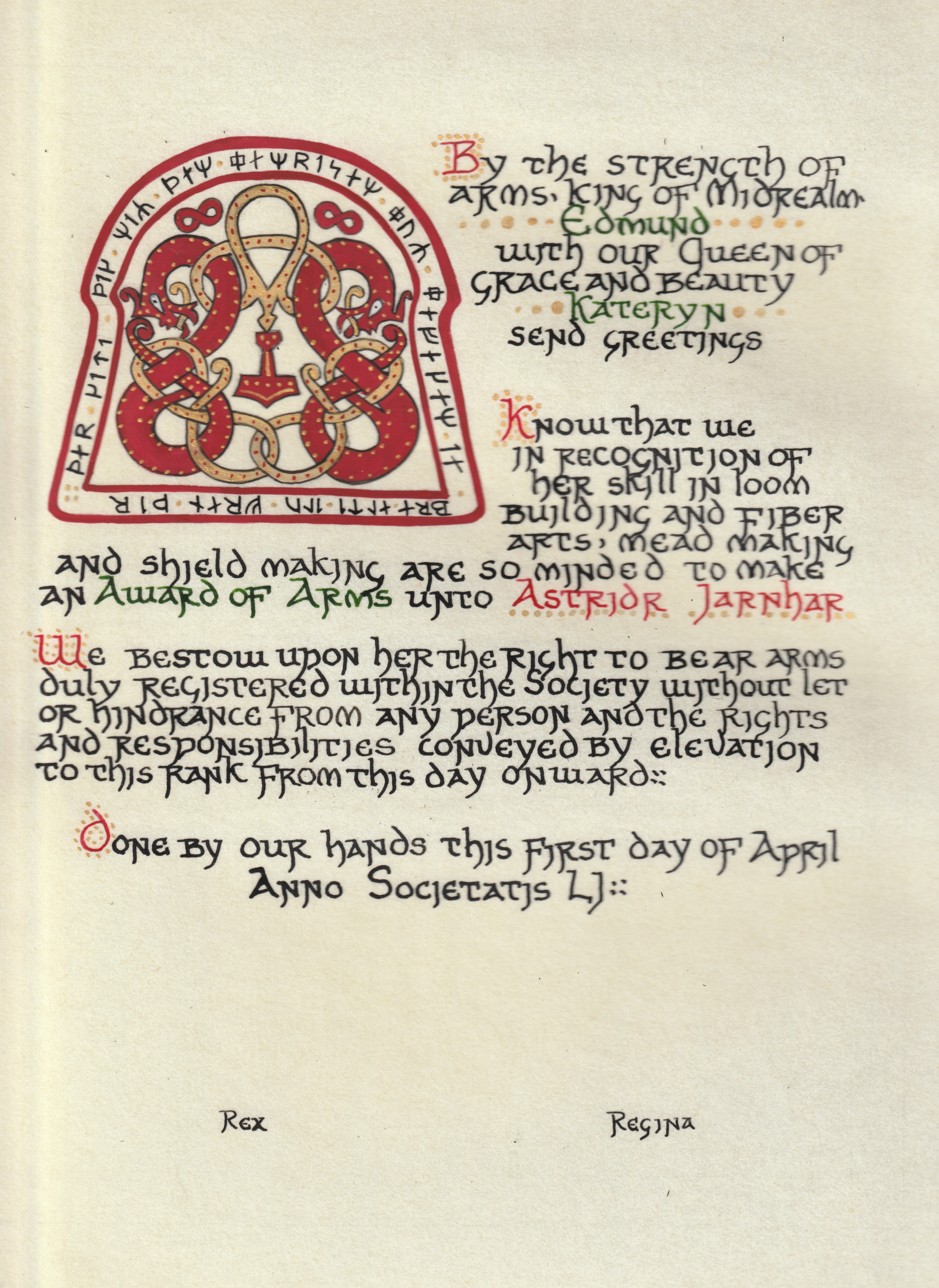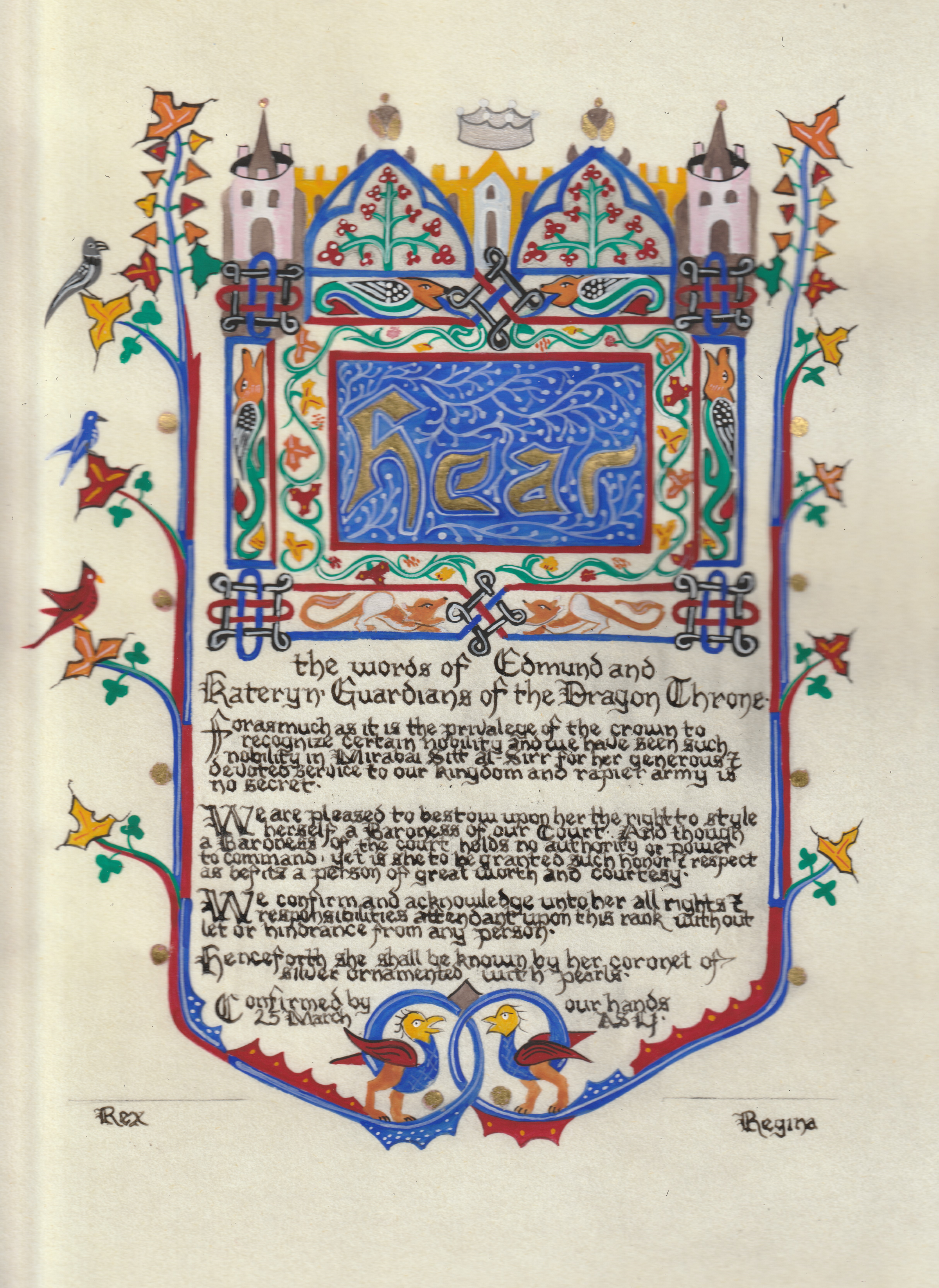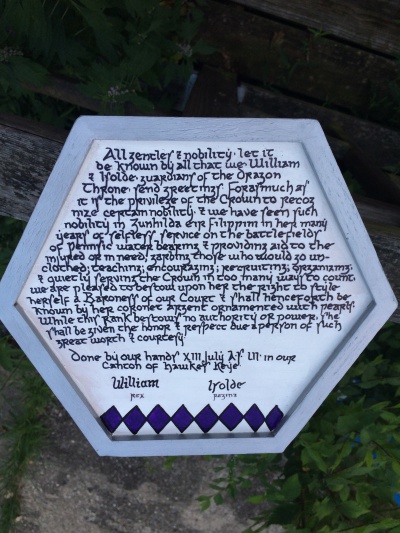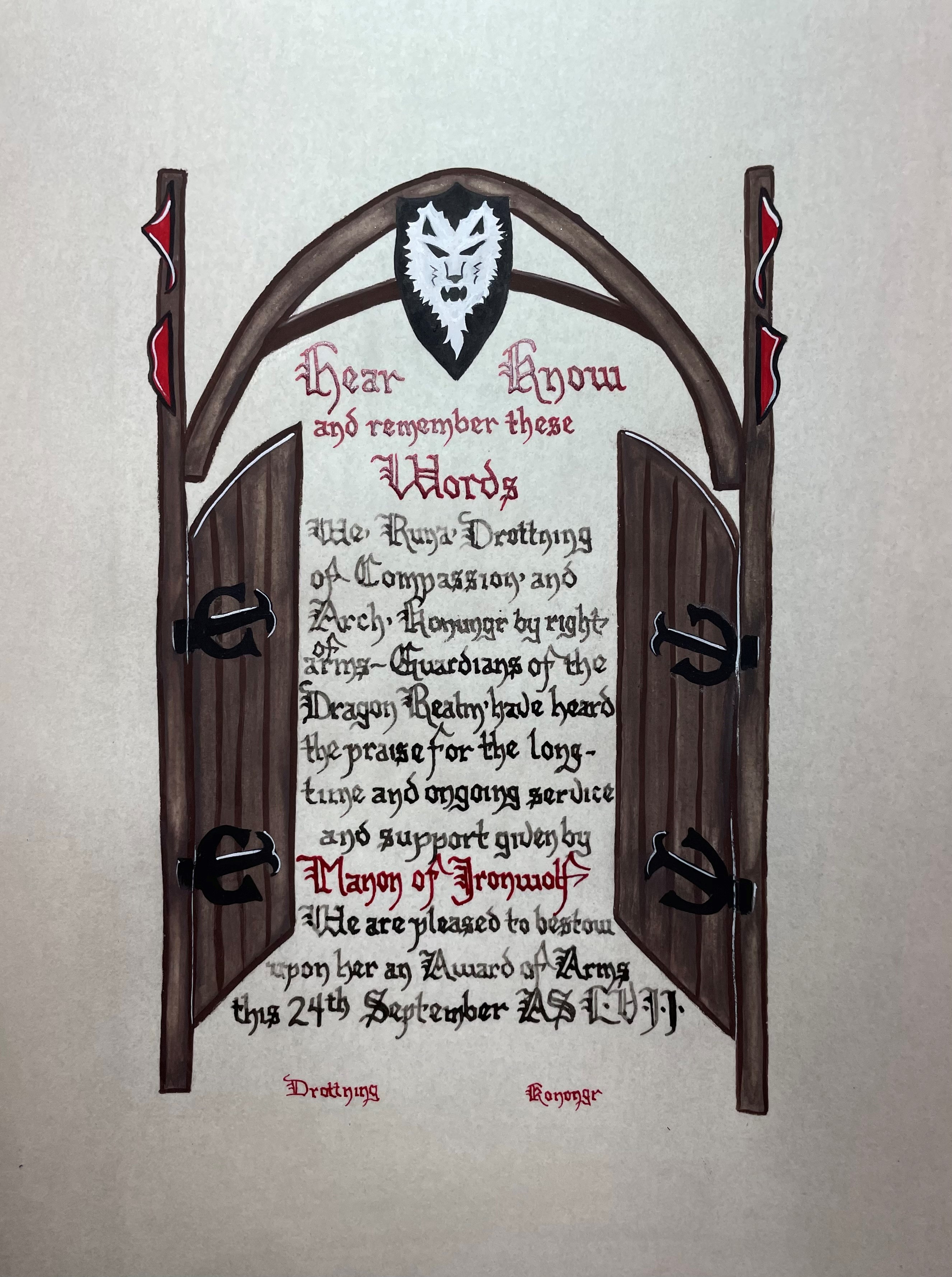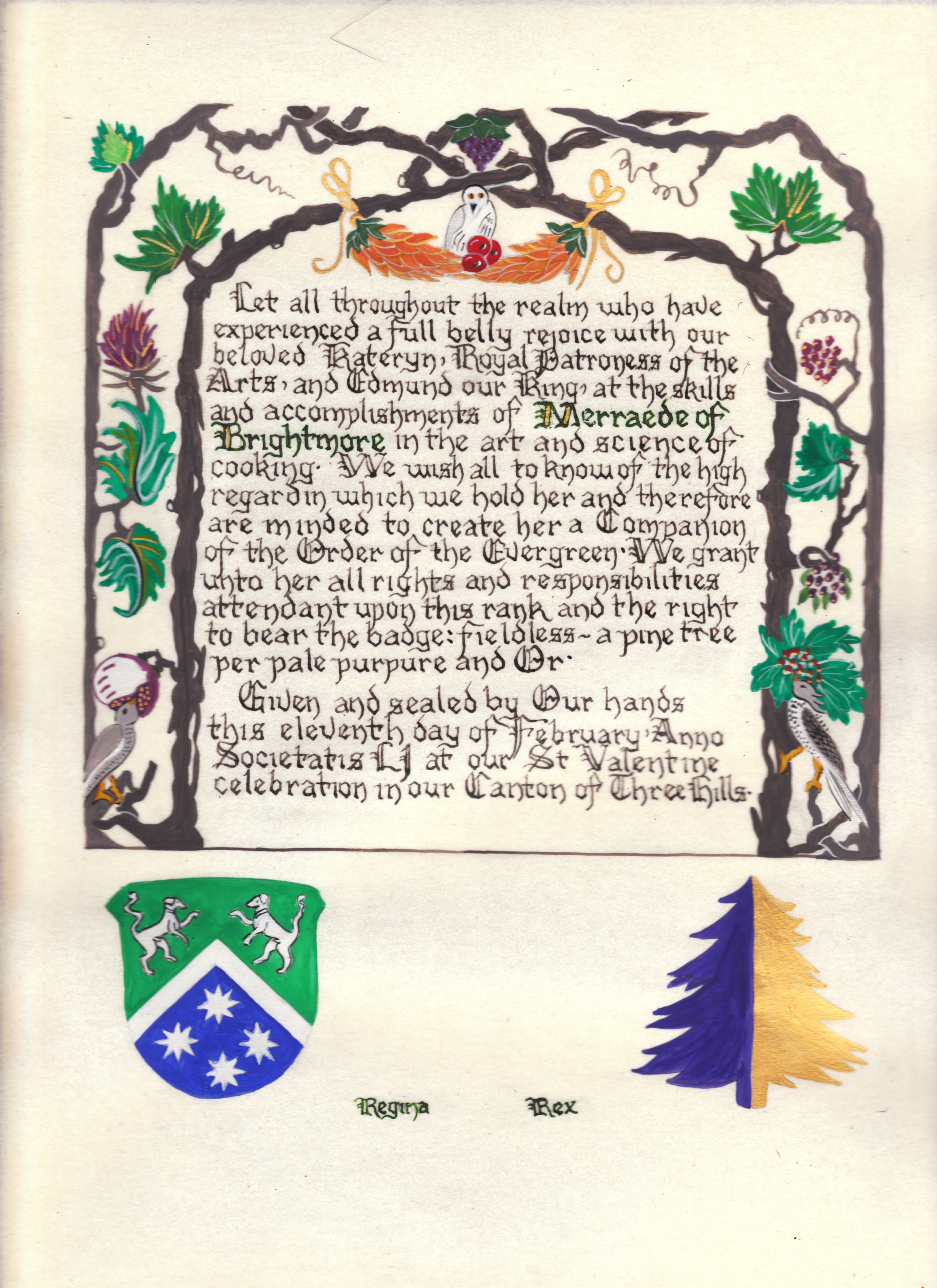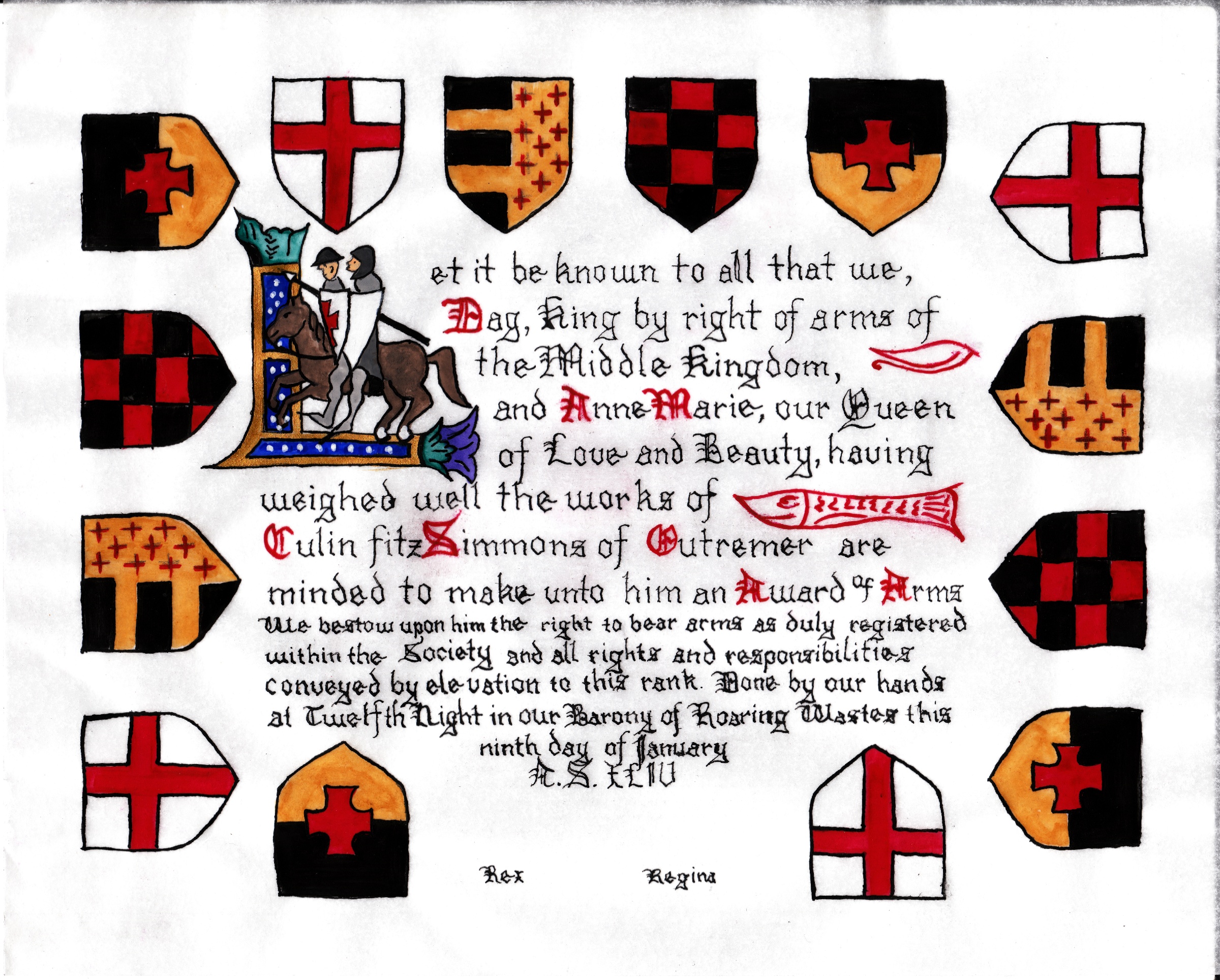 The SCA has a tradition of the giving of illuminated manuscripts for their awards. (The Middle Kingdom - Midrealm provides a scroll with each award bestowed by the Crown.) Examples of these produced by the hand of Baroness Alianor bat Asriel (known as Lady Aliyah) and The Honorable Lady SaehildR barngodR are below: