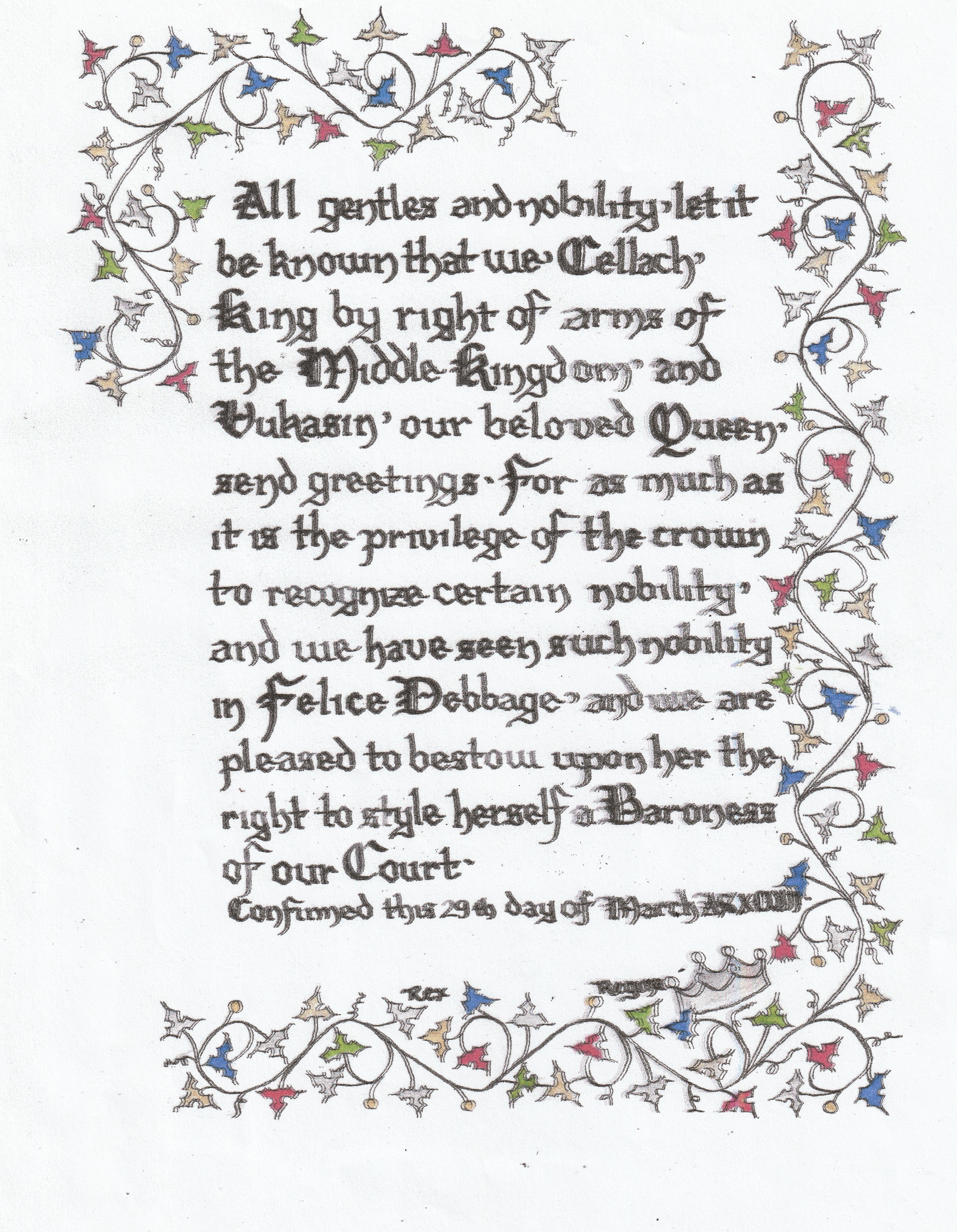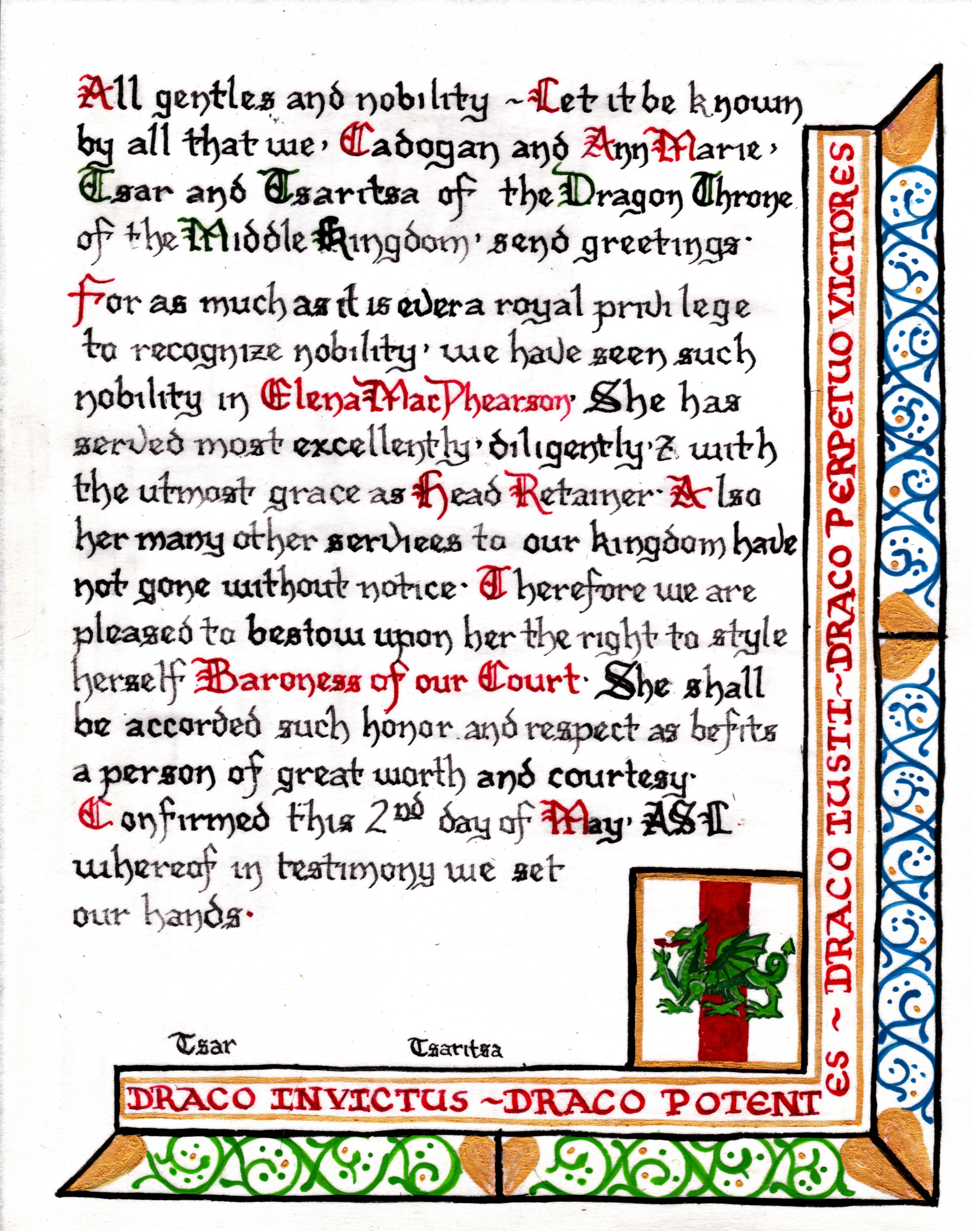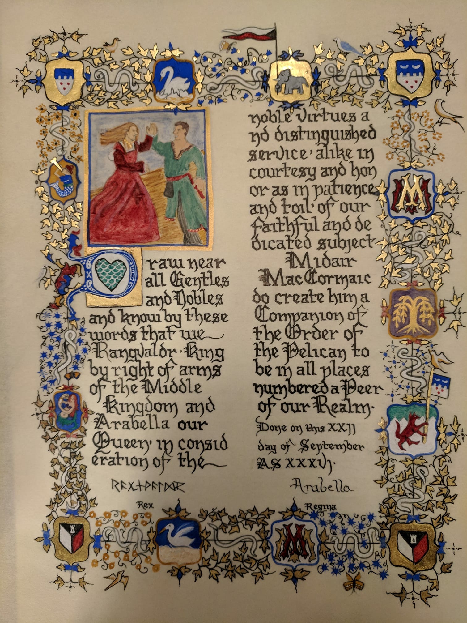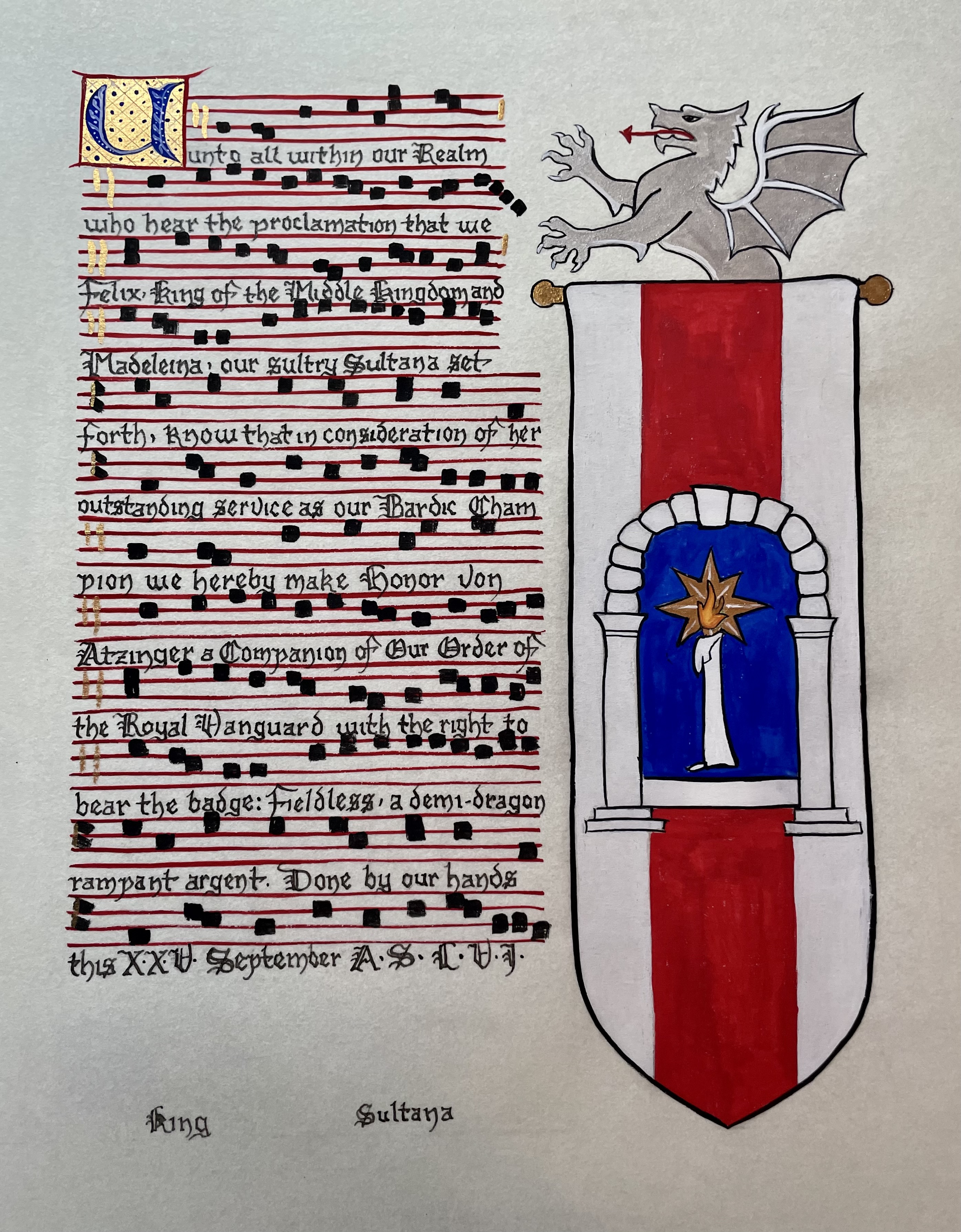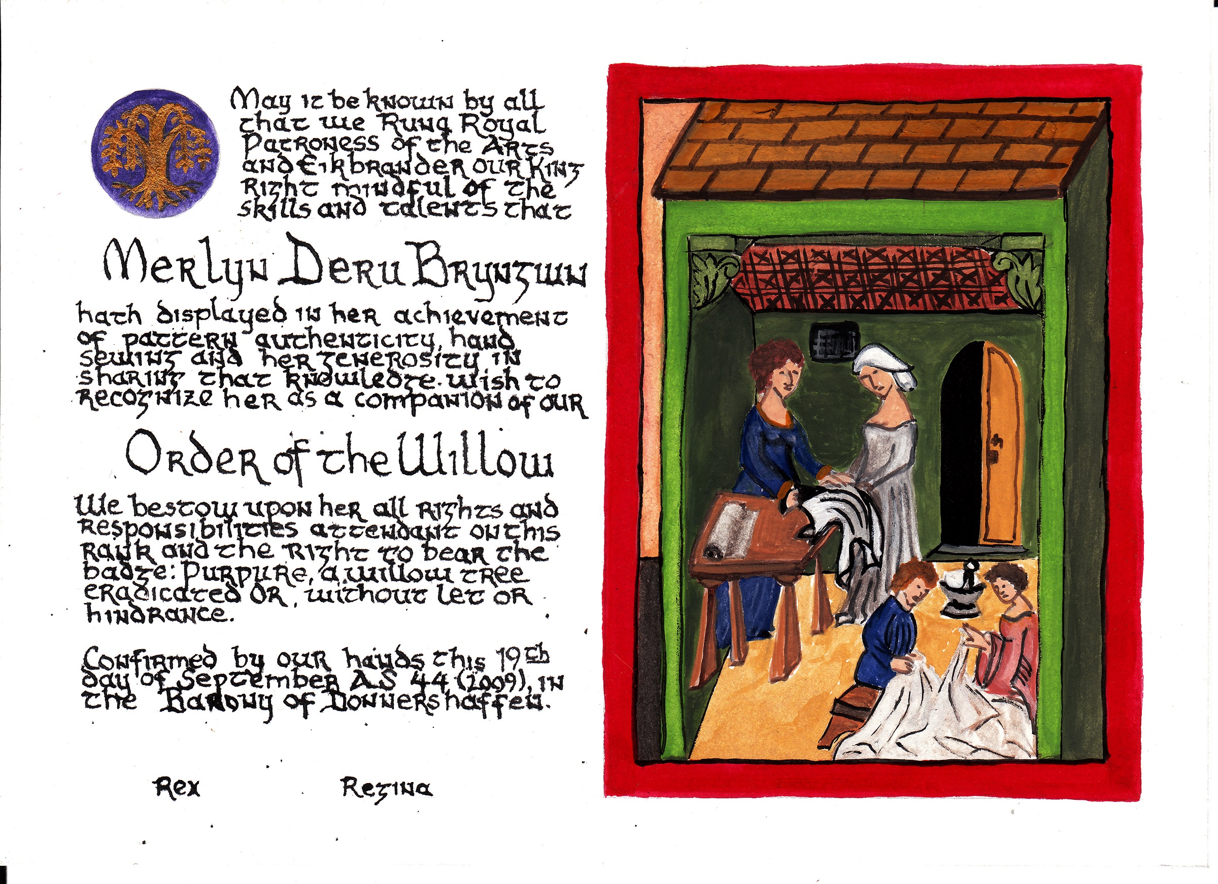 The SCA has a tradition of the giving of illuminated manuscripts for their awards. (The Middle Kingdom - Midrealm provides a scroll with each award bestowed by the Crown.) Examples of these produced by the hand of Baroness Alianor bat Asriel (known as Lady Aliyah) and The Honorable Lady SaehildR barngodR are below:
