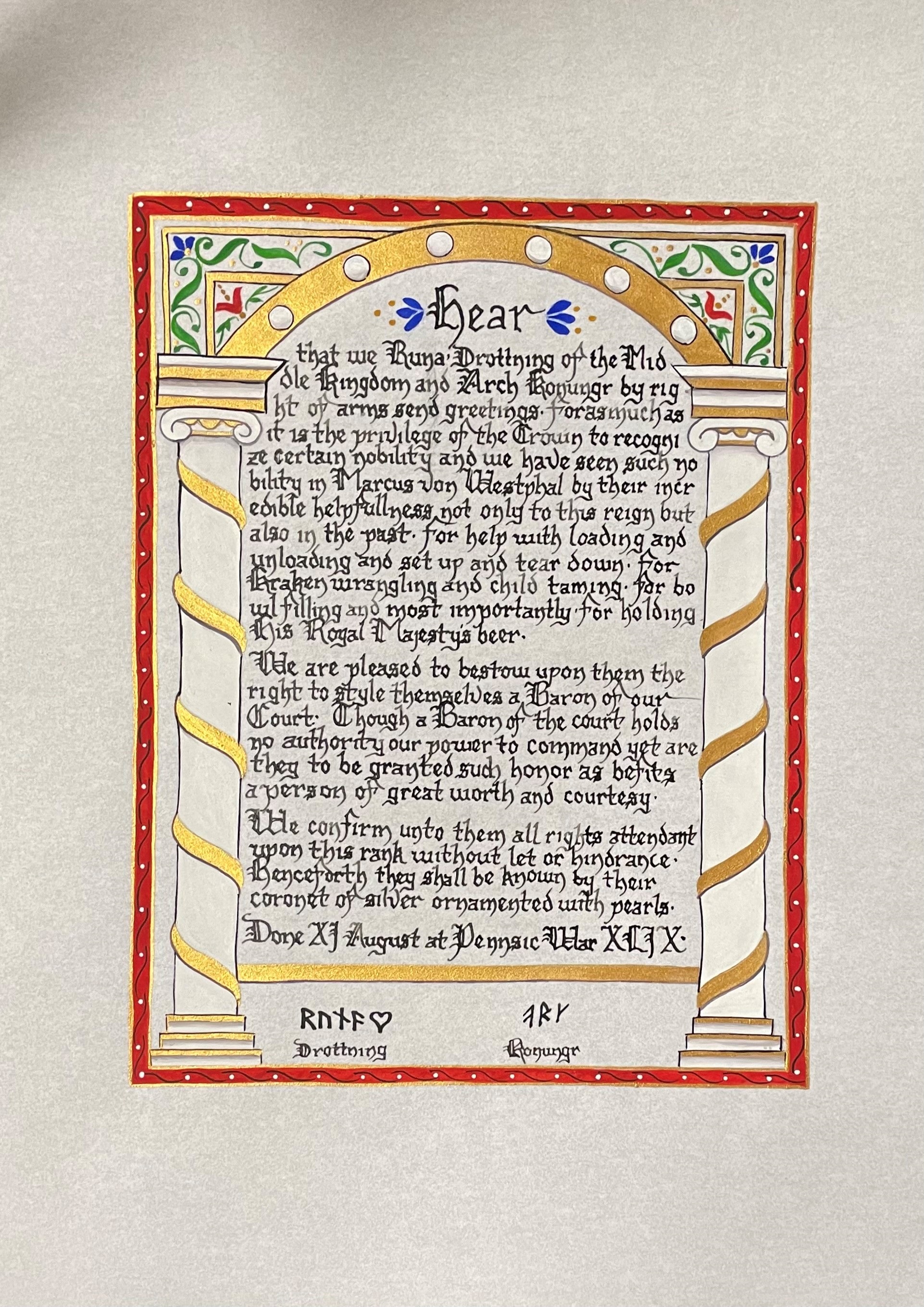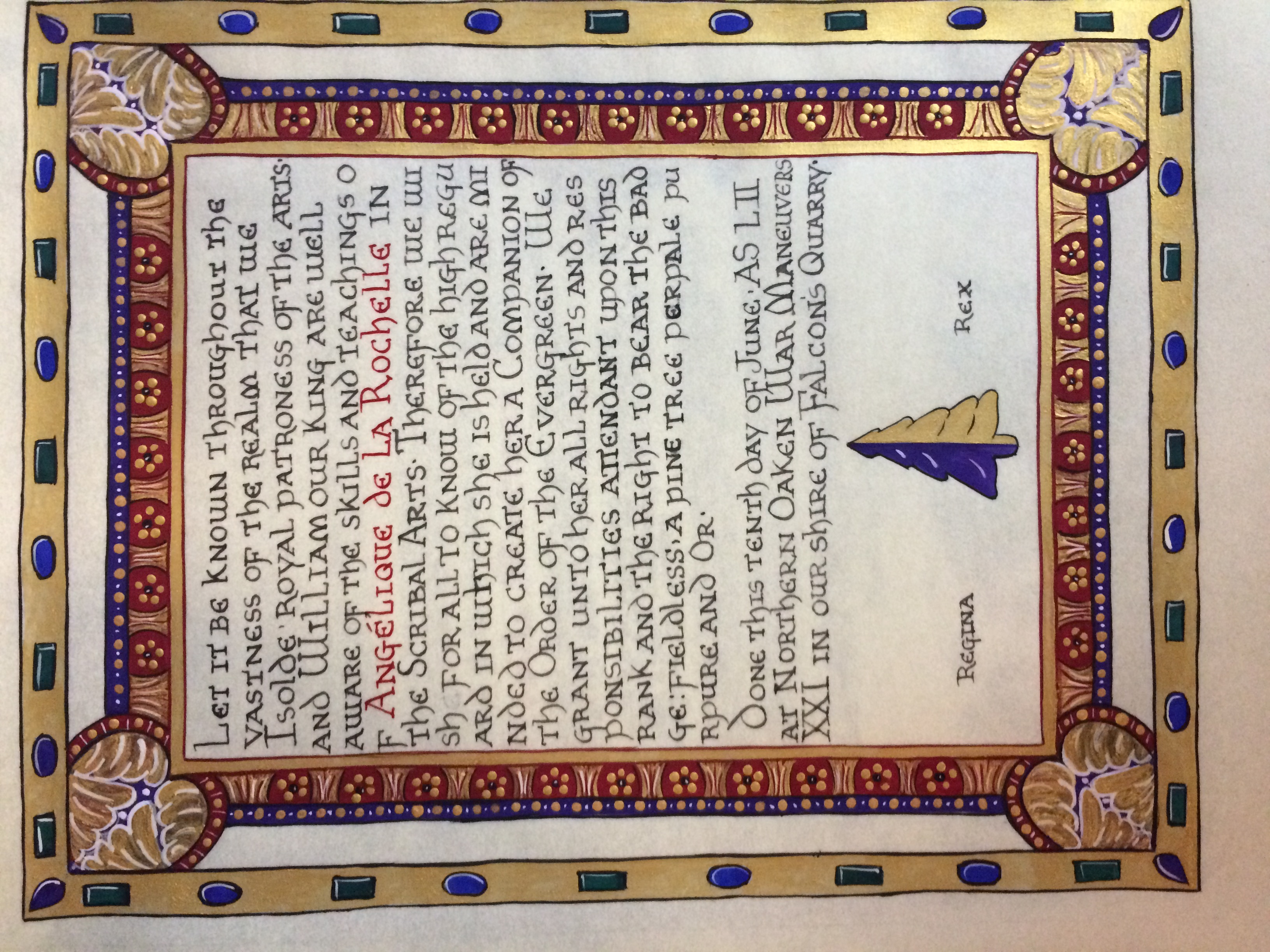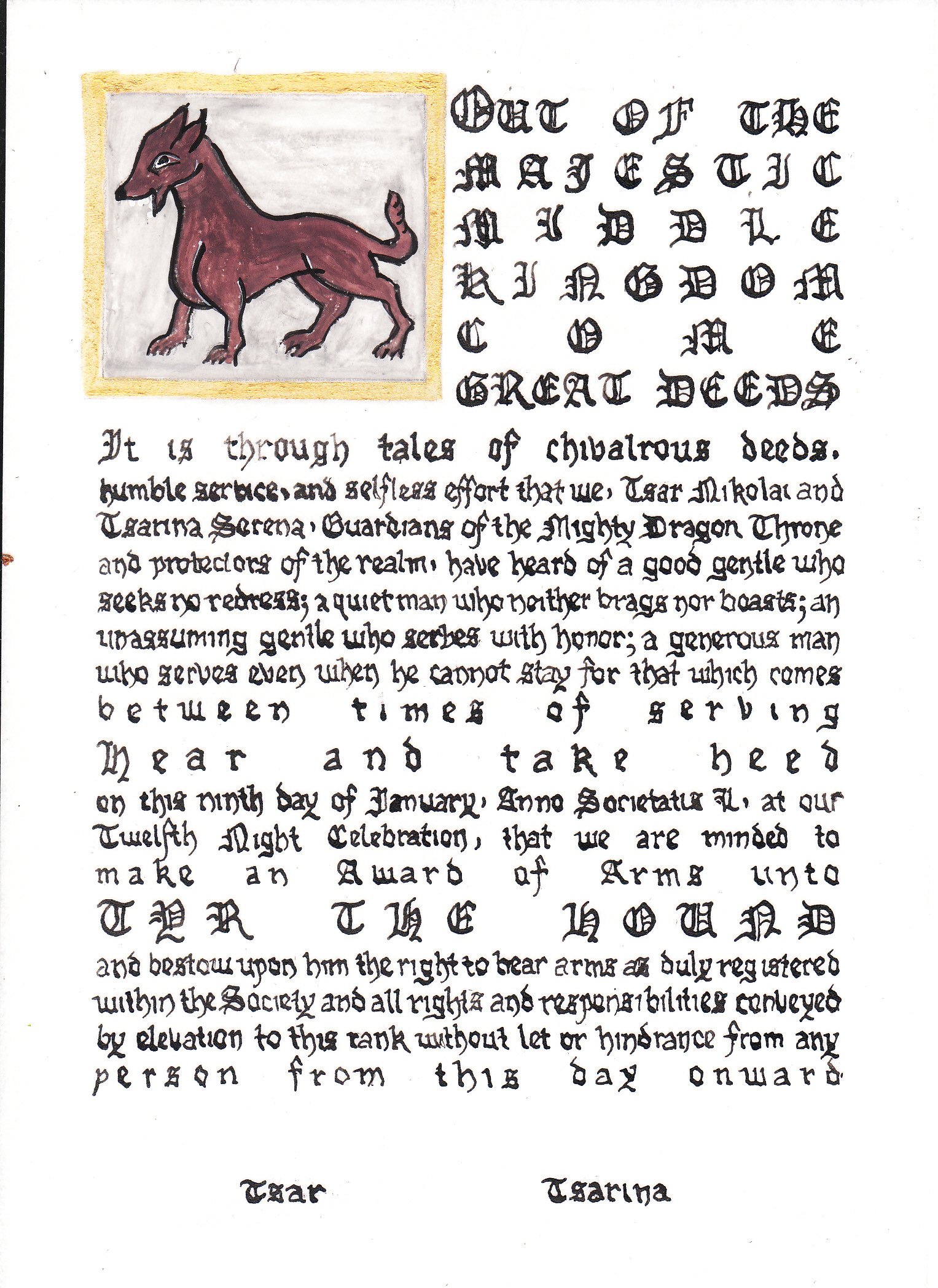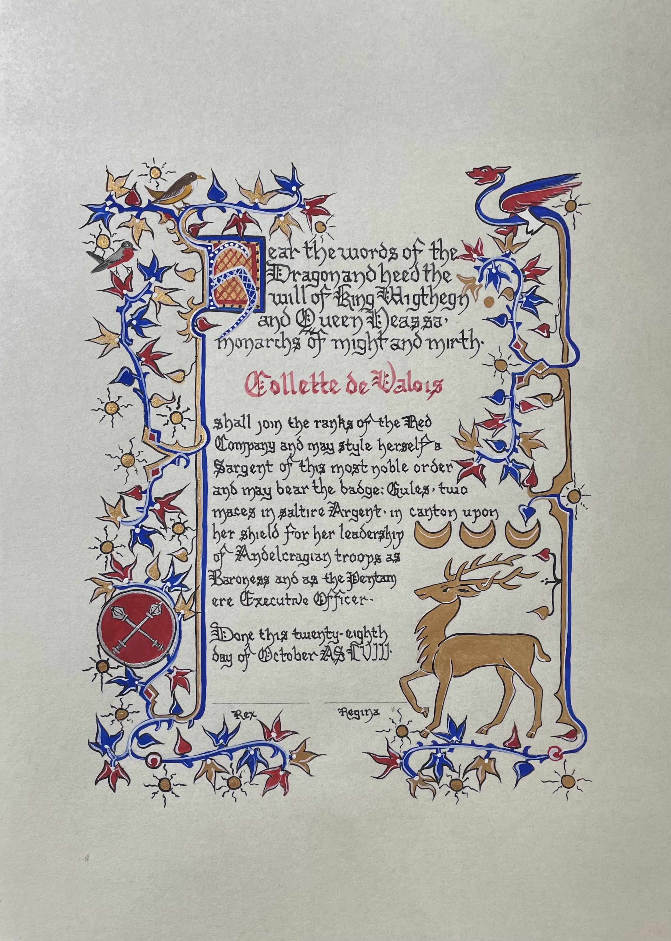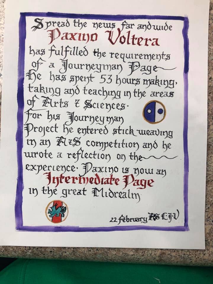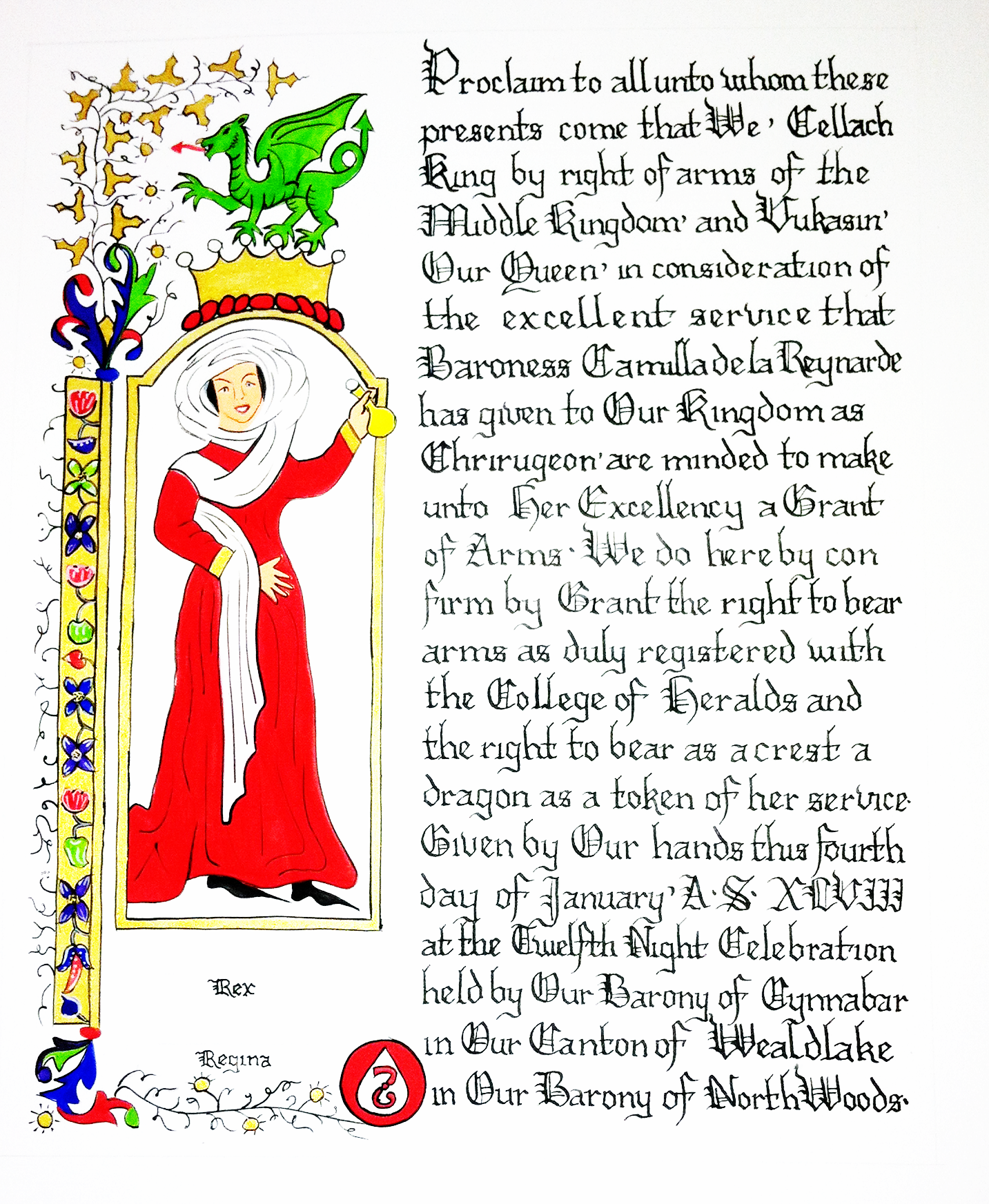 The SCA has a tradition of the giving of illuminated manuscripts for their awards. (The Middle Kingdom - Midrealm provides a scroll with each award bestowed by the Crown.) Examples of these produced by the hand of Baroness Alianor bat Asriel (known as Lady Aliyah) and The Honorable Lady SaehildR barngodR are below: