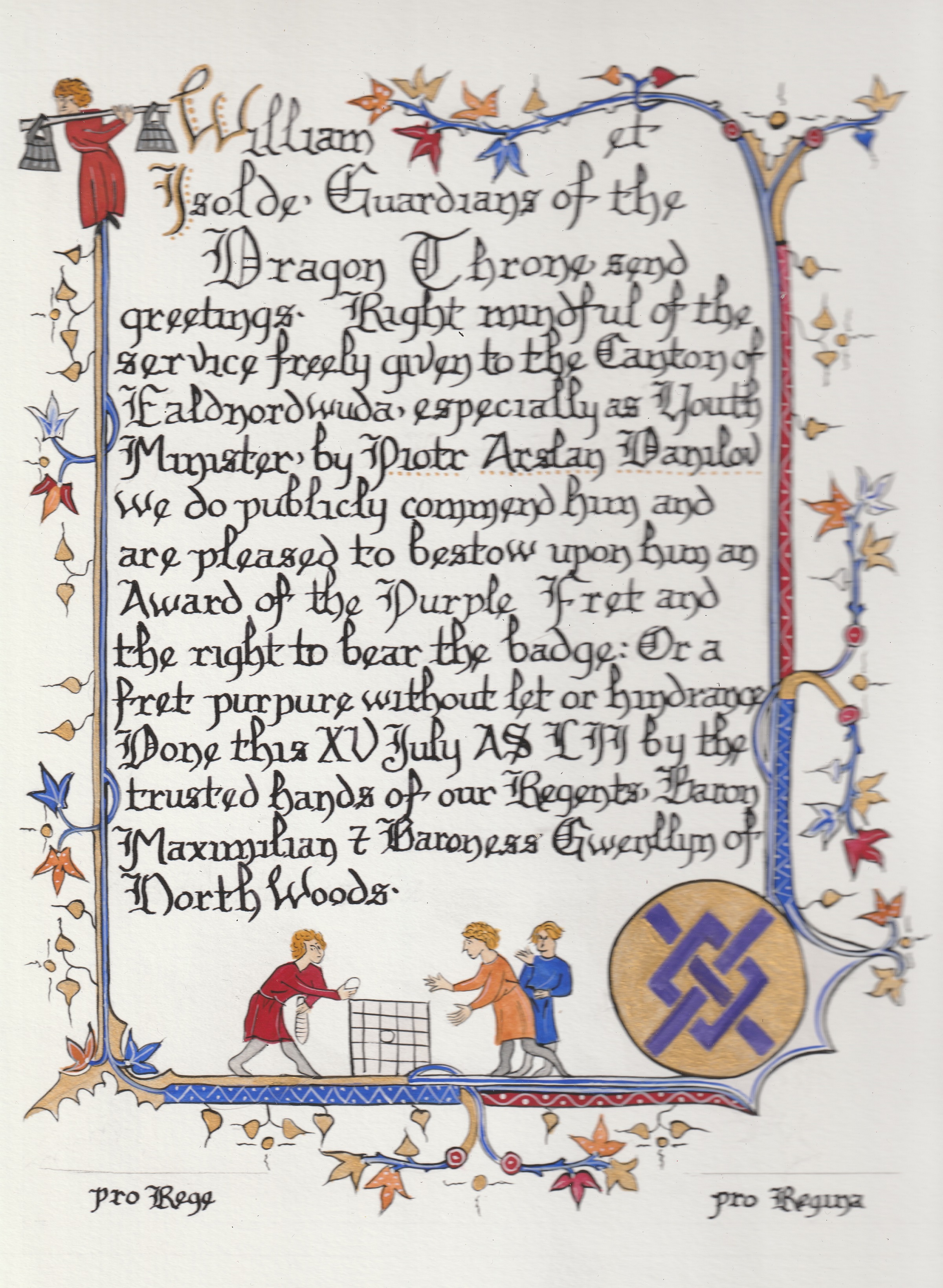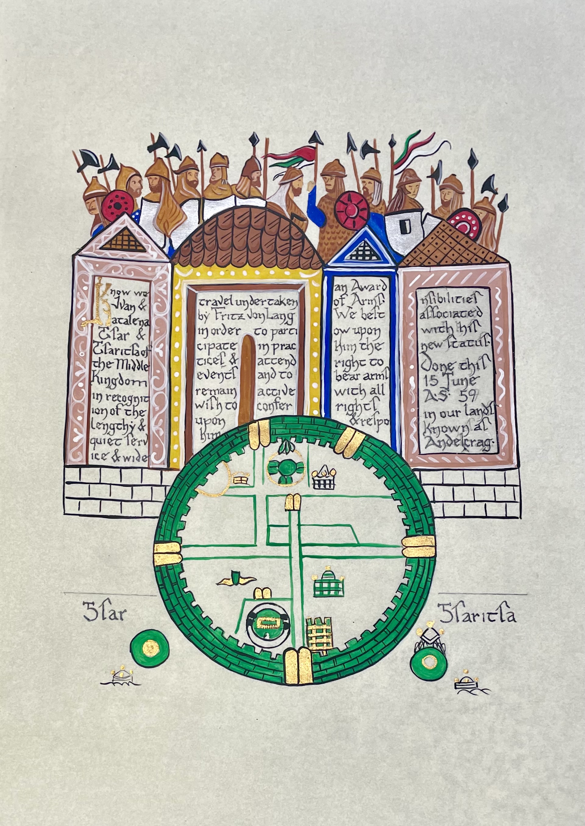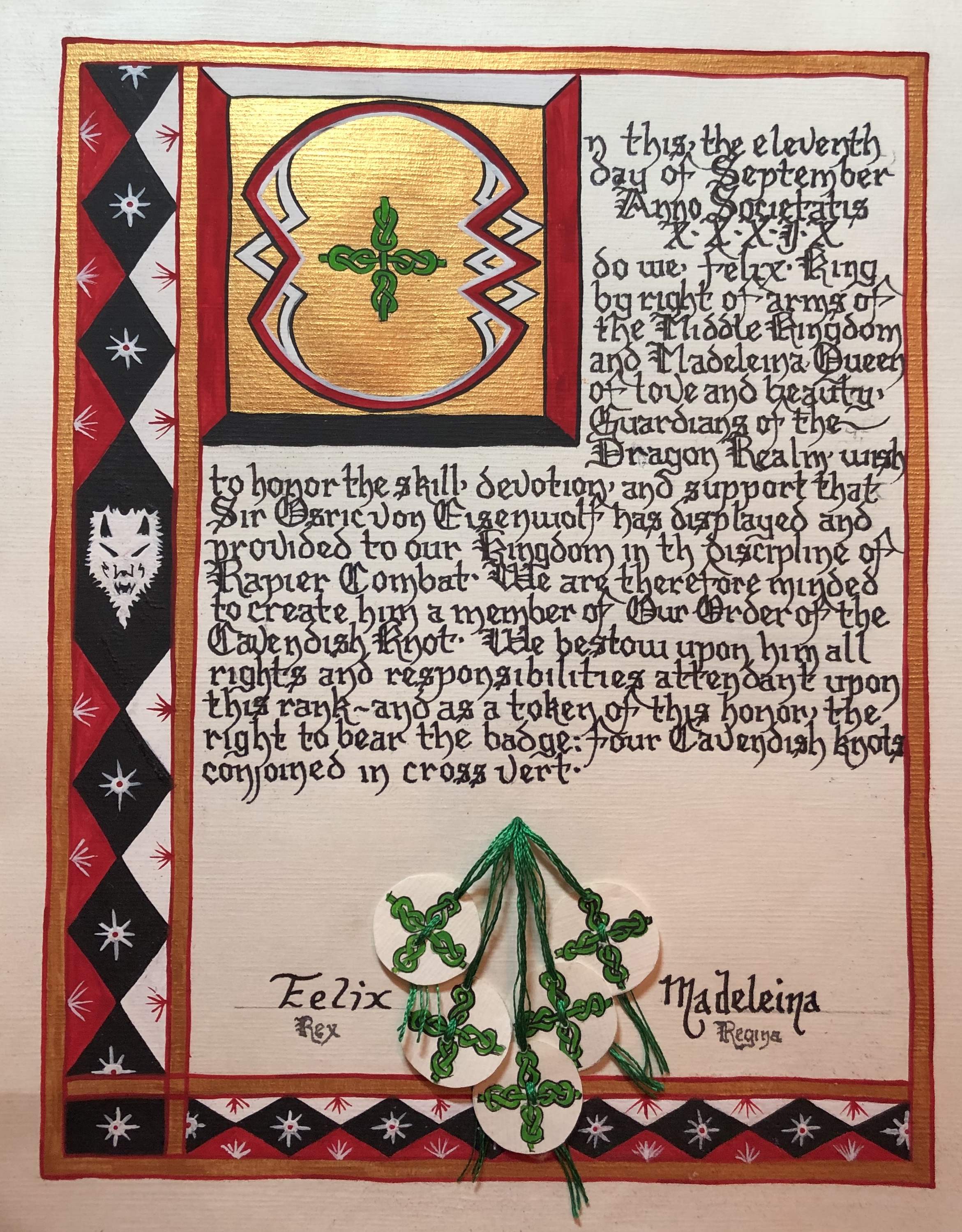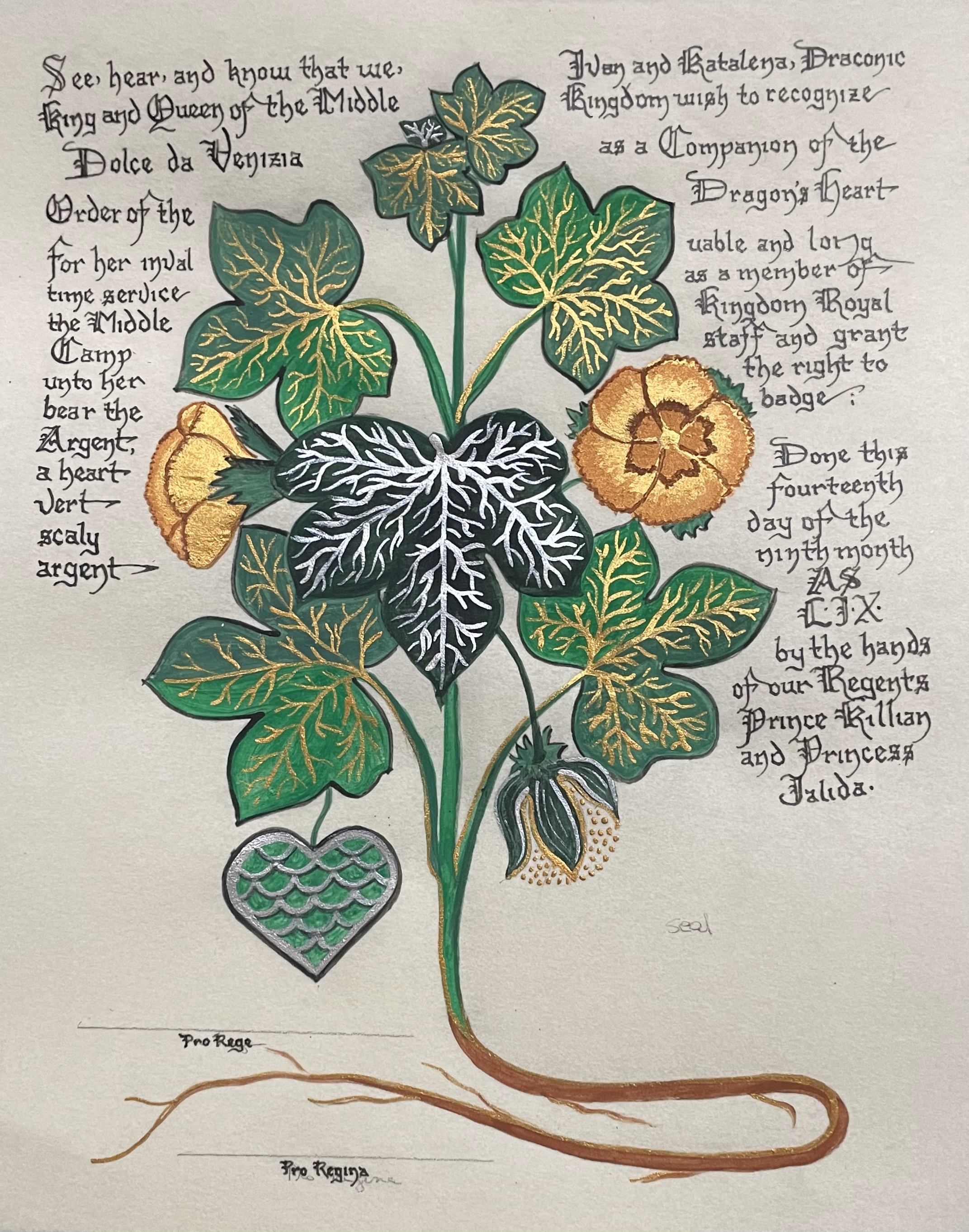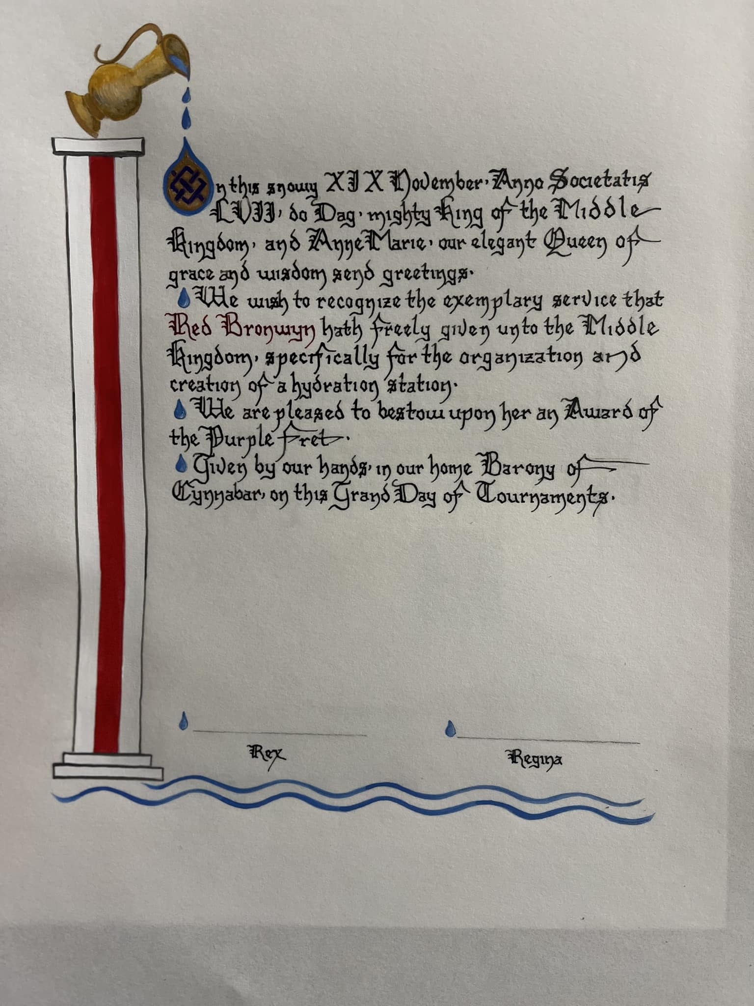 The SCA has a tradition of the giving of illuminated manuscripts for their awards. (The Middle Kingdom - Midrealm provides a scroll with each award bestowed by the Crown.) Examples of these produced by the hand of Baroness Alianor bat Asriel (known as Lady Aliyah) and The Honorable Lady SaehildR barngodR are below: