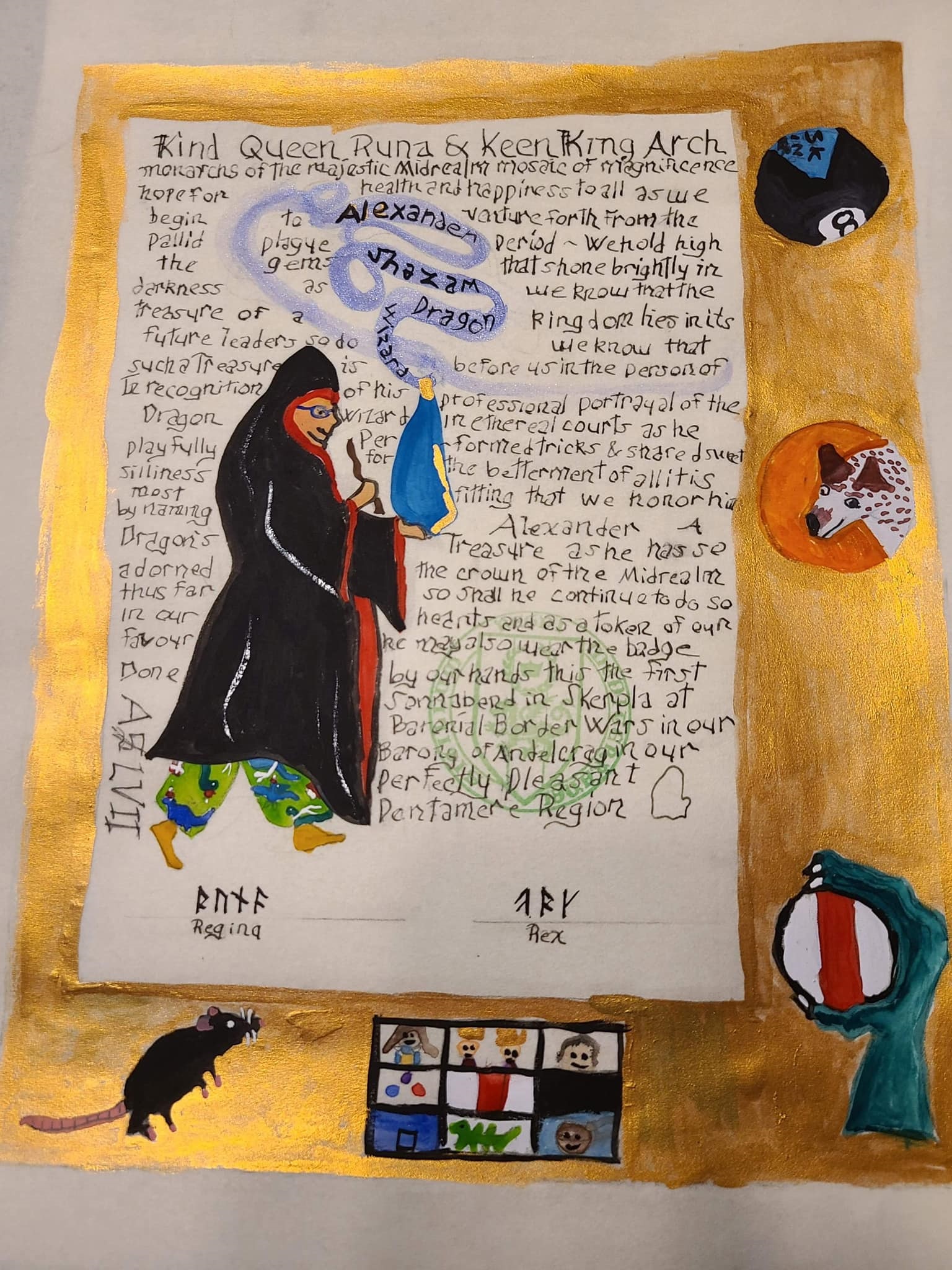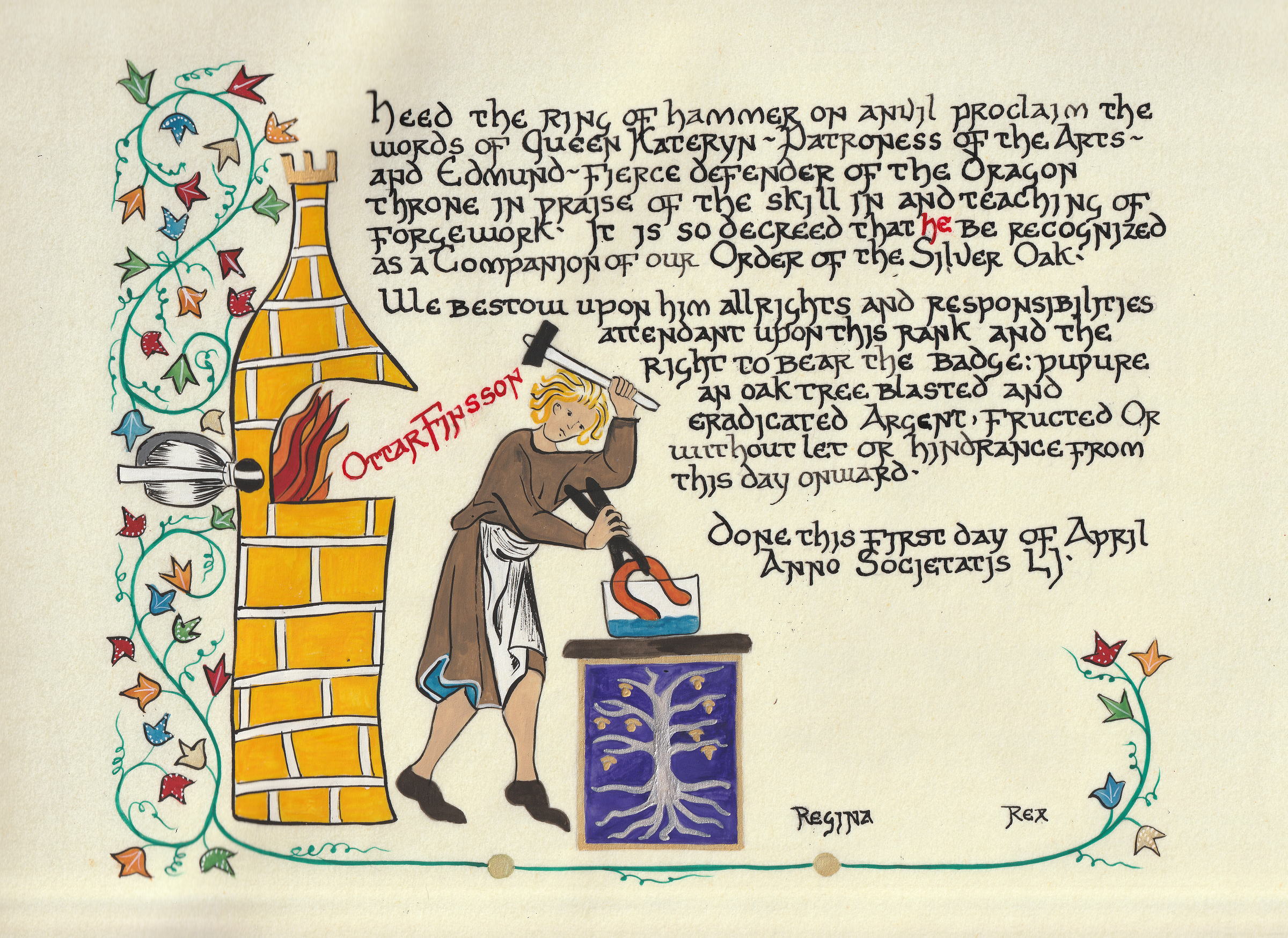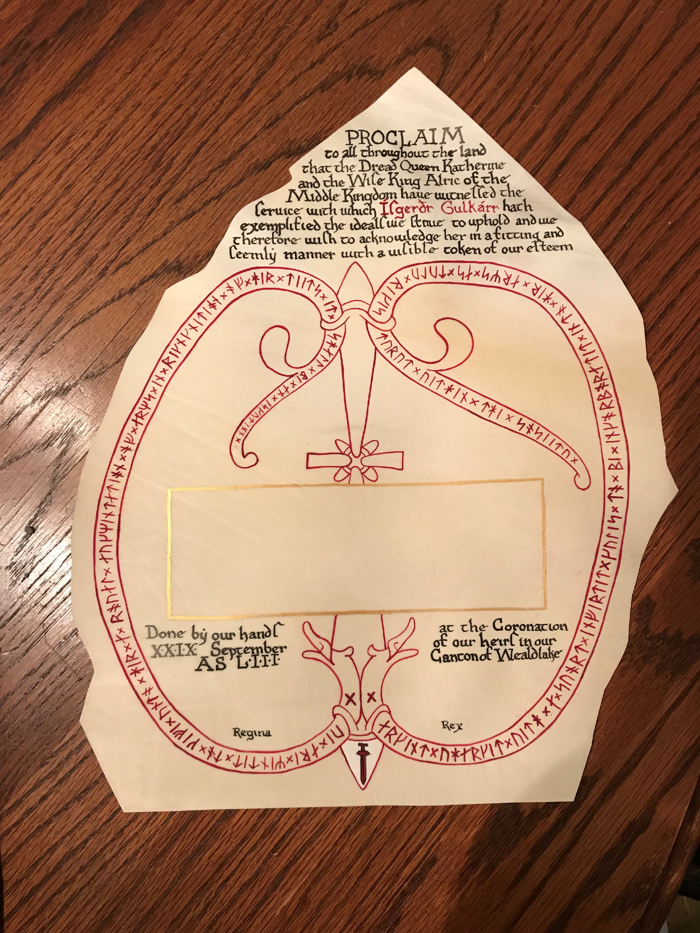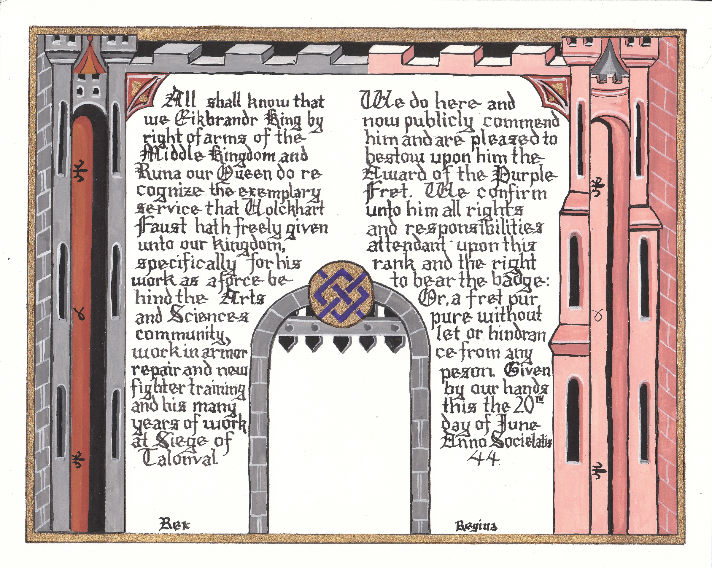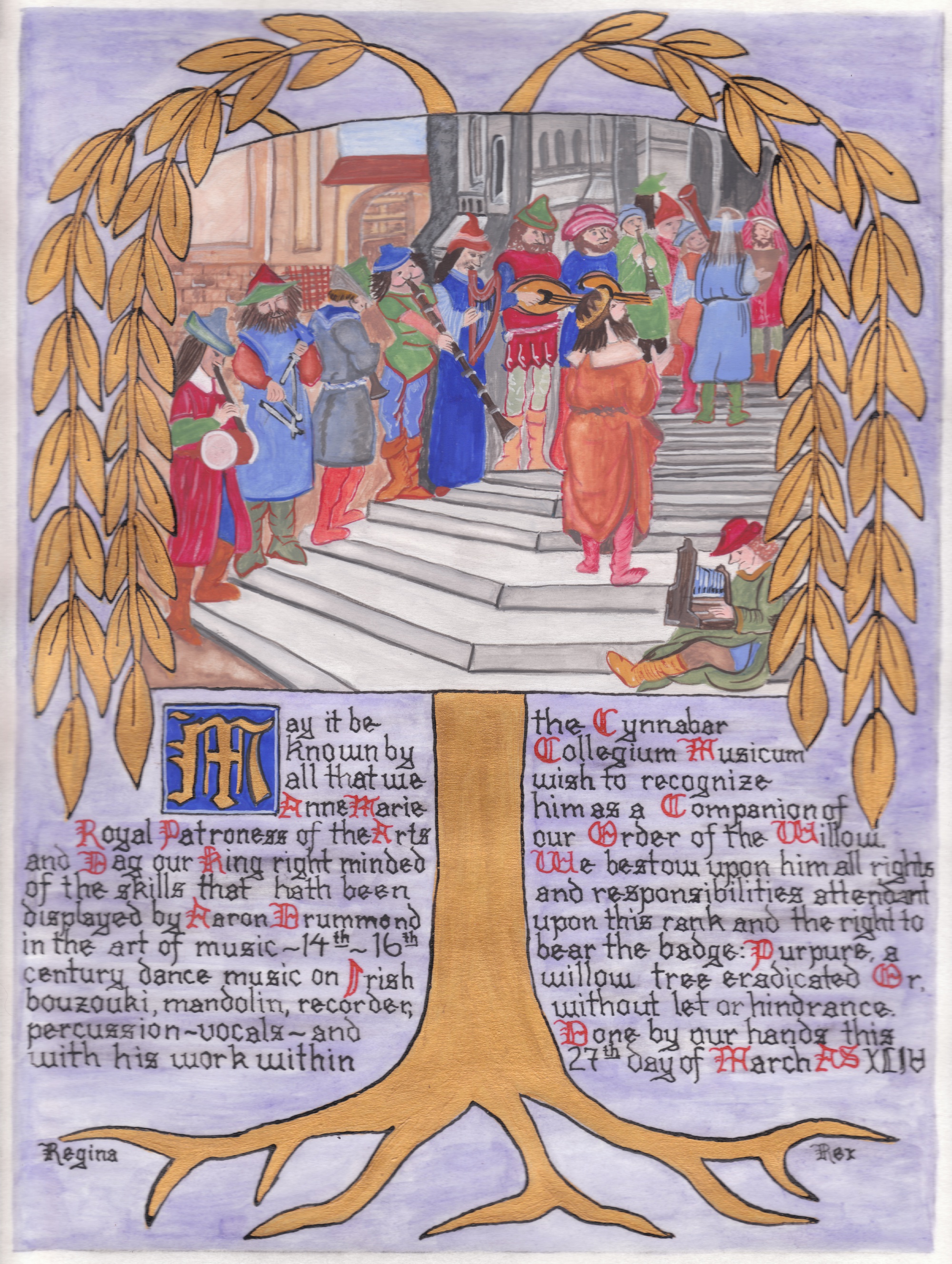 The SCA has a tradition of the giving of illuminated manuscripts for their awards. (The Middle Kingdom - Midrealm provides a scroll with each award bestowed by the Crown.) Examples of these produced by the hand of Baroness Alianor bat Asriel (known as Lady Aliyah) and The Honorable Lady SaehildR barngodR are below: