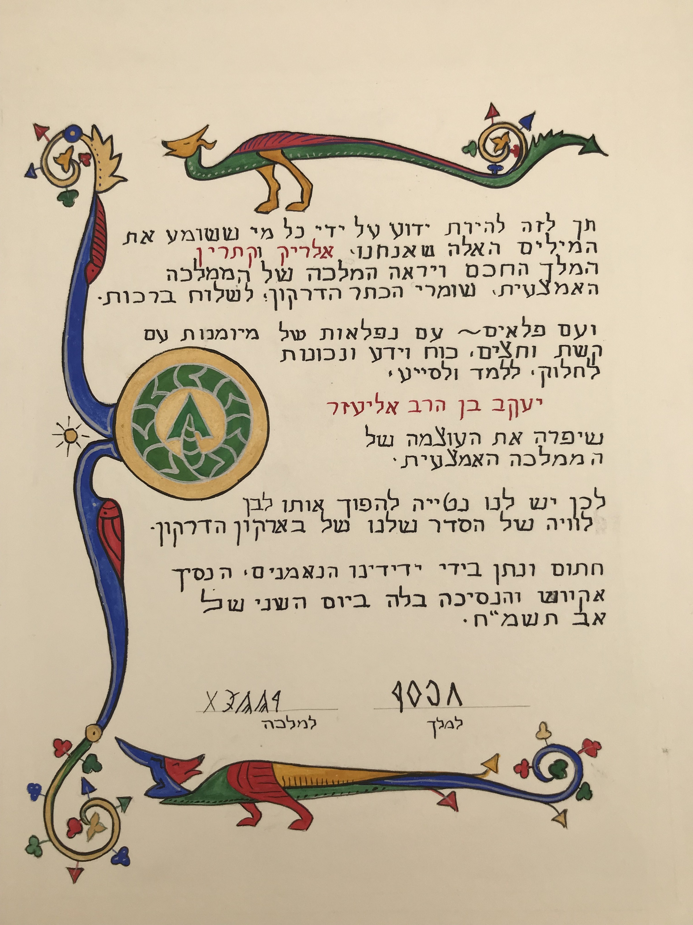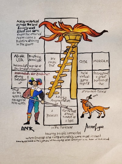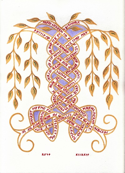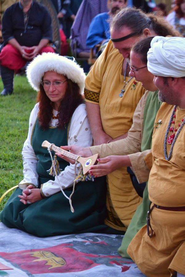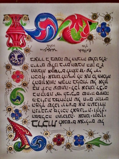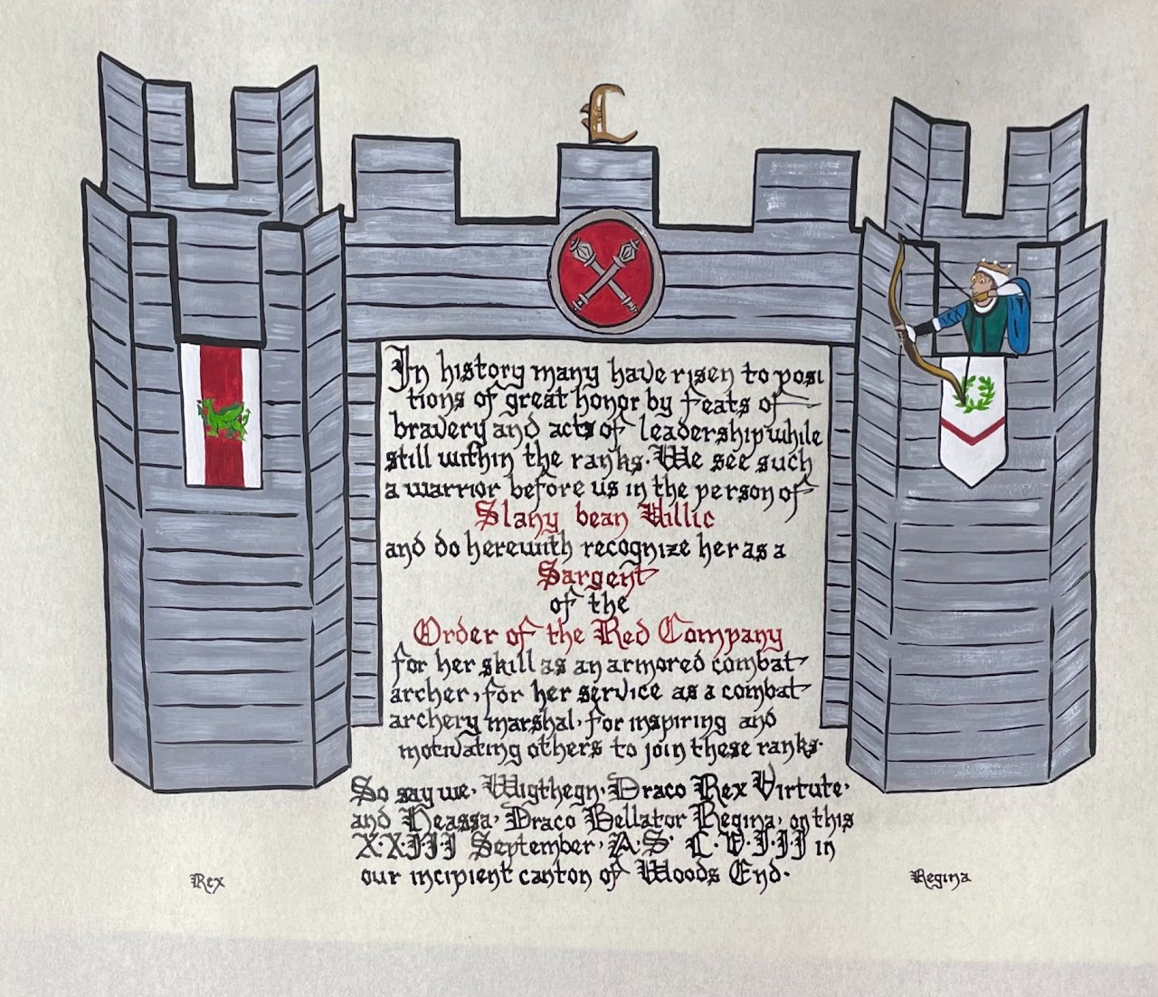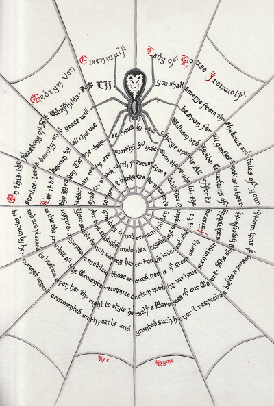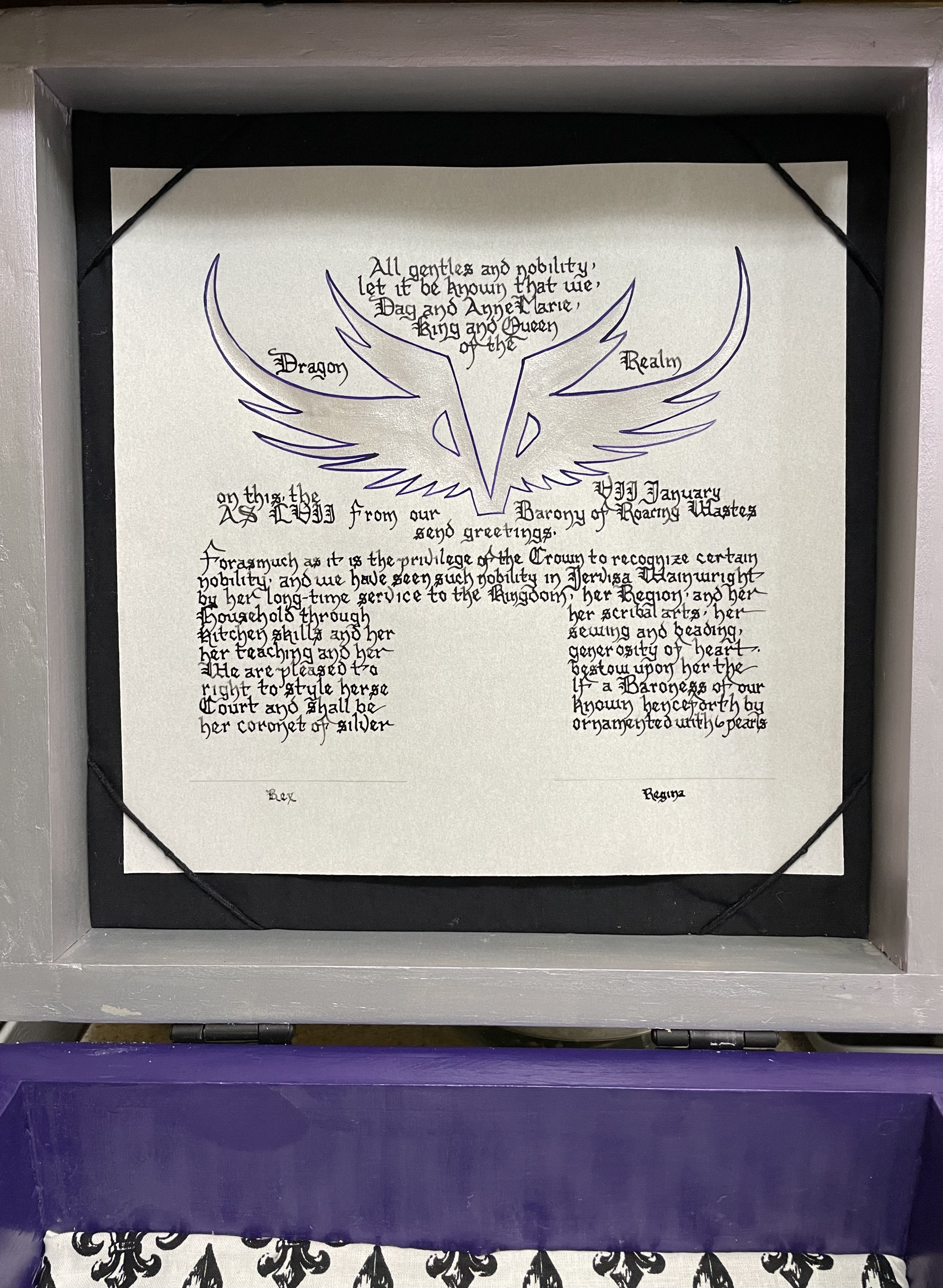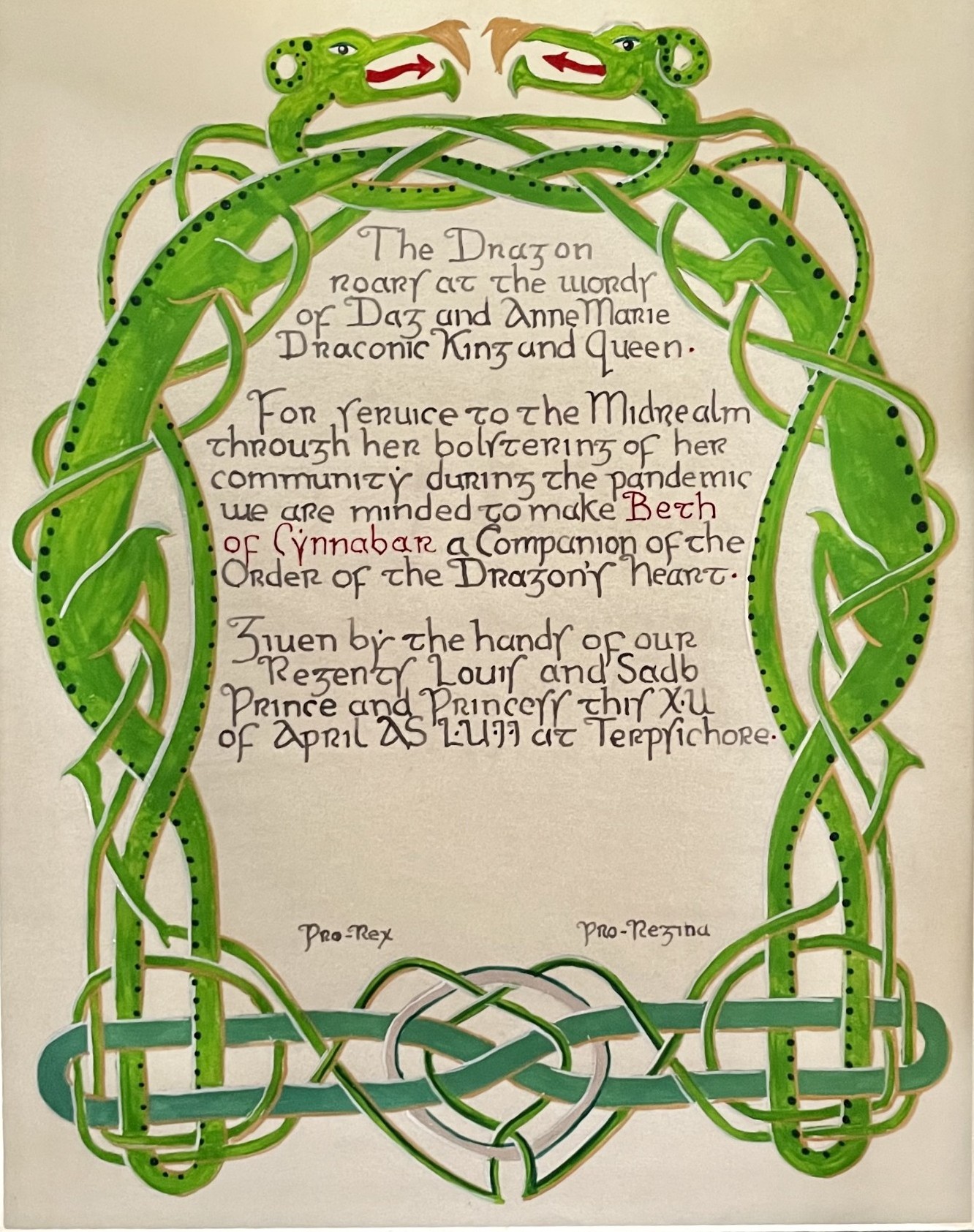The SCA has a tradition of the giving of illuminated manuscripts for their awards. (The Middle Kingdom - Midrealm provides a scroll with each award bestowed by the Crown.) Examples of these produced by the hand of Baroness Alianor bat Asriel (known as Lady Aliyah) and The Honorable Lady SaehildR barngodR are below: