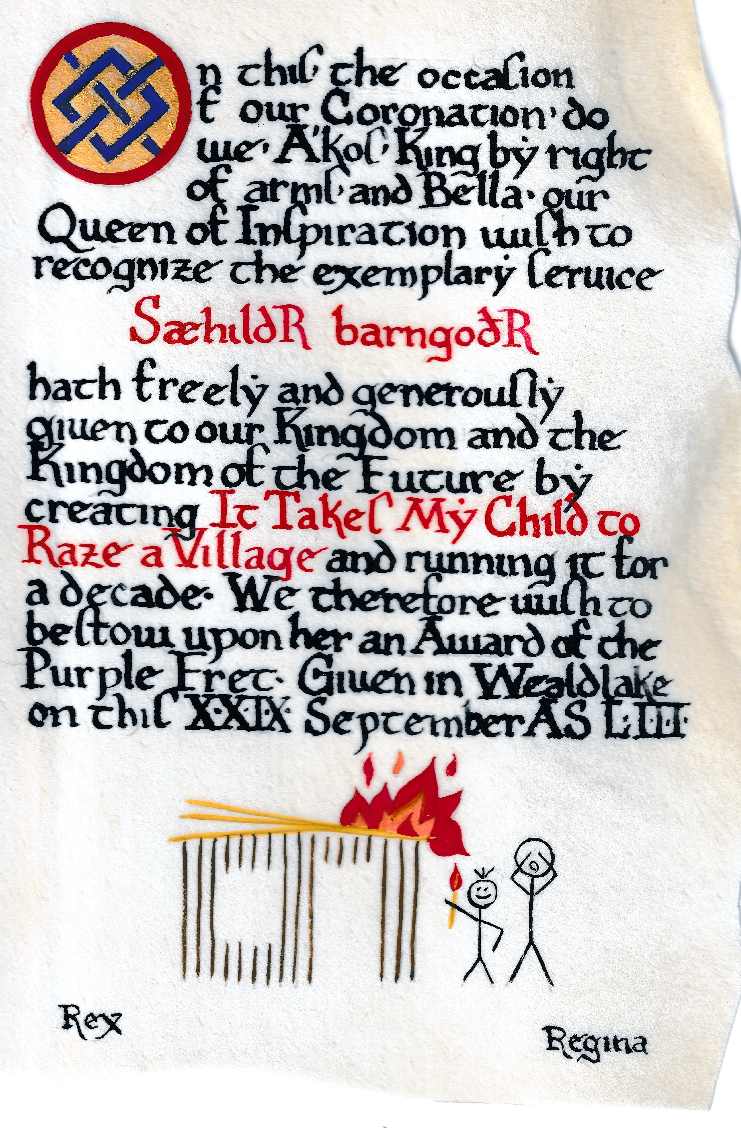Here are links to some examples of the It Takes My Child to Raze A Village award scrolls.