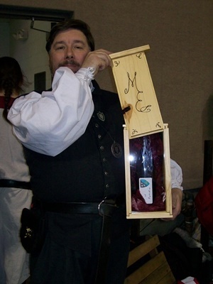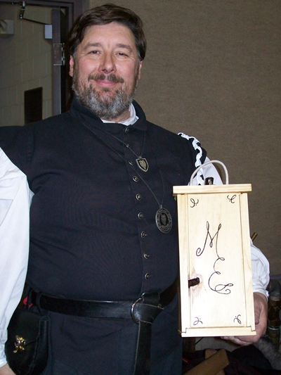 Here is Morgan End Starre, a fellow member of House Ironwolf. He is a merchant ship captain who is a purveyor of "pre-stolen" goods. In addition, he makes cordials based primarily on rum. To showcase his latest creation, I made a special box designed to hold the precious fluid. It has a sliding lid that stores in the back when the bottle is displayed. It also has a clear Plexiglas pane (yes, not medieval, but glass breaks too easily and safety first) that also slides to keep hands from removing the bottle until Morgan decides to allow the bottle to be sampled. It has been able to keep his "prizes" intact through many pitched "supply acquisition encounters" as well as how them off on his mantel (or so his stories relate.) It has his initials burned in by my Lady.