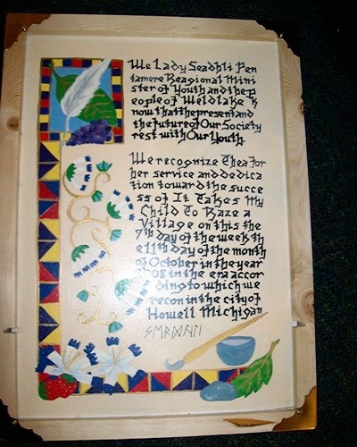 Here is a box for a scribe. The top was done as an illumination scroll by my wife for Lady Thea de Nes as a thank you for her support of It Takes My Child To Raze A Village by providing Illuminated awards for each event winners.
