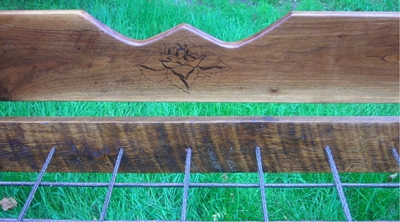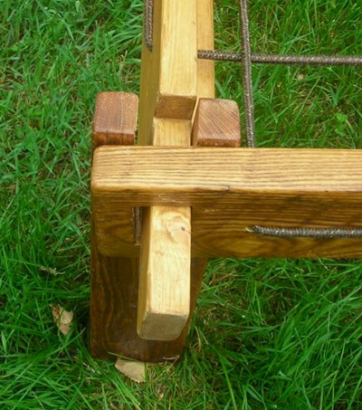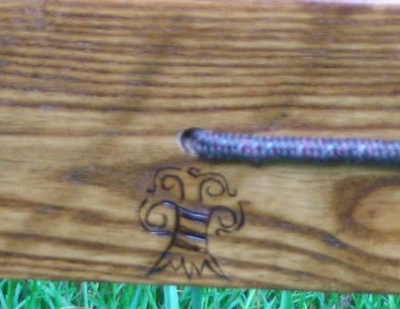 For those familiar with the story of Aliyah and Áindle, this is the bed I made as a result of our marriage. The rope is not medieval, but a cotton poly rope that will not rot or mildew as this is used for camping. A few interesting parts of this bed are from discussion I had at a Balloonfest demo. There was a man making Viking rope beds opposite me. So, the small legs are notched and between the rope boards. The tall legs are also between the rope boards. This is because the tension of the rope will hold the bed together, so there is no need to peg the legs. The ropes are held tight by small pieces of wood with three holes. Aliyah made sure put her rose on the headboard to show it was her bed. She did concede and put a banded tree for me on the footboard. Yes, the artwork is by Aliyah.