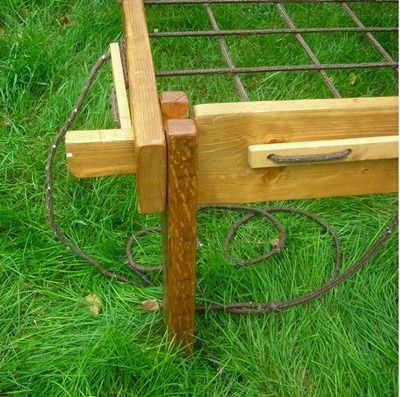 A picture of part of the outdoor furniture set I made for my wife as her anniversary present - the cottage table, two of the three walnut benches, the 2 X-chairs with the footstool. (The wood in the foreground is for the rope bedframe for our wedding bed -pictures above.)