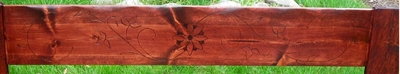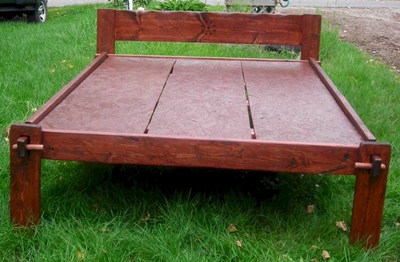 Here is the bed my friend commissioned. This was a bed for her, so it has the matching artwork to her chair and bench. This bed is a pegged platform bed. Instead of several boards from headboard to footboard, she requested a few boards so there would be less to lose. Plywood is used for the platform base. The bed is all pine for light weight. The artwork was by my wife.