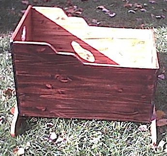 A "baby box" I made for a friend in 2006, based on designs going back to Roman times. One feature of this design is the ability to rock the cradle with one foot without fear of tipping, as the wide rocker bars only allow a tip of 2 inches. It was a surprise to see WOOD magazine, Issue 178, September 2007 had a similar cradle on their cover with an article on the Heirloom Cradle . It is a good representation of this timeless classic, and has the added benefits of a break down design, a case for storage, with full size plans of the rockers so you do not have to devise the curve yourself, as did I.