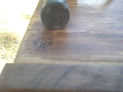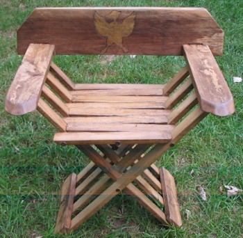The folding or X-chair I made from oak for myself. The duck is from my personal cognizance or heraldic device. These embellishments were put on by my wife and daughter.