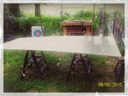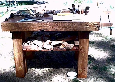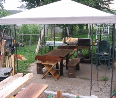 Where do I do the work? I work outside when it is warm. Here is the work table I made for myself and some of the tools I used to make many of the items you see above: