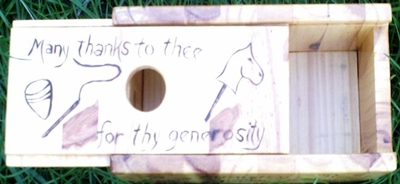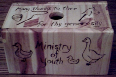 The Minister of Youth for our Canton at the time this was constructed (my daughter, former Pentamere Minister of Youth, former current Dean of Page School, current Kingdom Minister of Youth) needed a donation box. She came to Banded Tree™ and commissioned a box. This has the sliding lid so if the box is knocked over - everything does not fall out. The design incorporates the Minister's personal cognizance. The design and wording all are by my wife and daughters.