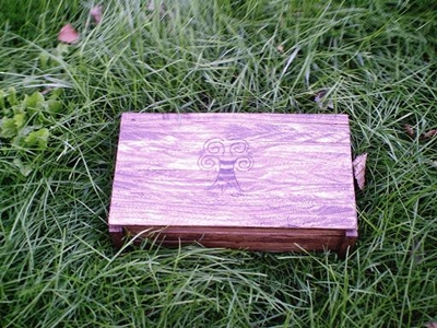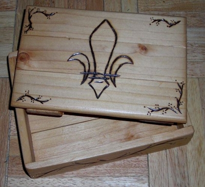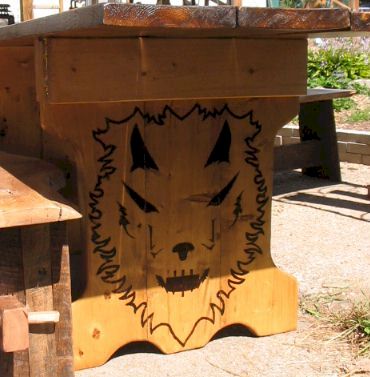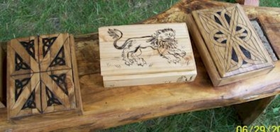 I am indebted to my family for putting up with the mess outside as I work on these projects, and for their assistance in producing the artwork on the pieces. I craft a piece and sand it ready for decorating. My wife or daughter then decorates it with wood burning or ink art to add the finishing touches (see the wolves burned into the Ironwolf table, chair arms and backs, the boxes, etc.) The piece is then stained and protected with a "poly" finish.