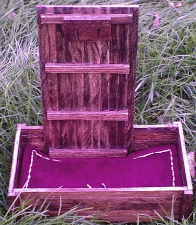 Here are some pictures of small boxes I have made. The first is the box for my wedding to Aliyah on June 24, 1281 (as reckoned by the SCA) at the Medieval Village Demonstration put on by the Canton of Wealdlake for the Michigan Challenge Balloonfest in Howell, MI. The design is an original made by my daughters for their parents wedding (see the Áindle and Aliyah website for details). The lining is by my wife. The second was for the boyfriend (later husband) of one of my four daughters. These are examples of the over 30 different designs my wife and daughters have made for the boxes.