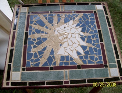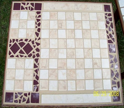 The latest addition to my woodworking are the gaming tables. These are tiled by my wife and daughters. The last two are tables for the Barony with its device and our canton with its device.