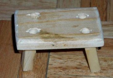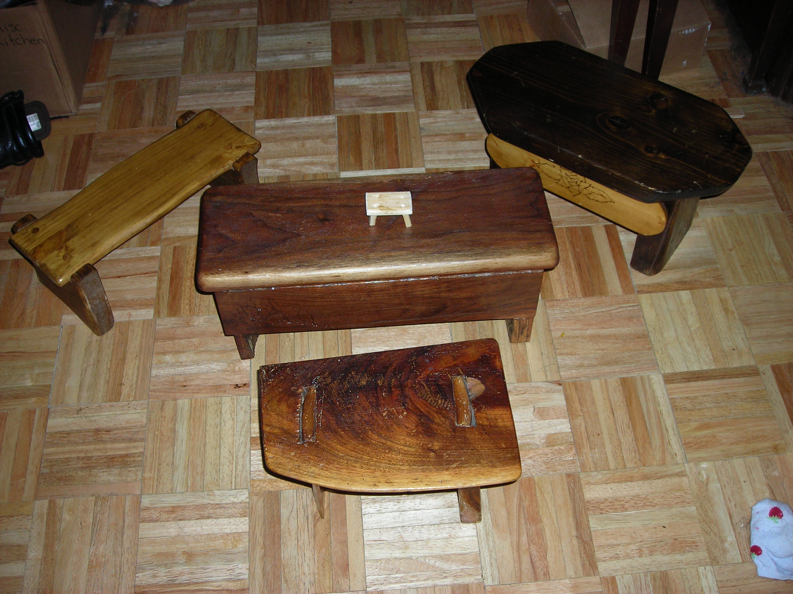 Benches come in different styles - and I have 4 daughters. As you can see here, I make benches in different styles and sizes (4 of a size that can be sat on by daughters.) The 3rd picture is a very small bench, the 4th picture shows its size in comparison to a pair of cat's paws (beware the Imp), and the last is a grouping of the different benches on this page to give a idea of relative sizes.