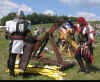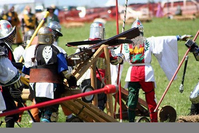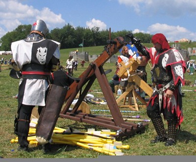 Combat archery is used in conjunction with field combat in battle situations. This requires restrictions on power or poundage of the recurve bow, and arrows of a safe design to hit men in armor. Trebuchets, ballistas, and catapults are included in this class as siege weapons. Here are pictures of ballistas.